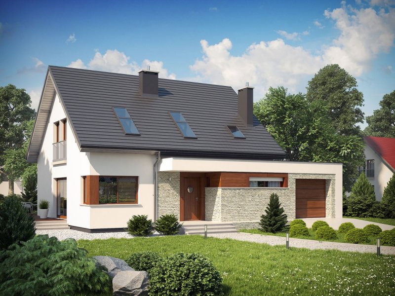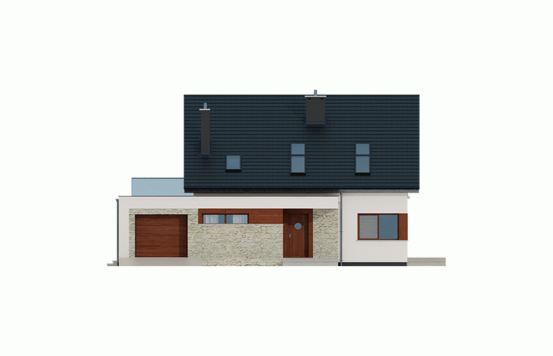 - Elewacje: tynk cienkowarstwowy mineralny i łupek kamienny oraz na fragmentach okładzina drewniana