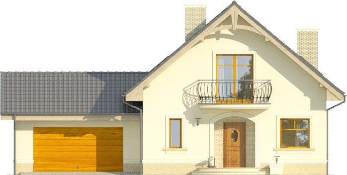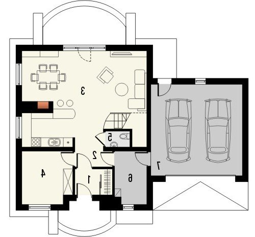Projekt domu piętrowego z garażem na dwa auta. Parter zajmuje pokój dzienny z jadalnią, otwarta kuchnia, dodatkowy pokój, wc i pomieszczenie gospodarcze. Na piętrze znajdziemy aż 3 wygodne sypialnie, garderobę dla jednej z nich i przestronną łazienkę.