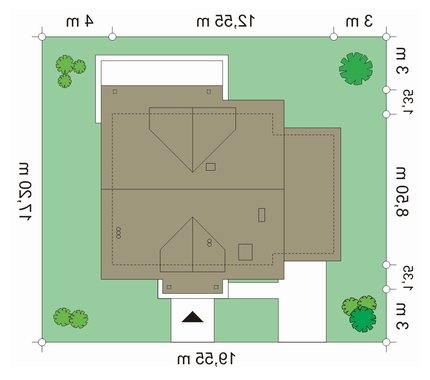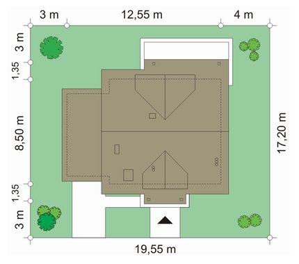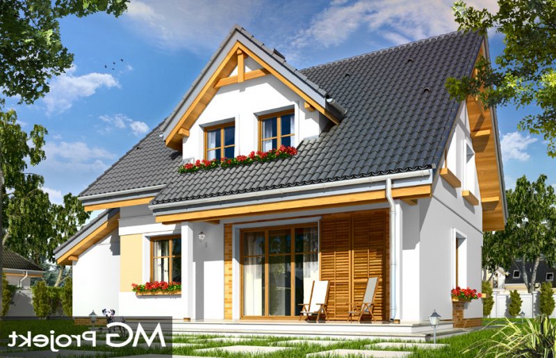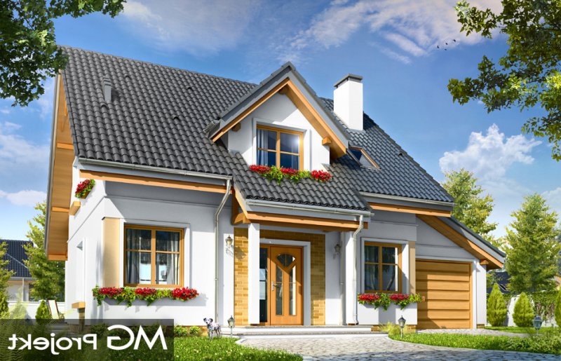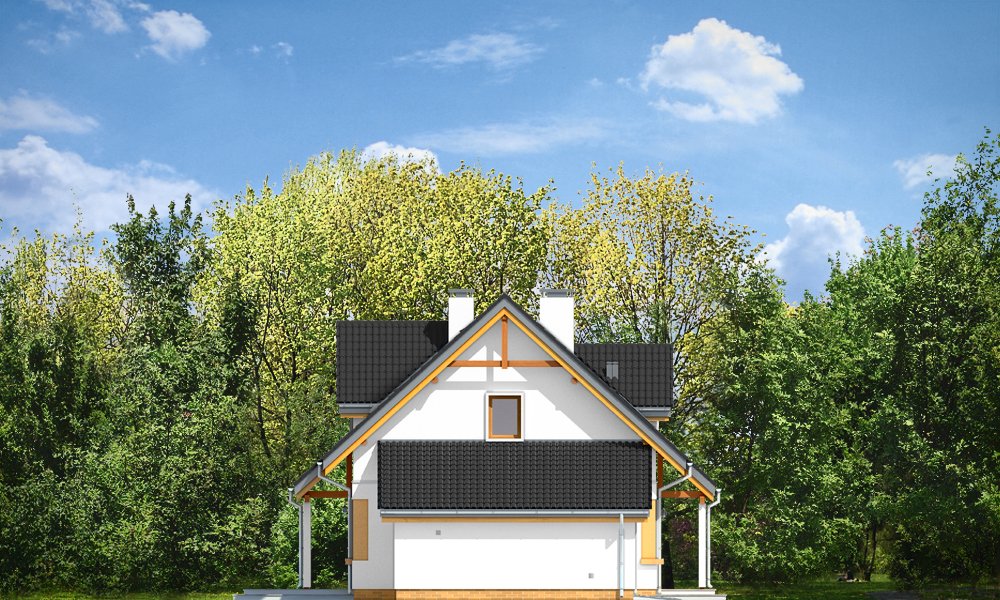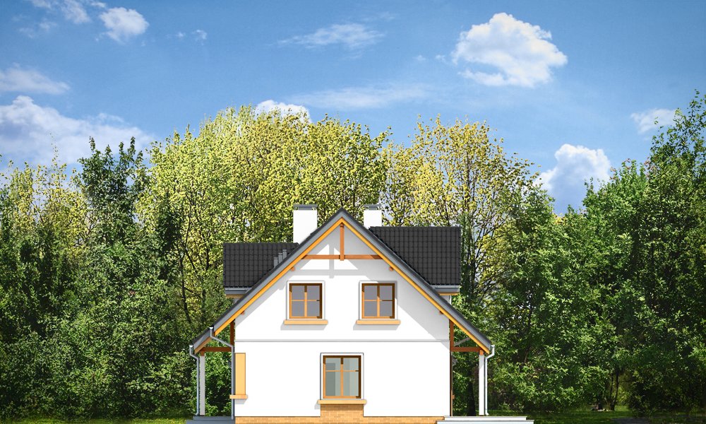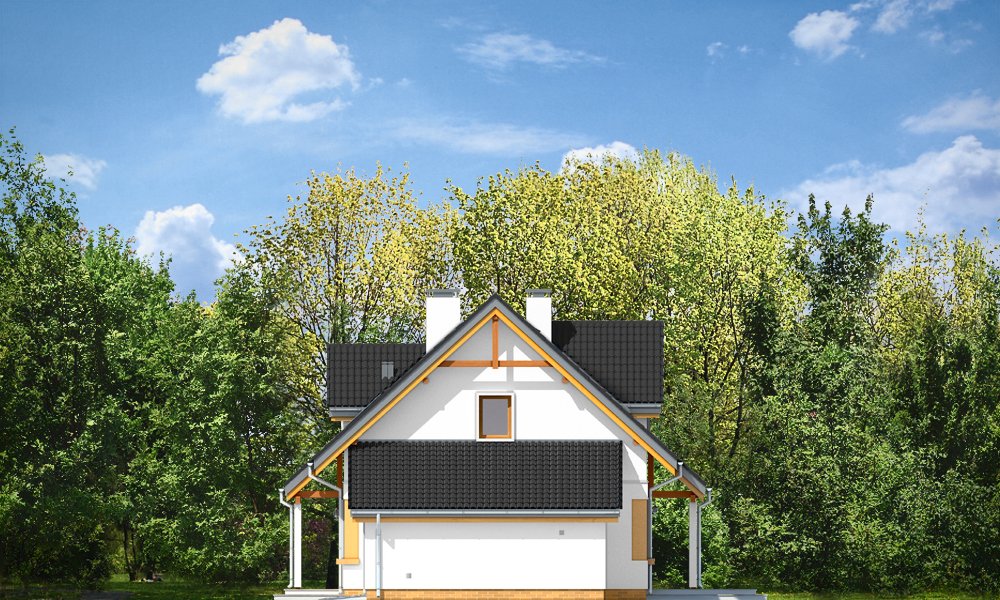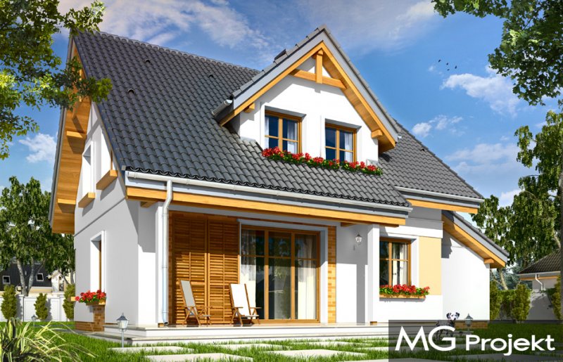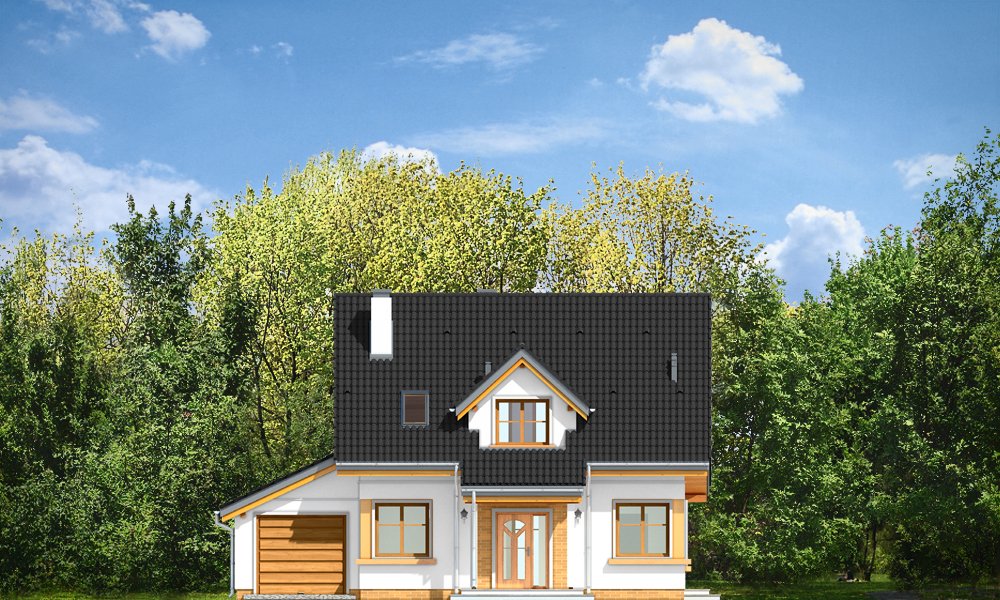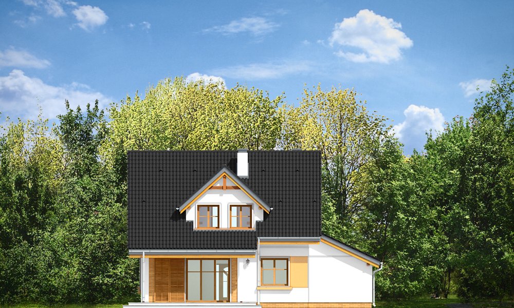 Spokojny to dom jednorodzinny dla rodziny 4-5cioosobowej parterowy z poddaszem użytkowym, przekryty dwuspadowym dachem, z dobudowanym garażem. Ten niewielki domek ma w sobie wszystko to, czego potrzeba do wygodnego mieszkania każdej rodzinie. Jego wygląd zewnętrzny, tradycyjny styl architektury – potęgują wrażenie solidności o trwałości. Dzięki swojej stylistyce niewielki budynek wydaje się być większy i bardziej reprezentacyjny. Wejście do domu podkreślono ładnym zadaszeniem wspartym na bocznych kolumienkach. Szerokie przeszklone drzwi z bocznym naświetlem zapraszają do wewnątrz. Elewację frontową ozdabiają narożne okna, oraz lukarna w dachu znajdująca się symetryczne nad wejściem. Od ogrodu mamy piękne szerokie drzwi balkonowe, z których można wyjść salonu wprost na częściowo zadaszony taras. Wnętrze domu podzielono na części dzienną, sypialnie, oraz część gospodarczą. Na parterze połączone pomieszczenia salonu, holu i półotwartej kuchni tworzą przestrzeń dzienną. Trochę z boku znajduje się dodatkowy pokój, który może być sypialnią lub gabinetem, łazienka i schody na poddasze. Z holu wchodzimy również do kotłowni i garażu. Na poddaszu zaprojektowano trzy wygodne sypialnie z wbudowanymi szafami, oraz łazienkę. W dwóch sypialniach można zamienić szafy na niewielkie garderoby. Dom ma prostą konstrukcję, łatwą i niedrogą w budowie. Dzięki zwartości bryły, energooszczędnym rozwiązaniom i niewielkiej kubaturze, będzie tani w późniejszym utrzymaniu. Pracownia posiada także odbicie lustrzane projektu.