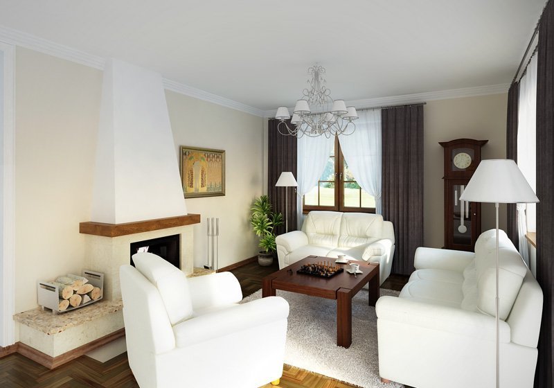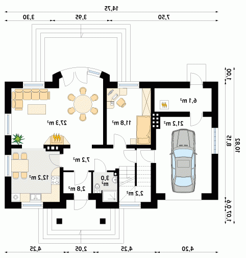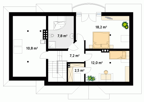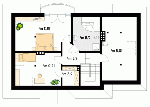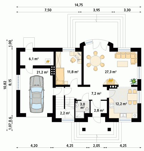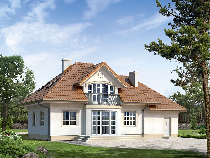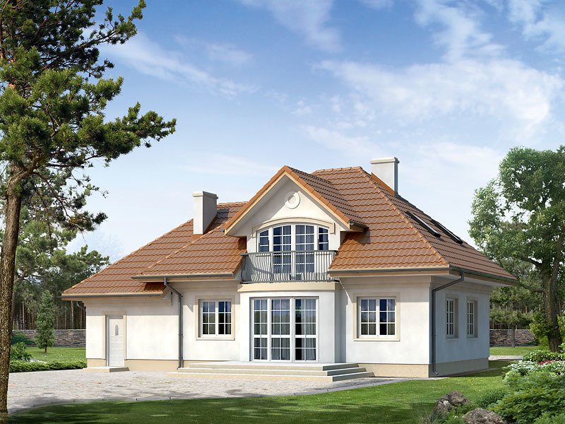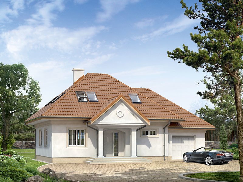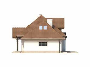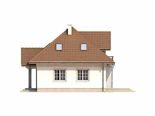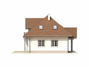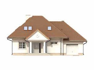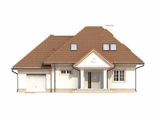 Parterowy dom jednorodzinny z użytkowym poddaszem i jednostanowiskowym garażem. Na parterze znajdują się: przestronny pokój dzienny z wydzieloną kuchnią, gabinet, garaż i kotłownia. Na poddaszu zaprojektowano dwie duże sypialnie, jedną z balkonem, wygodną łazienkę oraz strych, który można dowolnie zaadaptować.