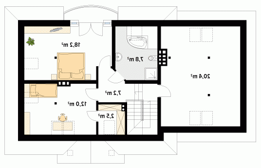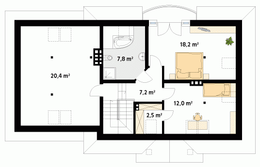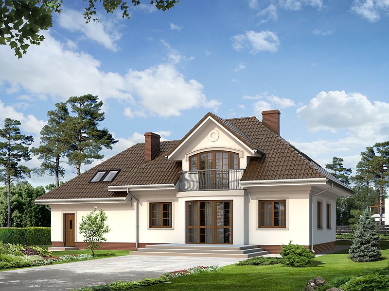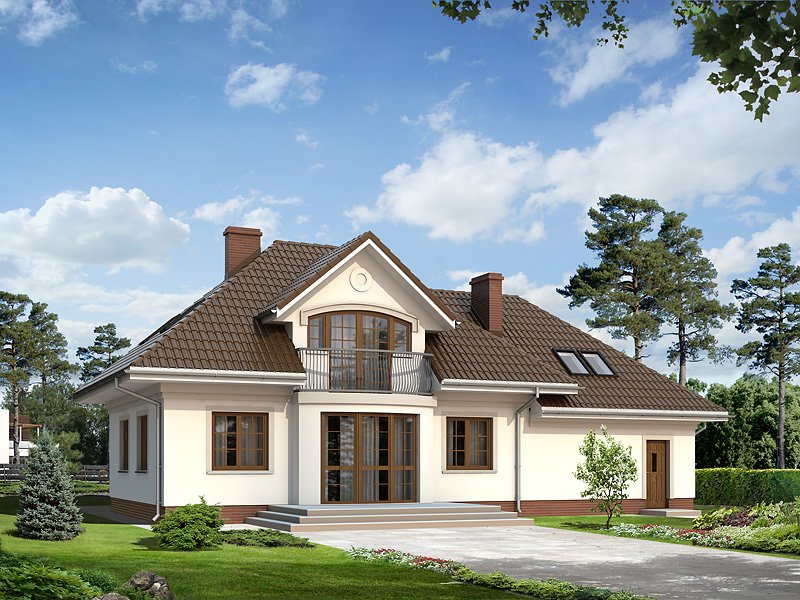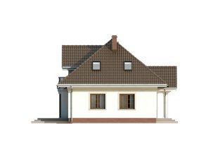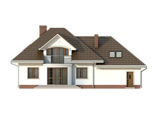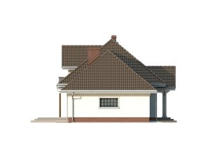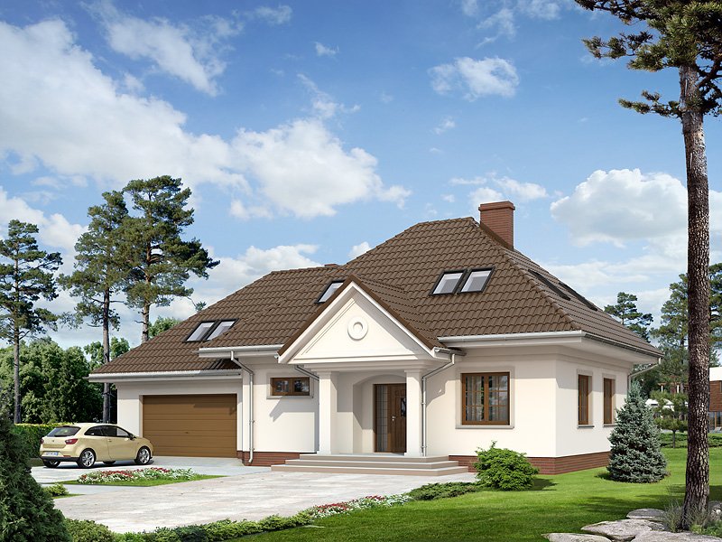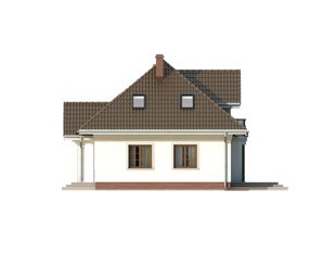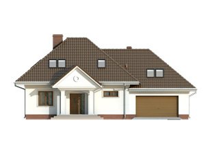 Parterowy dom jednorodzinny z użytkowym poddaszem i dwustanowiskowym garażem. Na parterze znajdują się: przestronny pokój dzienny z wydzieloną kuchnią, gabinet, dwustanowiskowy garaż i kotłownia. Na poddaszu zaprojektowano dwie duże sypialnie, wygodną łazienkę oraz strych, który można dowolnie zaadaptować.