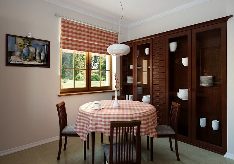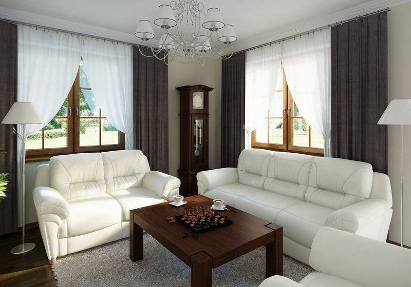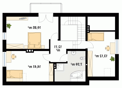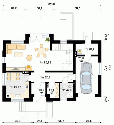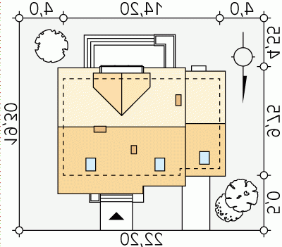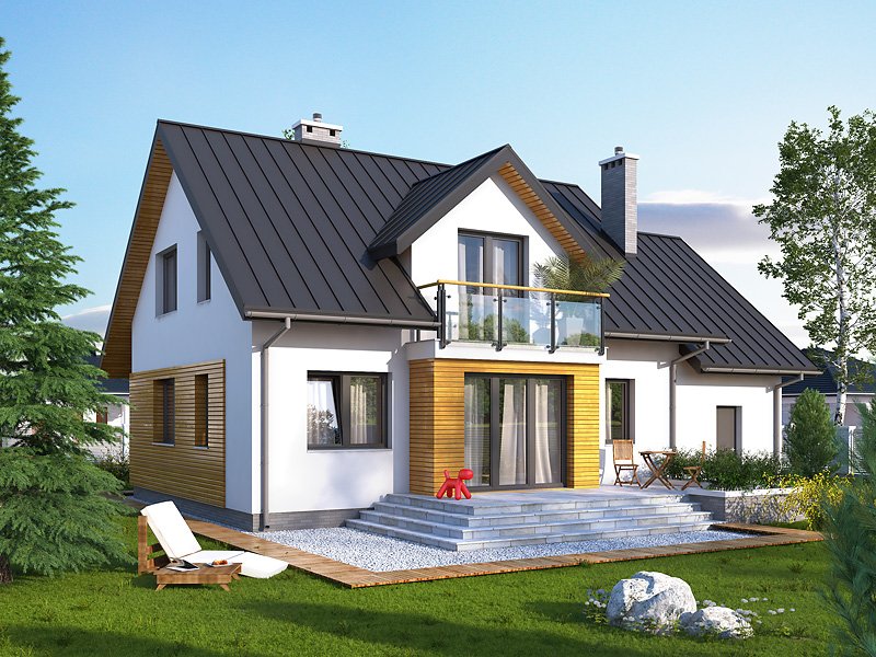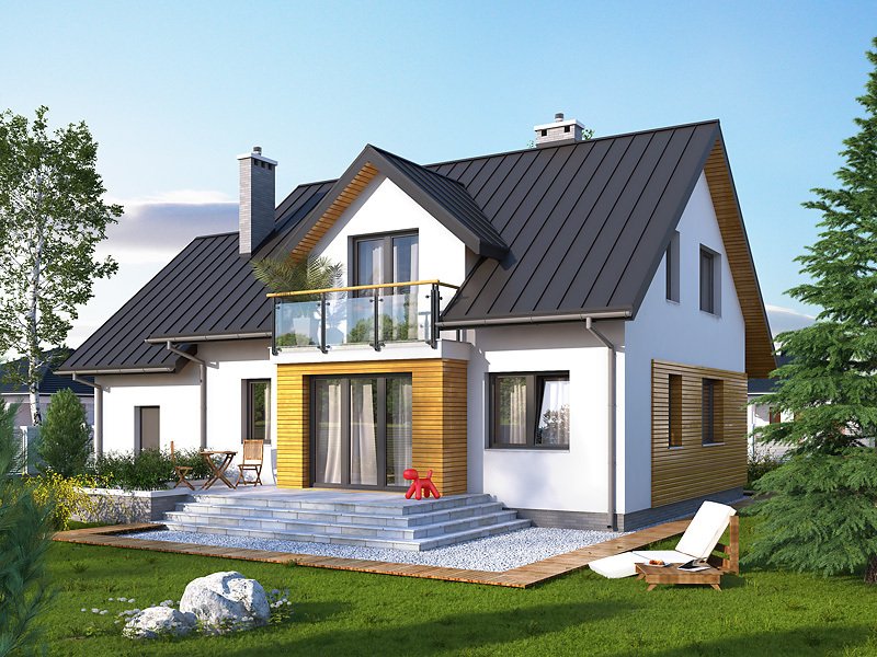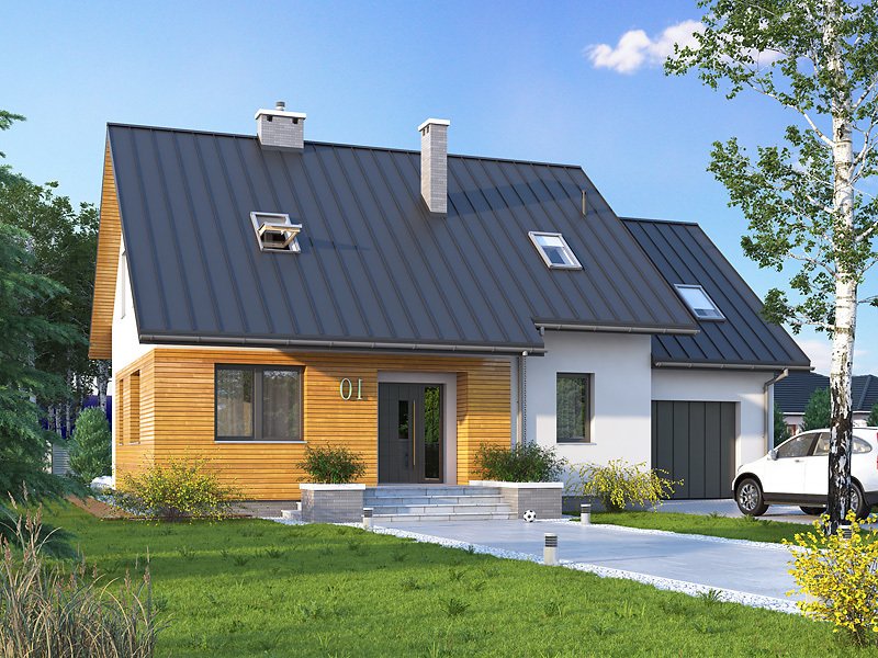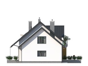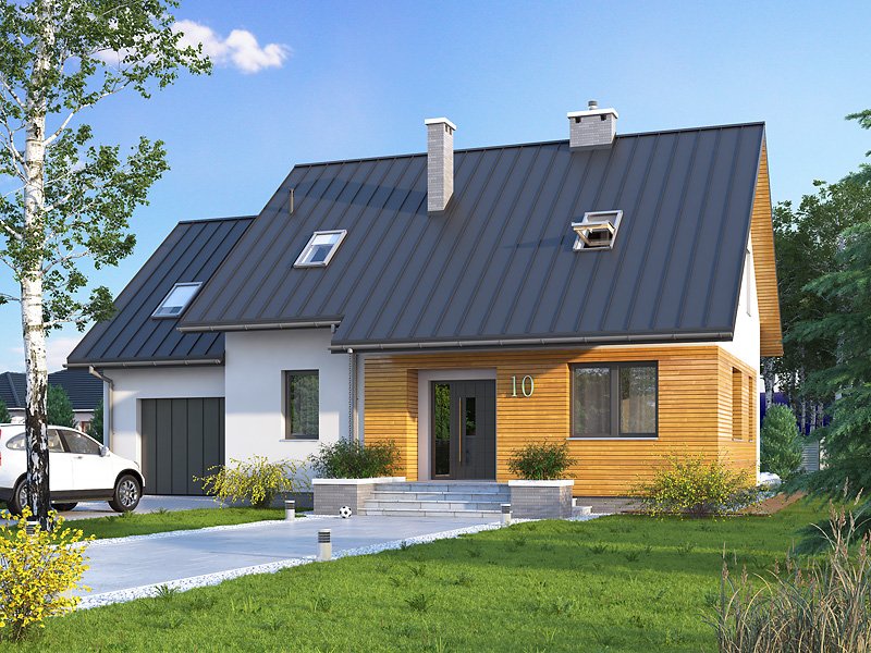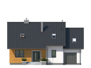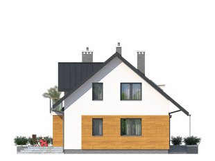 Jednorodzinny budynek mieszkalny z użytkowym poddaszem, przeznaczony dla 4-osobowej rodziny. Na parterze w części dziennej przewidziano przestronny salon z jadalnią. Na niższej kondygnacji domu zaprojektowano kuchnię, garderobę, łazienkę, a w części gospodarczej garaż i kotłownię. Na poddaszu przewidziano trzy sypialnie oraz łazienkę.