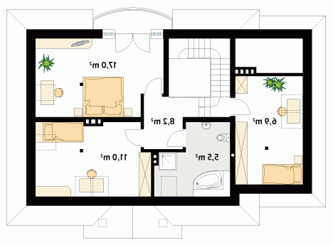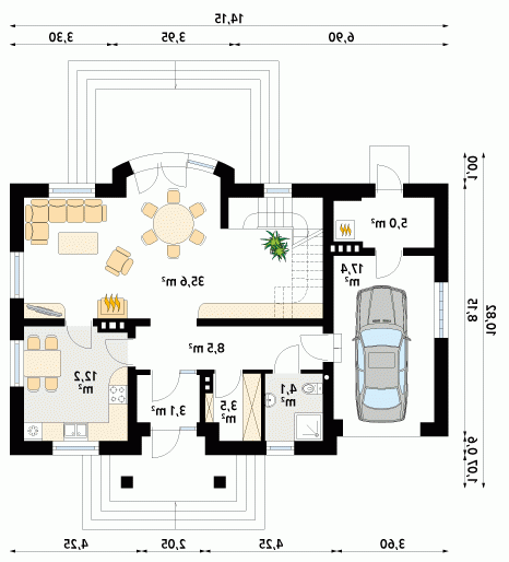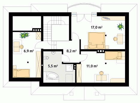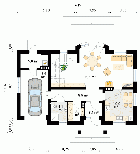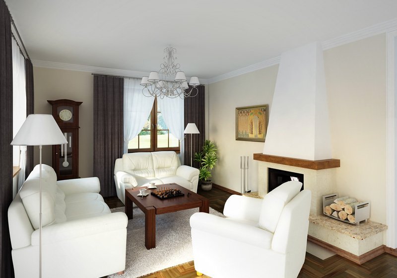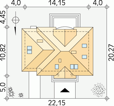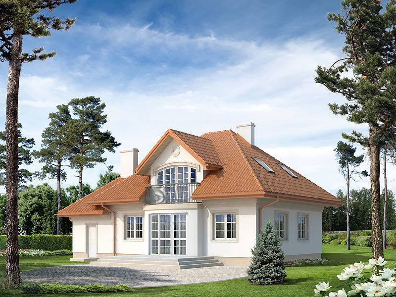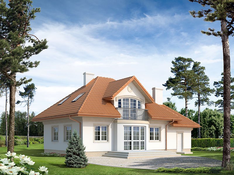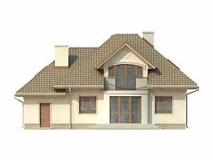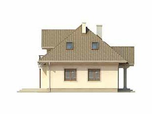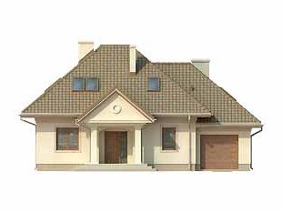 Nieduży dom parterowy z poddaszem użytkowym i jednostanowiskowym garażem. Na parterze zaprojektowano przestronny pokój dzienny, przy którym znajduje się zamknięta kuchnia. Przy wejściu garderoba i nieduża łazienka. Na poddaszu znajdują się trzy sypialnie i łazienka.