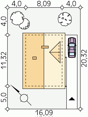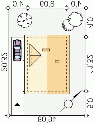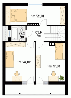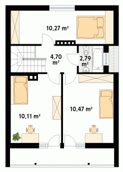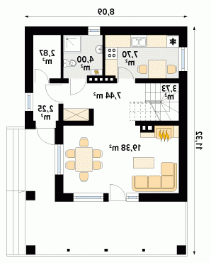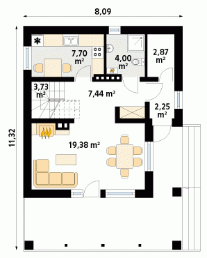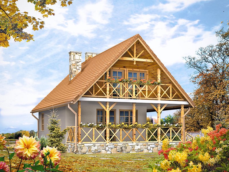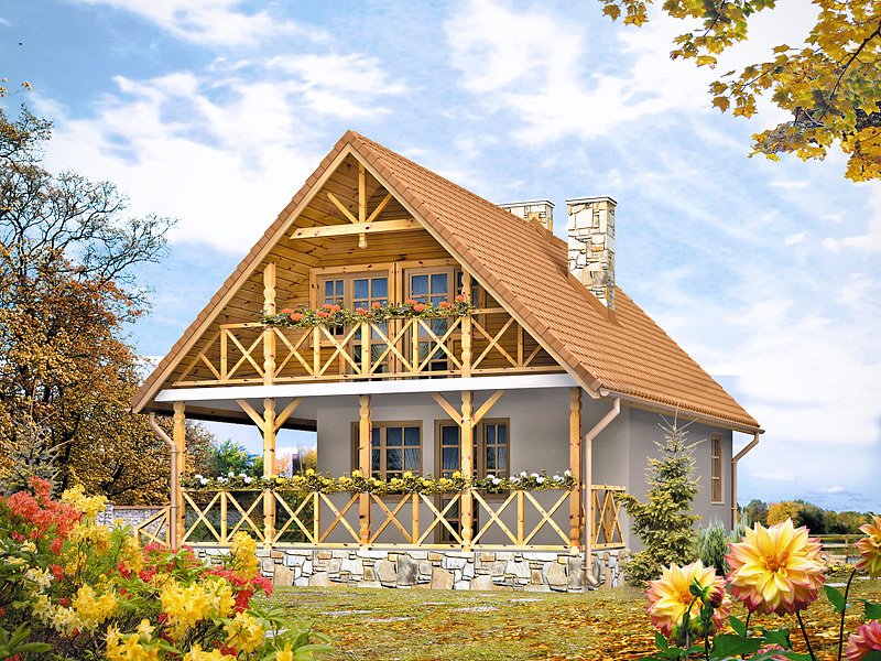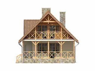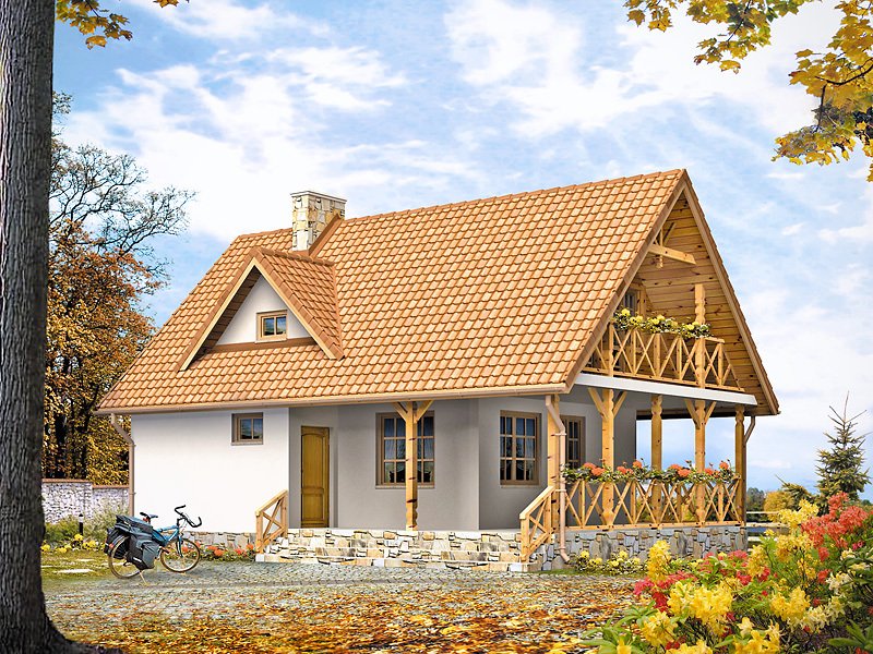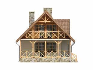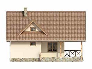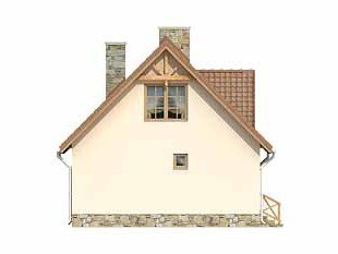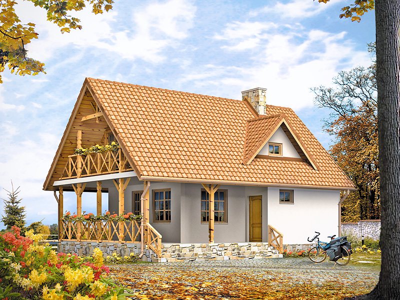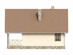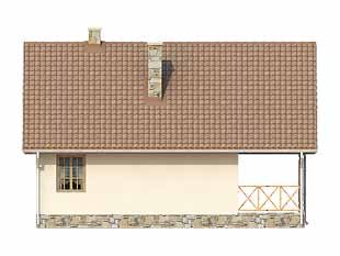 Mały dom jednorodzinny lub letniskowy z użytkowym poddaszem i możliwością podpiwniczenia. Prosty, funkcjonalny układ. Duży taras.