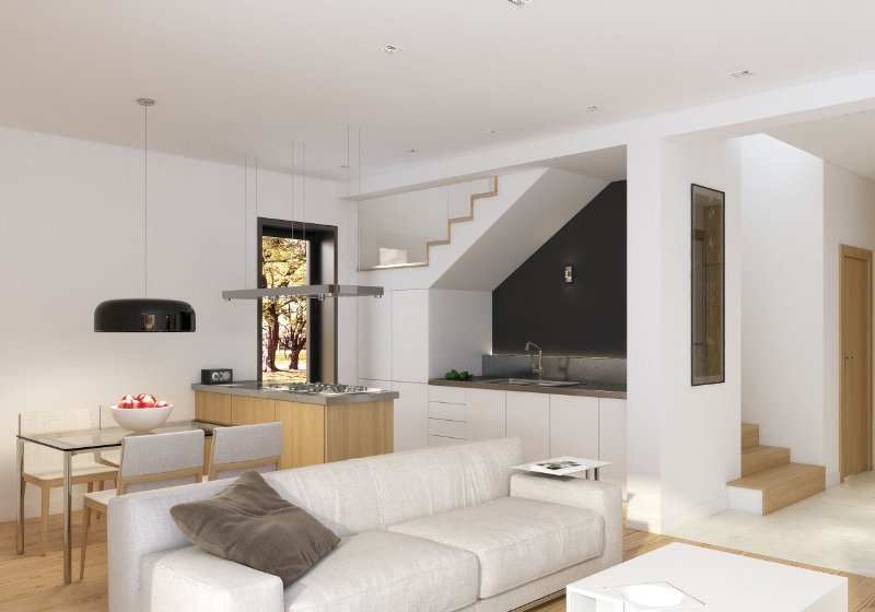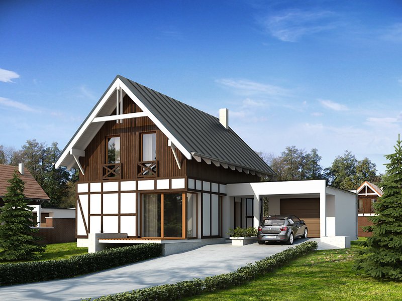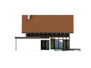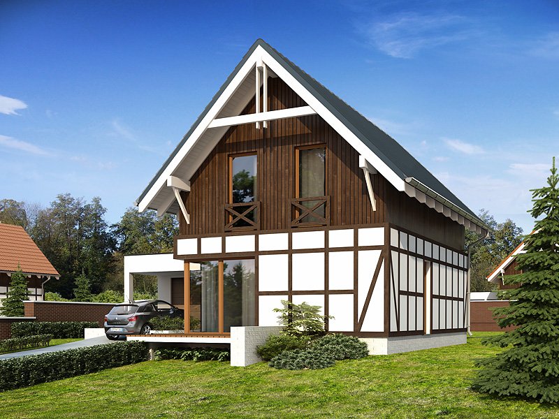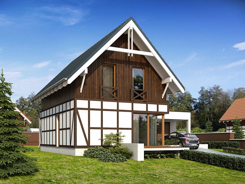 Niewielki dom mieszkalny przeznaczony dla 4-osobowej rodziny. Na stosunkowo niewielkiej powierzchni zaprojektowano bogaty program funkcjonalny. Na parterze znajduje się przestronny salon z aneksem kuchennym oraz duże wielofunkcyjne pomieszczenie gospodarcze, które z powodzeniem może zostać zaadaptowane na kotłownię na paliwo stałe. Na poddaszu znajduje się funkcjonalna łazienka oraz trzy sypialnie. Sypialnia rodziców dodatkowo posiada oddzielną garderobę.