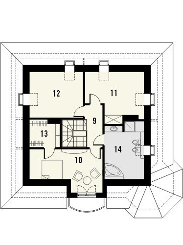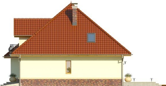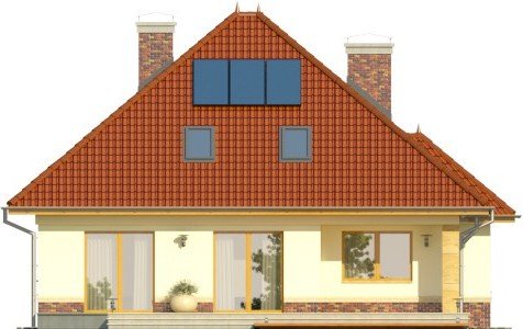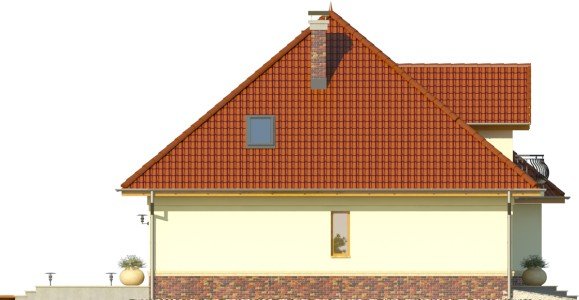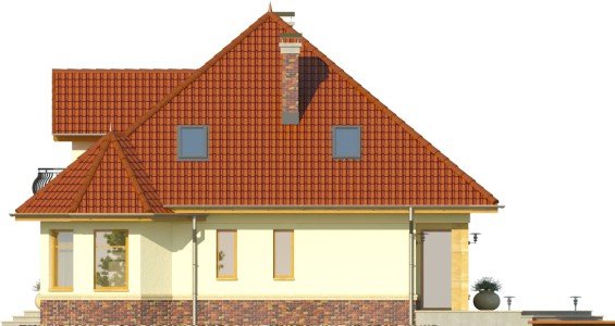 - Elewacje rozwiązane są tradycyjnie, ciekawym elementem dodatkowym w części frontowej domu jest wykusz narożny. Strefa wejściowa wyróżniona jest innym materiałem elewacyjnym oraz wycofana nieco względem elewacji budynku. Od strony ogrodowej zaprojektowano duże powierzchnie tarasowe, częściowo zadaszone.