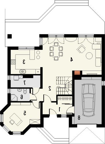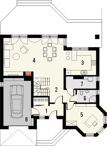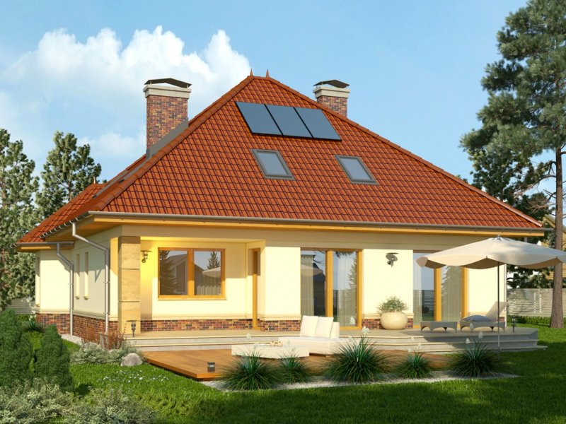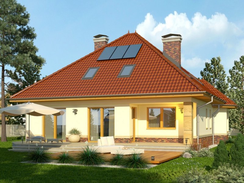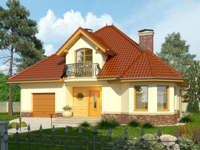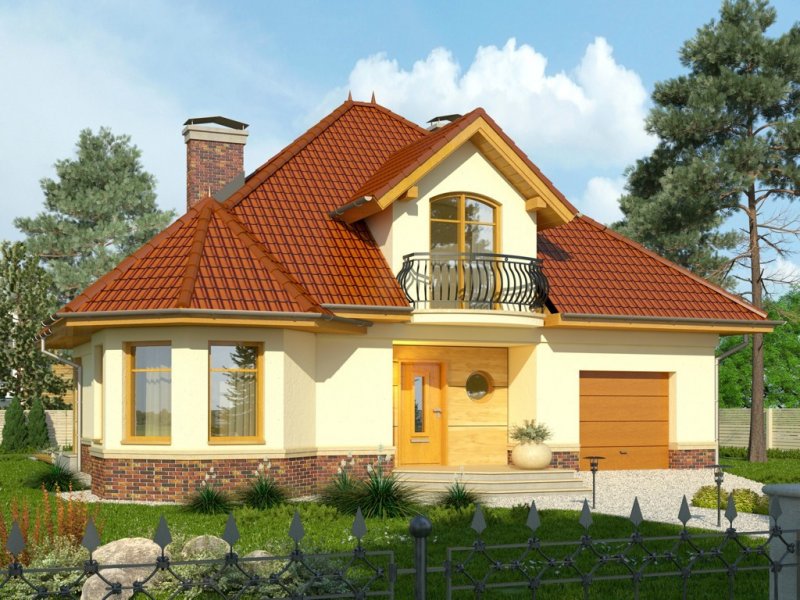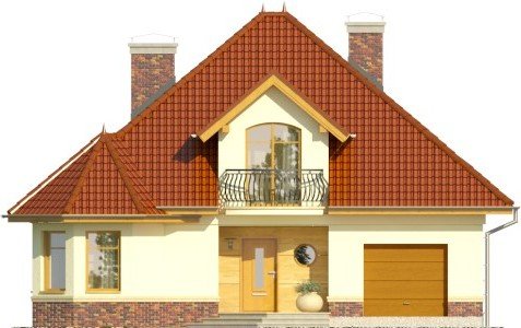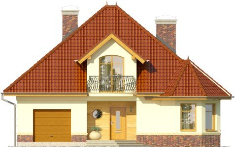 - Dom jednorodzinny, przekryty dachem wielospadowym. W parterze znajduje się salon z wydzieloną jadalnią, która z kolei połączona jest z częściowo otwartą kuchnią. Od frontu zaprojektowano garaż oraz dodatkowy pokój w wykuszu. Ponadto ulokowano tu również łazienkę i pomieszczenie gospodarcze. Na piętrze zaproponowano 3 pokoje sypialne, w tym jeden z garderobą, oraz przestronną łazienkę.