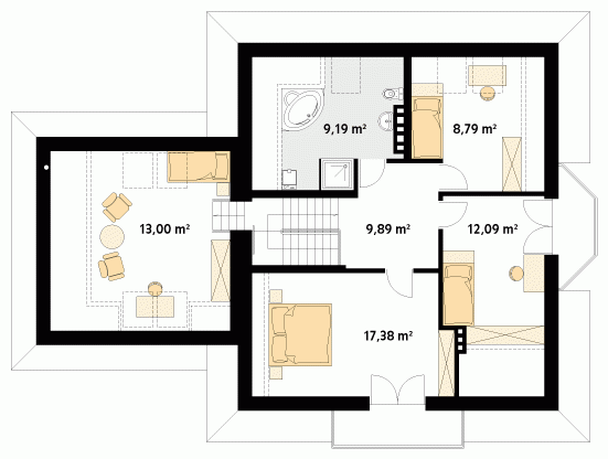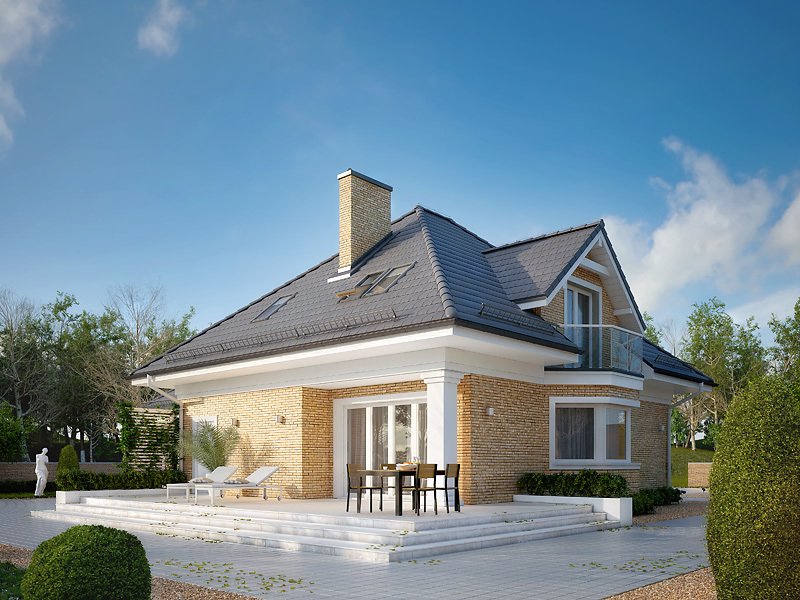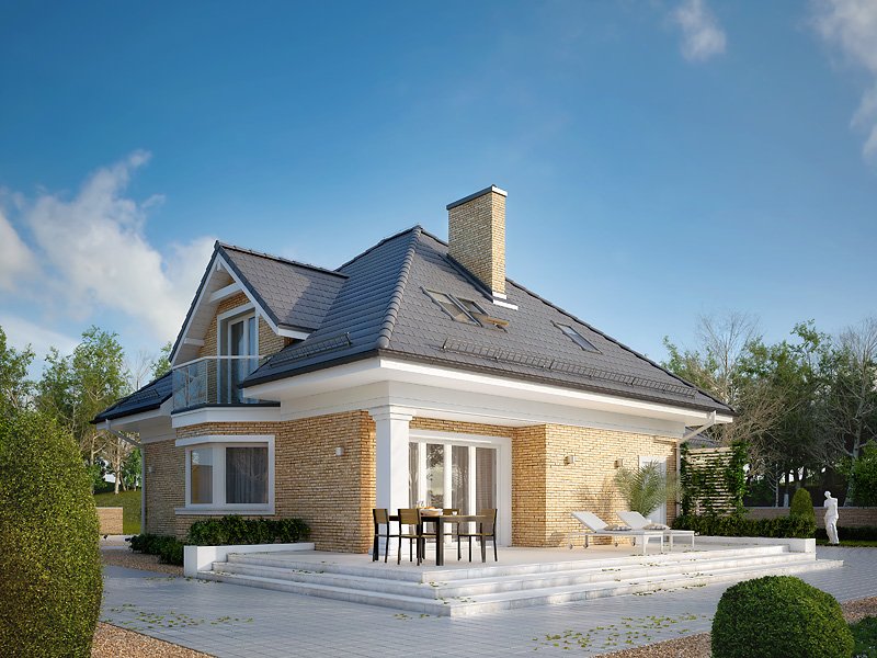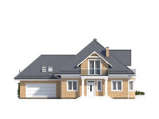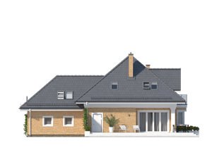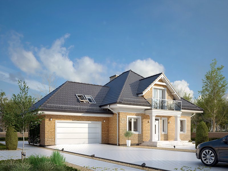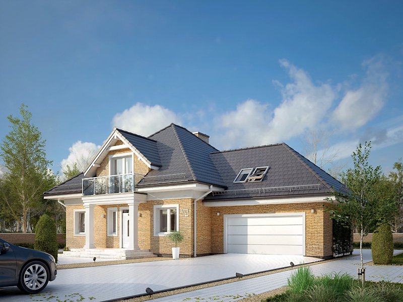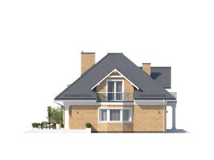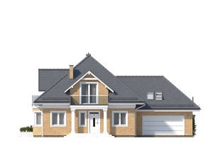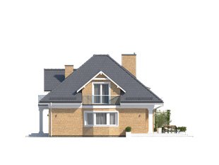 Budynek mieszkalny jednorodzinny z użytkowym poddaszem i dwustanowiskowym garażem. Na parterze znajdziemy część dzienną i dodatkowy pokój na gabinet. Na poddaszu zaprojektowano trzy sypialnie, łazienkę i dużą garderobę nad garażem (z możliwością zaadaptowania na inne pomieszczenie).
