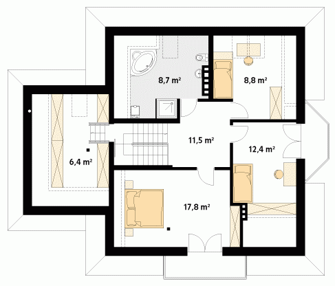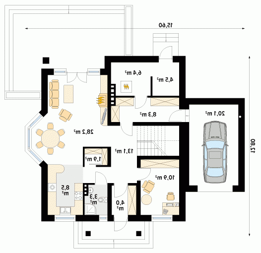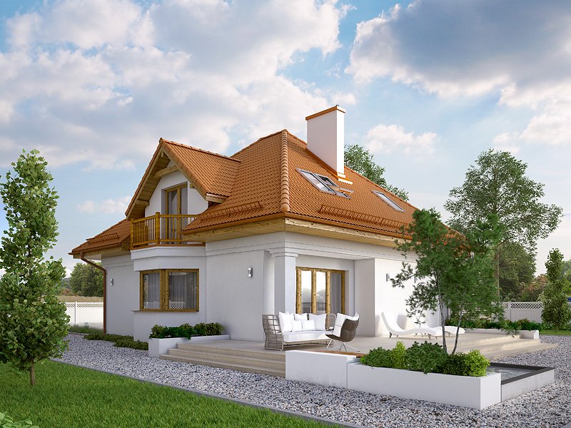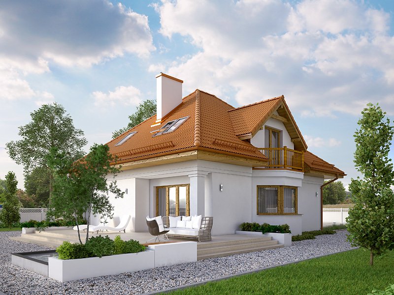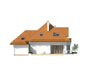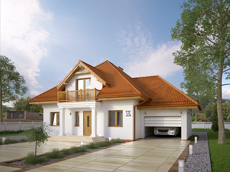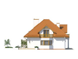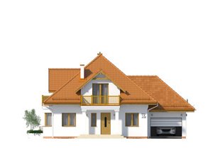 Dom jednorodzinny z poddaszem użytkowym i garażem, przeznaczony dla 3 – 4-osobowej rodziny. Na parterze, prócz części dziennej, znajduje się dodatkowy pokój gościnny lub gabinet. Na poddaszu znajdziemy trzy pokoje, łazienkę oraz garderobę dostępną ze spocznika schodów.