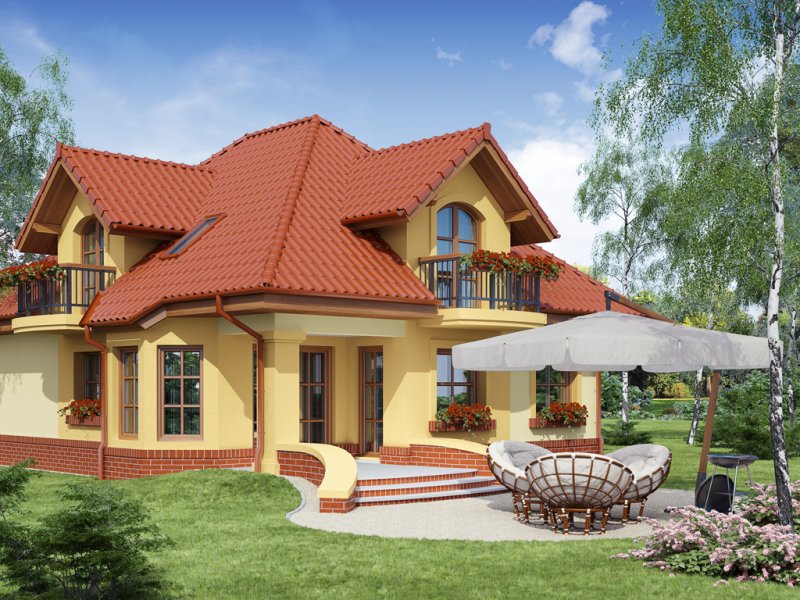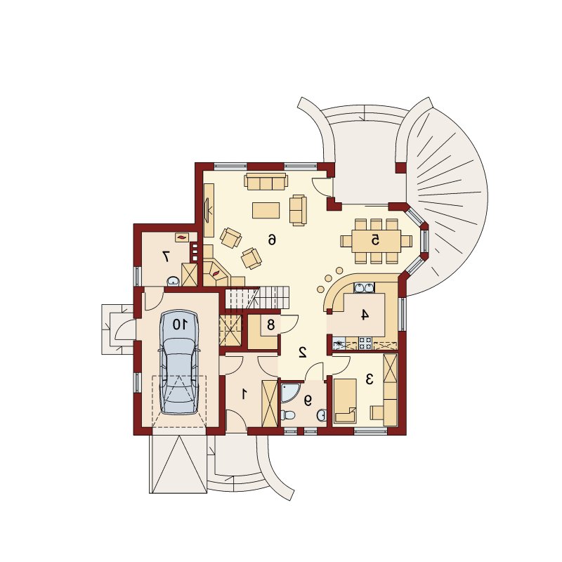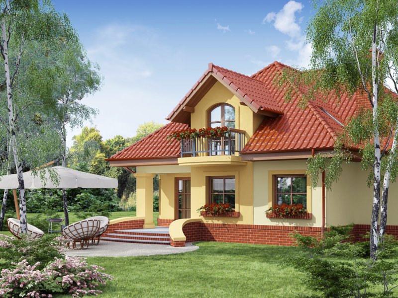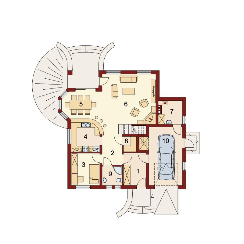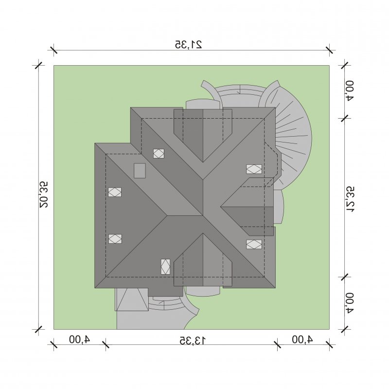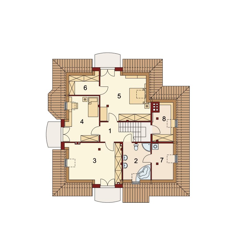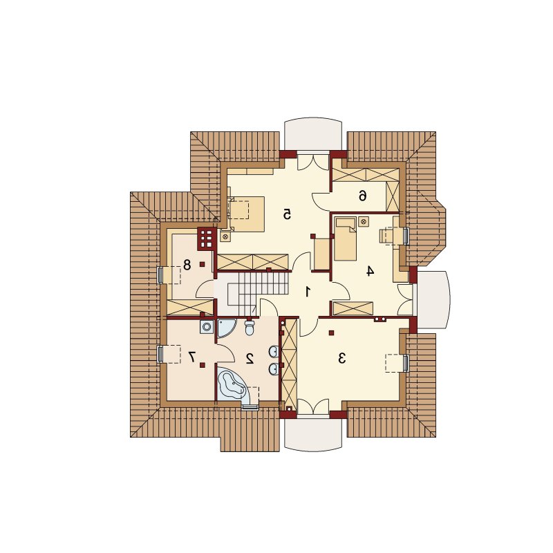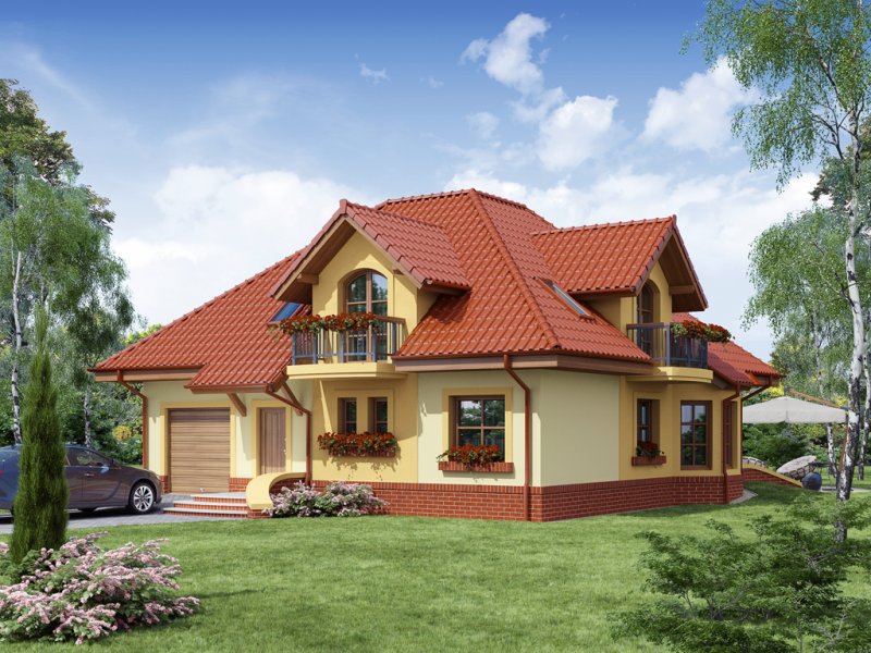 Dom z poddaszem użytkowym, przeznaczony dla 4-5-osobowej rodziny. Na parterze znajduje się przestronny pokój dzienny połączony z jadalnią i otwartą kuchnią. Rozwiązanie funkcjonalne pozwala na wydzielenie ww. pomieszczeń. Wyjście na taras z podcieniem jest możliwe zarówno z części wypoczynkowej pokoju dziennego jak i z części przeznaczonej na jadalnie. Na parterze znajduje się także dodatkowy pokój i łazienka. W bliskim sąsiedztwie kuchni dostępna jest spiżarnia. Na parterze znajduje się pomieszczenie gospodarcze, dostępne poprzez garaż. Na poddaszu znajdują się trzy sypialnie, garderoba dostępna z pokoju, łazienka z wydzielonym aneksem na pralnio-suszarnię oraz pomieszczenie strychu.
