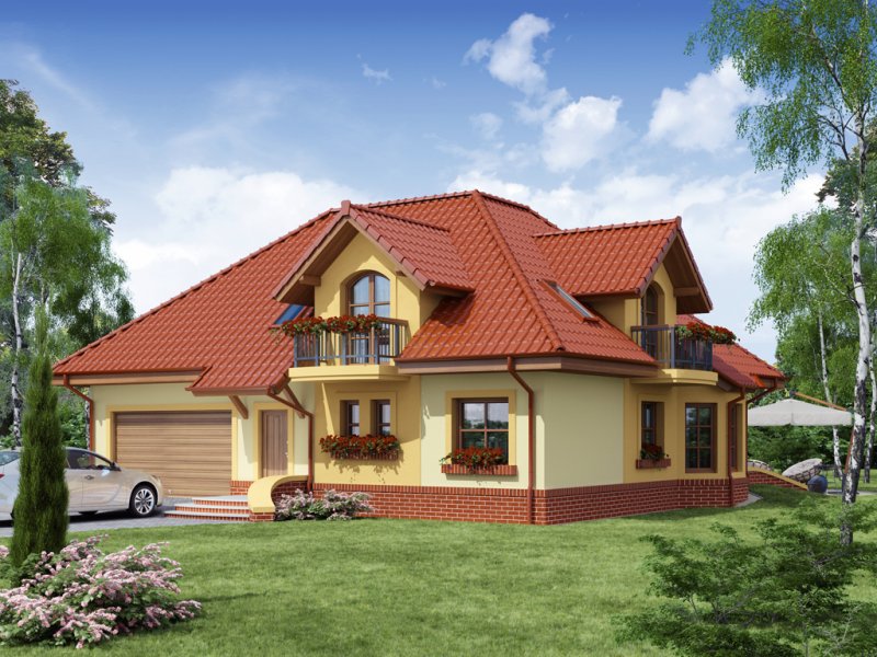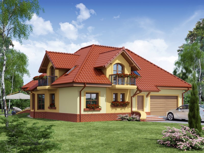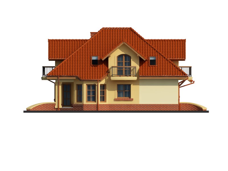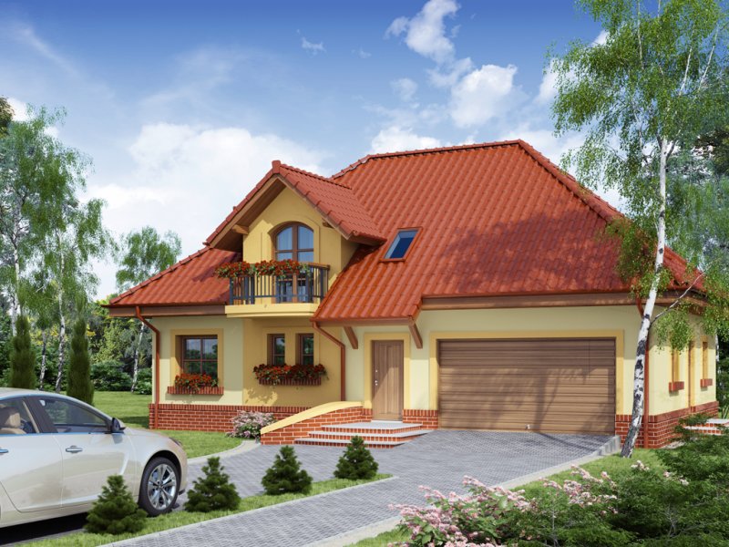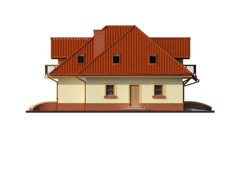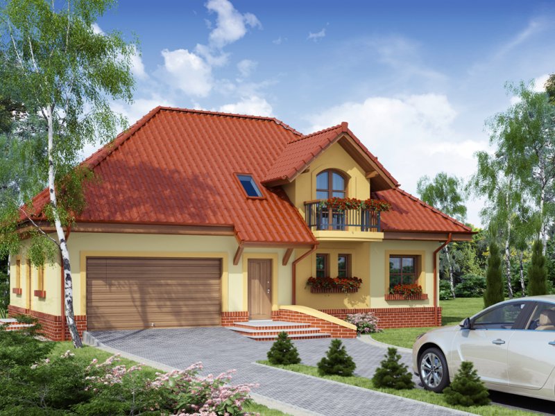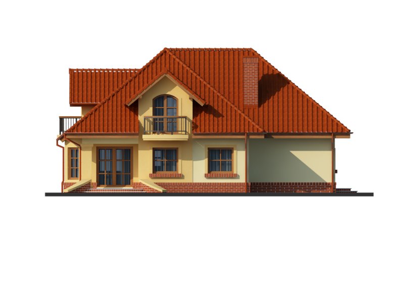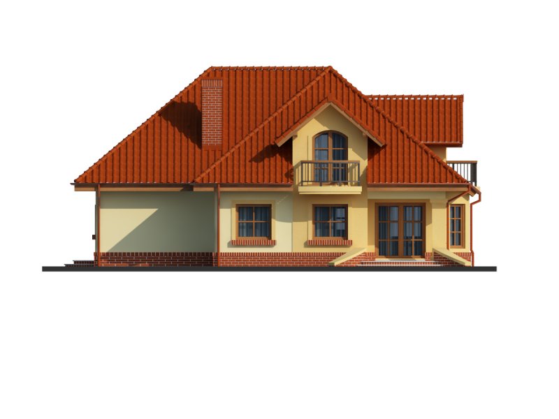 Dom z poddaszem użytkowym, przeznaczony dla 4-5-osobowej rodziny. Na parterze znajduje się przestronny pokój dzienny połączony z jadalnią i otwartą kuchnią. Rozwiązanie funkcjonalne pozwala na wydzielenie ww. pomieszczeń. Wyjście na taras z podcieniem jest możliwe zarówno z części wypoczynkowej pokoju dziennego jak i z części przeznaczonej na jadalnie. Na parterze znajduje się także dodatkowy pokój i łazienka. W bliskim sąsiedztwie kuchni dostępna jest spiżarnia. Na parterze znajduje się pomieszczenie gospodarcze, dostępne poprzez dwustanowiskowy garaż. Na poddaszu znajdują się trzy sypialnie, garderoba dostępna z pokoju, łazienka z wydzielonym aneksem na pralnio-suszarnię oraz strych, który można zaadaptować na dowolne pomieszczenie dopasowane do potrzeb rodziny: pokój hobby, biblioteka, pokój zabaw dla dzieci itp.