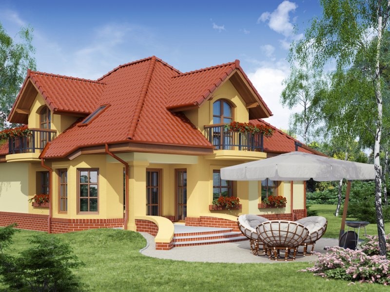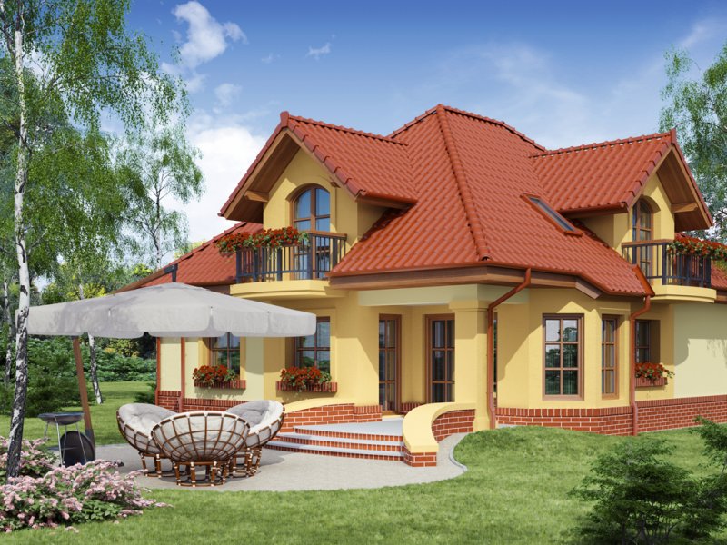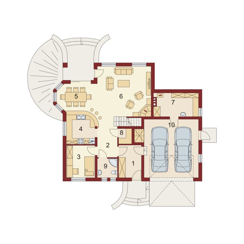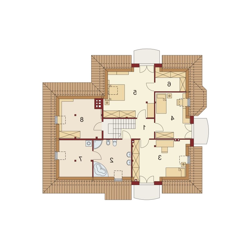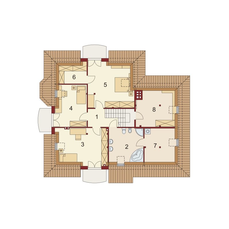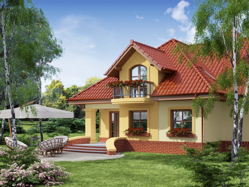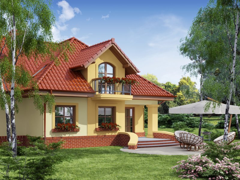 Dom z poddaszem użytkowym, przeznaczony dla 4-5-osobowej rodziny. Na parterze znajduje się przestronny pokój dzienny połączony z jadalnią i otwartą kuchnią. Rozwiązanie funkcjonalne pozwala na wydzielenie ww. pomieszczeń. Wyjście na taras z podcieniem jest możliwe zarówno z części wypoczynkowej pokoju dziennego jak i z części przeznaczonej na jadalnie. Na parterze znajduje się także dodatkowy pokój i łazienka. W bliskim sąsiedztwie kuchni dostępna jest spiżarnia. Na parterze znajduje się pomieszczenie gospodarcze, dostępne poprzez dwustanowiskowy garaż. Na poddaszu znajdują się trzy sypialnie, garderoba dostępna z pokoju, łazienka z wydzielonym aneksem na pralnio-suszarnię oraz strych, który można zaadaptować na dowolne pomieszczenie dopasowane do potrzeb rodziny: pokój hobby, biblioteka, pokój zabaw dla dzieci itp.