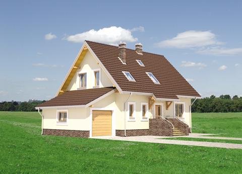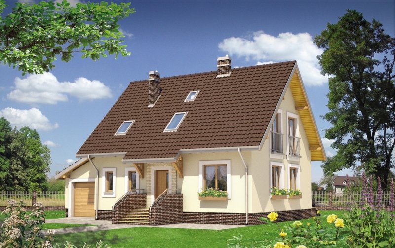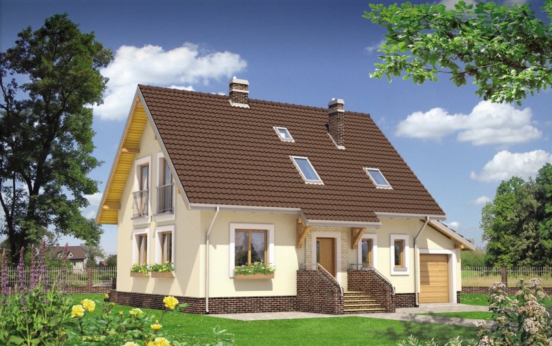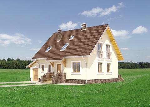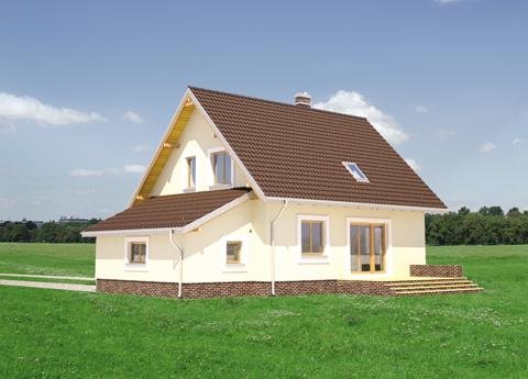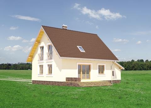 W projekcie domu Aga nieprzechodnia kotłownia dostępna jest z mieszkania przez przedsionek łączący go z garażem. Jest to bardzo wygodne rozwiązanie, a przy tym rzadkie w koncepcjach niewielkich domów parterowych z użytkowym poddaszem i garażem. Pozwala zaaranżować w kotłowni na gaz pralnię, a w przypadku paliwa stałego - uzupełniać zapasy opału z pominięciem drogi przez mieszkanie. Przy dość zwartym, mało wydłużonym rzucie projekt domu Aga wymaga poza tym niewielkiej działki, a dodatkowy pokój na parterze umożliwia etapowanie inwestycji. Centralnie położony kominek rozdziela parter na pokój dzienny, hol, salon i dużą kuchnię. Pod dwuspadowym dachem (z kalenicą równoległą do drogi dojazdowej) jest miejsce na cztery pokoje. Najmniejszy z nich, przy łazience, adaptować można łatwo po części na pralnię, po części na powiększenie sąsiedniej sypialni. Garaż z pulpitowym przekryciem dostawiono do ściany bocznej i połączono z mieszkaniem przejściem pod zabiegową klatką schodową. Bryła Agi jest oszczędna, prosta i tradycyjna, bez balkonów i z symetrycznie usytuowanym akcentem przedłużonego częściowo okapu nad tarasikiem wejściowym.