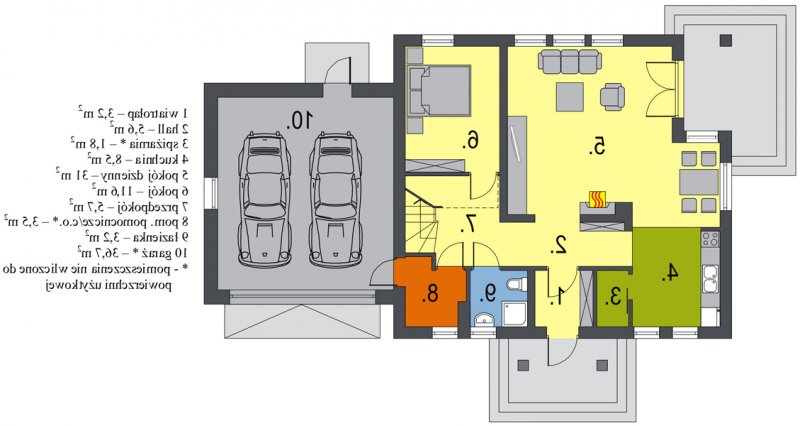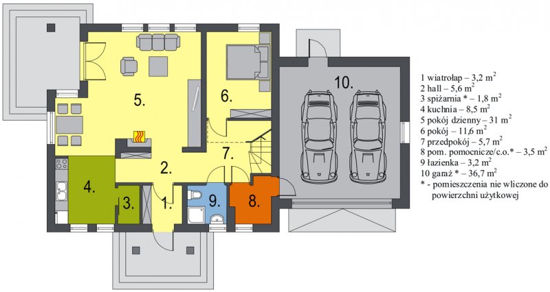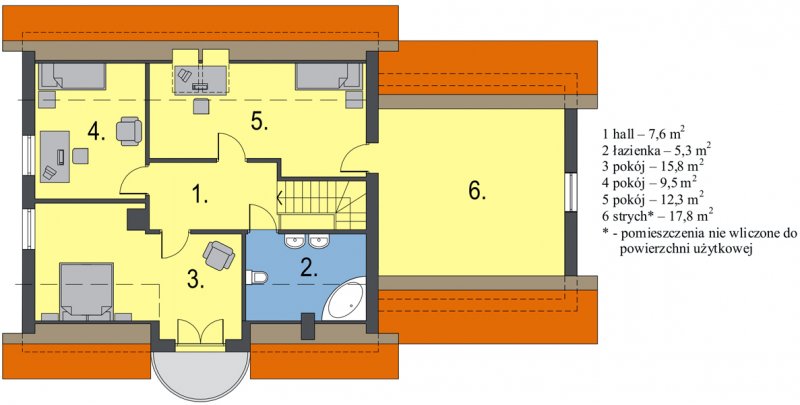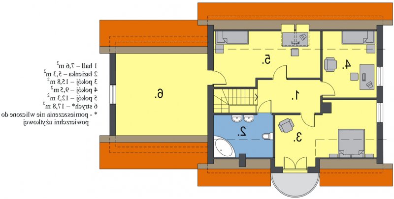 Na parterze znajduje się obszerny salon z wyjściem do ogrodu, funkcjonalnie połączony z jadalnią i kuchnią. Umieszczony w centralnym miejscu kominek umożliwia rozprowadzenie ciepła po całym domu. Kuchnia może być otwarta na salon lub też może stanowić niezależne, zamknięte pomieszczenie. Dodatkowy pokój na parterze to niewątpliwy atut, który może spełniać rolę sypialni lub gabinetu. Zdecydowanie rozdzielona została strefa dzienna i nocna. Na poddaszu znajdują się trzy sypialnie i wygodna łazienka.