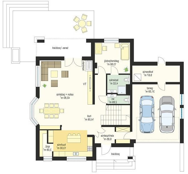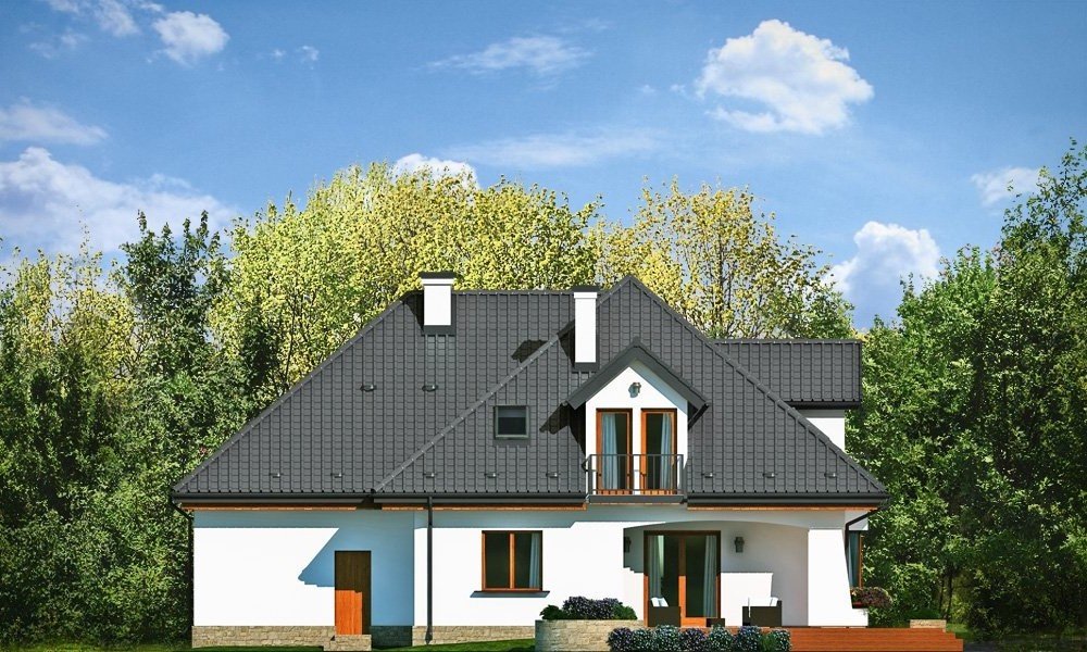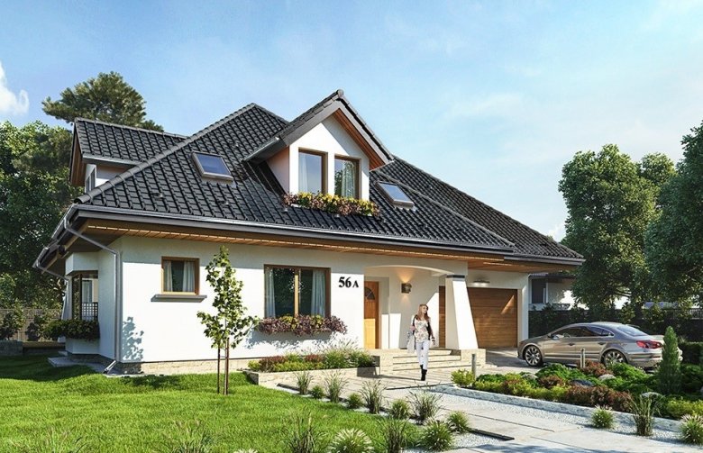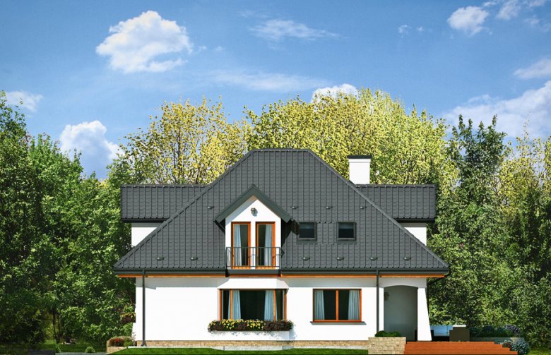 Projekt domu Agnieszka 3 B jest nową wersją projektu - Agnieszka. Projekt domu parterowego z poddaszem użytkowym, dla 4-8cioosobowej rodziny. Budynek składa się z głównej bryły przykrytej czterospadowym dachem ozdobionym trzema lukarnami, oraz dobudowanego do niej garażu z kotłownią. Od strony ogrodu mamy również piękny podcień zadaszający częściowo taras, oraz duże przeszklenia, wykusz jadalni i lukarny poddasza. Wnętrze domu : na parter wchodzimy przez przedsionek z wygodną szatnią, wprost do przestrzeni dziennej połączonego holu, salonu i jadalni. To bardzo ładna, niemal sześćdziesięciometrowa otwarta powierzchnia. Od frontu umieszczona została kuchnia z wyspą i spiżarnią. Z holu widoczne są reprezentacyjne schody, oraz dodatkowy pokój ( gabinet, lub sypialnie ) z własną łazienką. Z szatni przechodzimy do dużego garażu i kotłowni. Na poddaszu mamy trzy piękne, obszerne sypialnie i dwie łazienki. Sypialnie dzieci mają szafy wnękowe. Sypialnie rodziców to osobny apartament, z własną łazienką, piękną garderobą i balkonem z widokiem wprost na ogród. Nad częścią garażową domu mamy dodatkowe dwa pokoje, oraz pralnię. Ilość pokoi jak na dwustumetrowy dom jest imponująca - zmieści się w nim nawet bardzo liczna rodzina.Sprawdź zakładkę "wersje projektów"