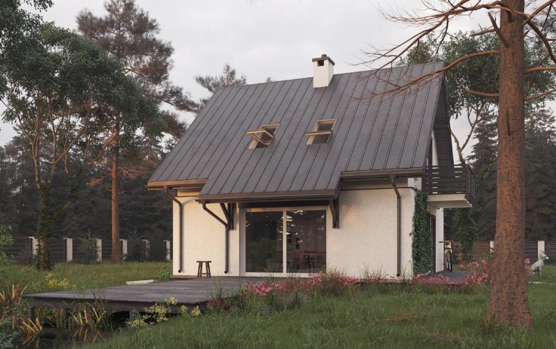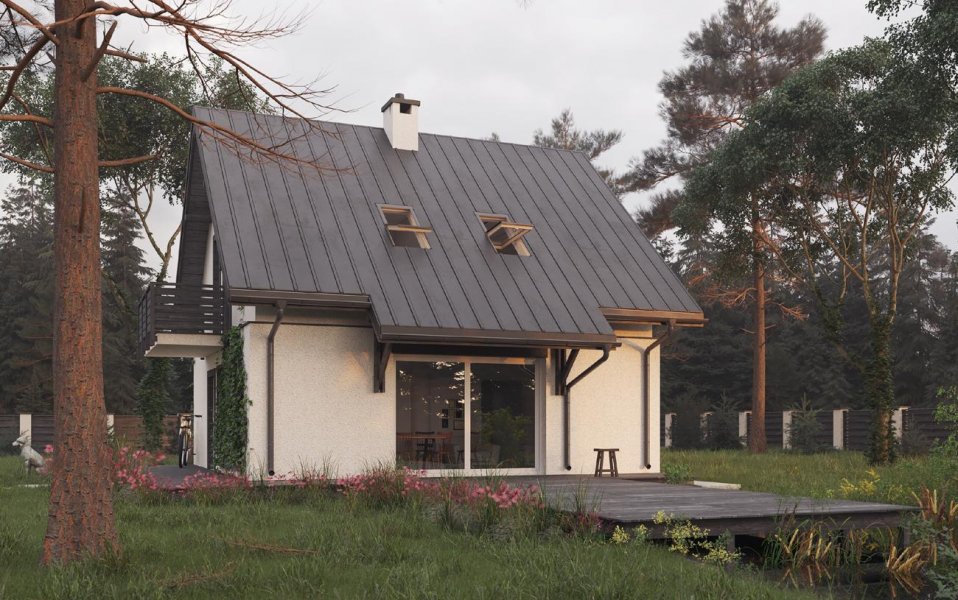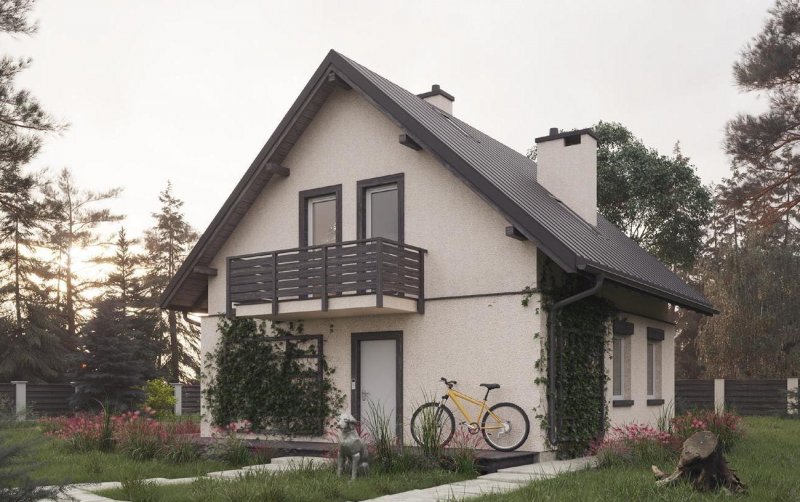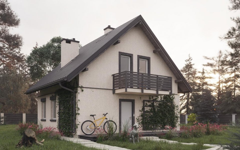 Przez przedsionek wchodzimy do holu, gdzie po lewej stronie mamy łazienkę, na wprost kuchnię połączoną z jadalnią i pokojem dziennym. W pokoju dziennym zlokalizowano kominek. W częściowym podpiwniczeniu znajdują się: kotłownia oraz pomieszczenie gospodarcze. Schodami zabiegowymi dostajemy się na poddasze, gdzie zlokalizowano trzy pokoje oraz wygodną łazienkę. Bardzo prosta, energooszczędna bryła budynku zbudowana na rzucie kwadrata nakryta dachem dwuspadowym o kacie nachylenia połaci 42°. Bryłę urozmaicają: balkon akcentujący wejście do budynku oraz wysunięta część dachu nad wyjściem z pokoju dziennego do części ogrodowej.