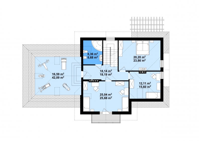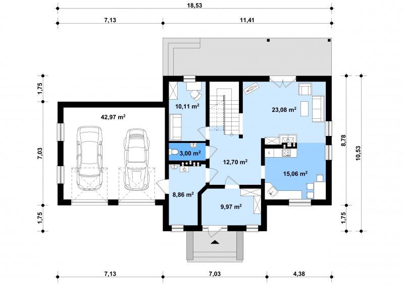 Projekt budynku mieszkalnego, jednorodzinnego, parterowego, niepodpiwniczonego z poddaszem użytkowym i garażem. Do projektu dołączone jest zestawienie: stali, więźby dachowej oraz stolarki drzwiowej i okiennej, jak równieżbezpłatna zgoda na dokonanie zmian.