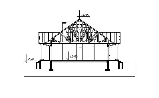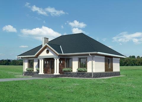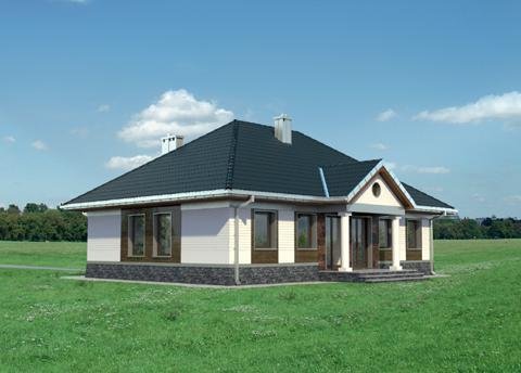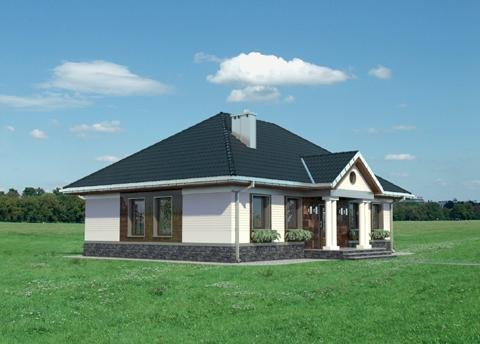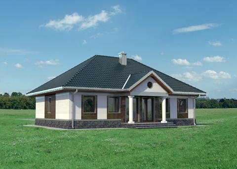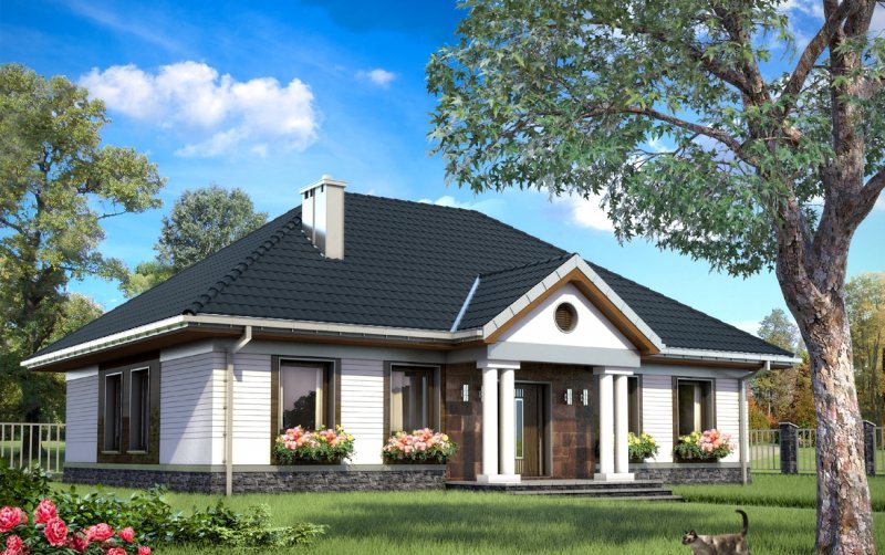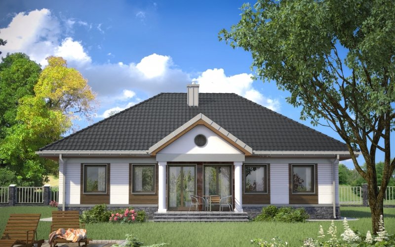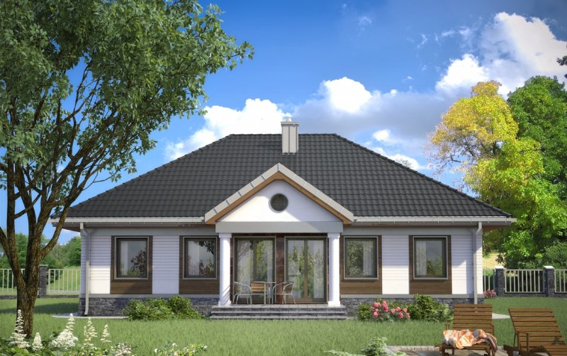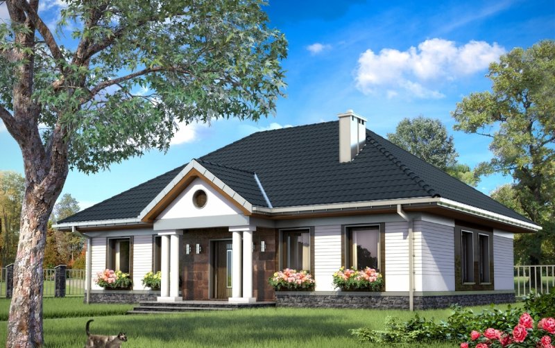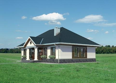 Architektura polskiego dworku zawsze inspiruje tworzących projekty domów jednorodzinnych. Prostokątny rzut jest energooszczędny, a nieużytkowa przestrzeń pod czterospadowym dachem w sposób naturalny (a więc najbardziej ekonomiczny!) izoluje od chłodów i od upału. Aleksandria to dom parterowy, w którym wykorzystano racjonalizm i prostotę tej starej koncepcji, rezygnując z eksperymentowania formą. Bezpretensjonalność Aleksandrii podkreśla symetria bryły, zaznaczona od frontu i od ogrodu kolumnowymi portykami. Współczesnymi akcentami w projekcie domu Aleksandria są duże okna bez podziałów oraz nowoczesne wnętrze. Zamiast izb w amfiladowym układzie, zaprojektowano przestronne mieszkanie dla 4-5 osób. Część dzienna składa się z otwartego salonu, kuchni z kotłownią i spiżarnią oraz niewielkiej łazienki. Część nocna to cztery pokoje i kolejna łazienka, dostępne z korytarza wyprowadzonego z narożnika pokoju dziennego. Dość duży, jak na dom parterowy, kąt nachylenia dachu dodaje autentyzmu stylowej sylwetce Aleksandrii.