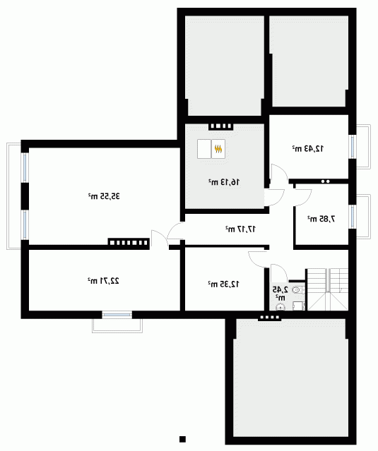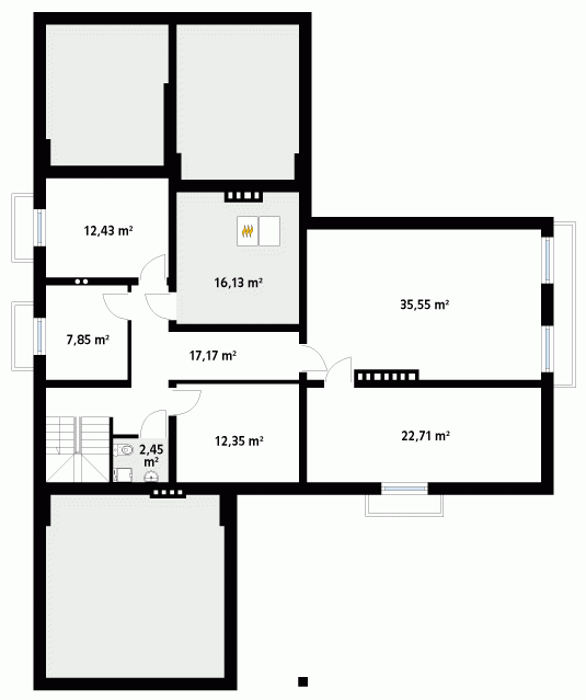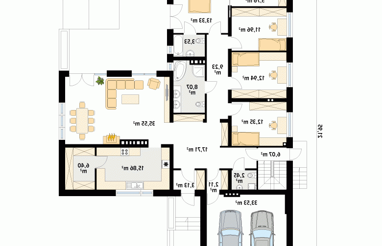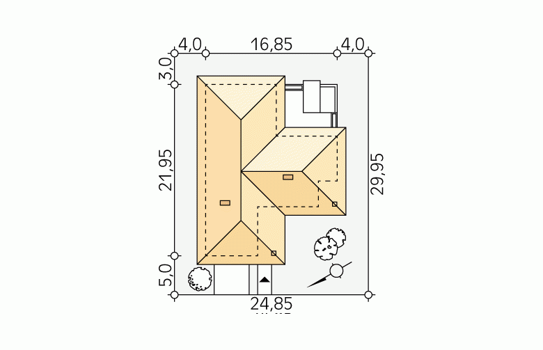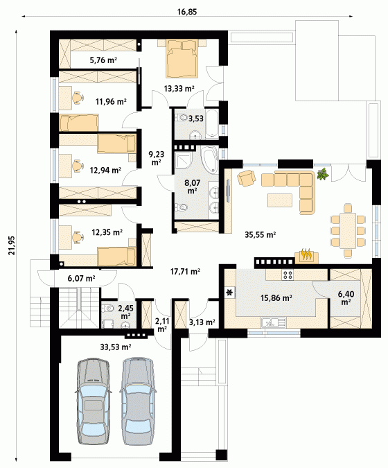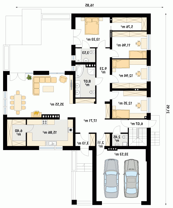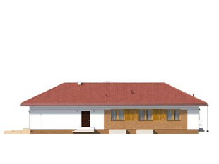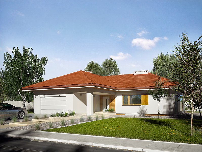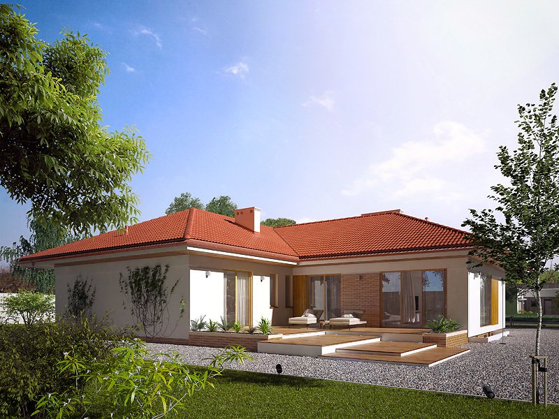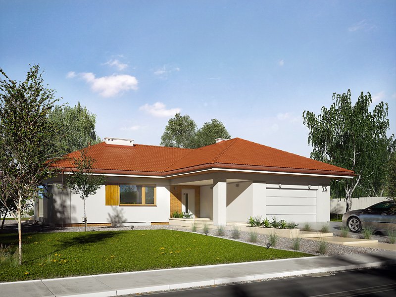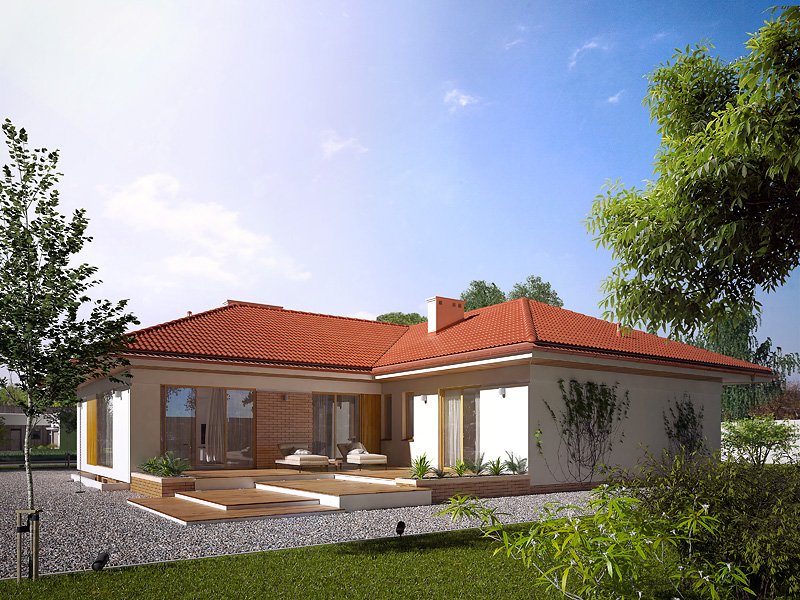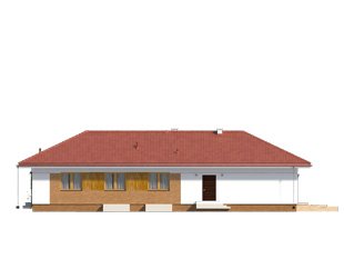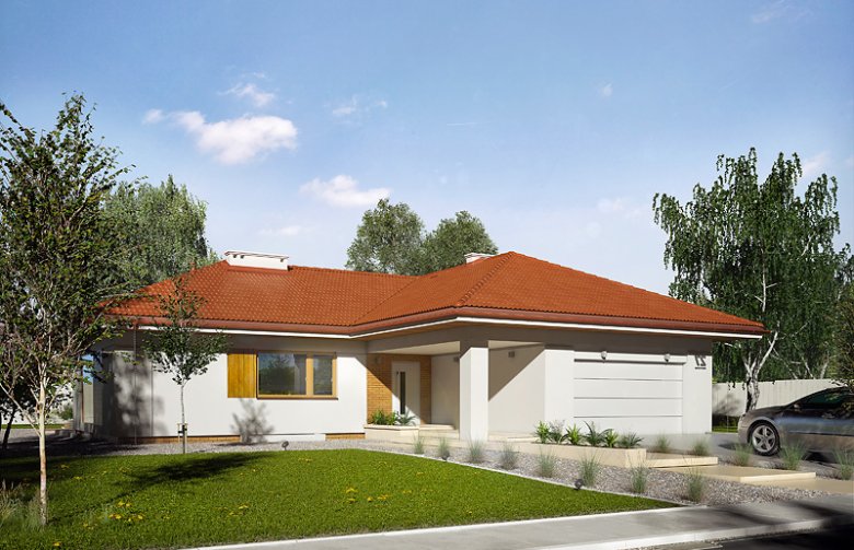 Dom parterowy, podpiwniczony o powierzchni użytkowej blisko 170 m², stworzony z myślą o 5-sobowej rodzinie ceniącej własną przestrzeń oraz komfort użytkowania wnętrza. Centralnym punktem domu jest przestronny salon połączony z jadalnią, charakteryzujący się dużą ilością przeszkleń. W części dziennej domu znajduje się również dużych rozmiarów kuchnia z przylegającą do niej spiżarnią. W części nocnej znajdują się cztery sypialnie, z których główny apartament posiada własną garderobą oraz łazienkę. Do dyspozycji mieszkańców pozostaje również rodzinna łazienka, wc, dwustanowiskowy garaż oraz liczne pomieszczenia gospodarcze w piwnicy. Od strony elewacji ogrodowej znajduje się rozległy taras, idealny do odpoczynku w słoneczne dni, na który prowadzi wyjście z salonu oraz z sypialni gospodarzy.