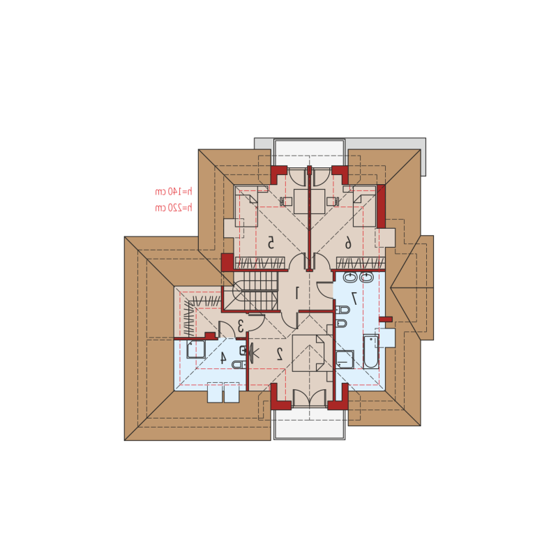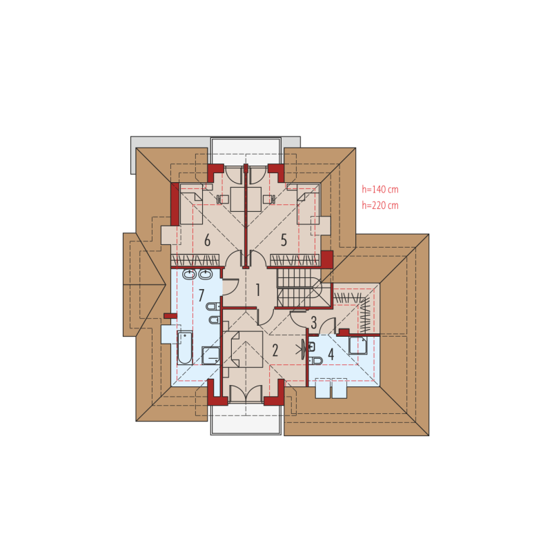 Strefa nocna – poddasze: trzy sypialnie, w tym komfortowa sypialnia główna wraz z łazienką i garderobą oraz wspólna łazienka