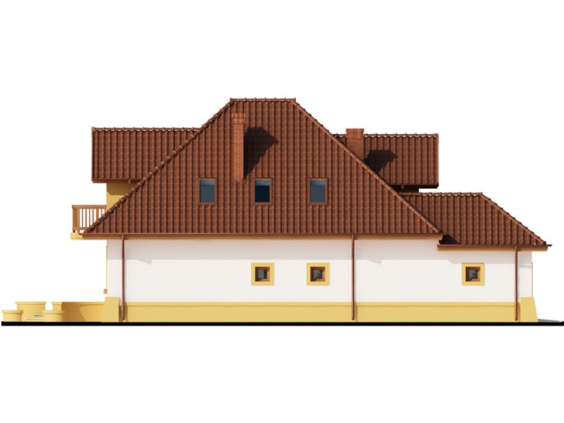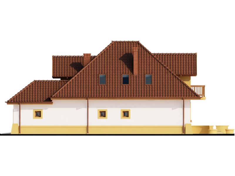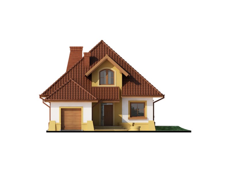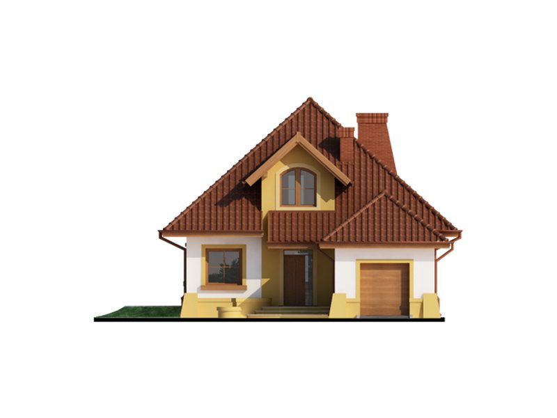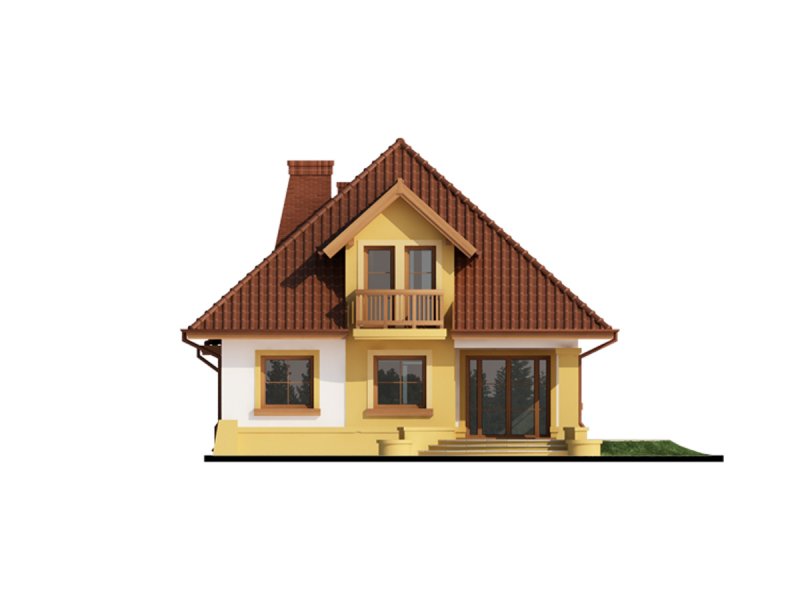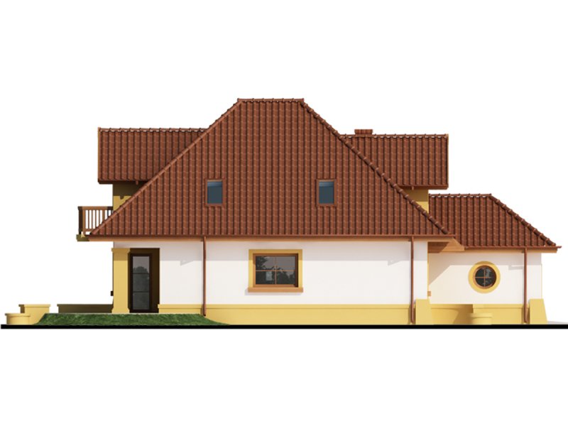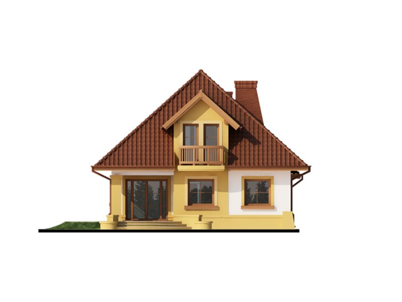 Dom z poddaszem użytkowym, przeznaczony dla 4-5-osobowej rodziny. Na parterze znajduje się przestronny pokój dzienny połączony z jadalnią i otwartą kuchnią. Rozwiązanie funkcjonalne pozwala na wydzielenie ww. pomieszczeń. Wyjście na taras z podcieniem jest możliwe zarówno z części wypoczynkowej pokoju dziennego jak i z części przeznaczonej na jadalnie. Na parterze znajdują się dwa pomieszczenia gospodarcze, z których jedno jest dostępne poprzez garaż, a drugie bezpośrednio z holu i ponieważ znajduje się w bliskim sąsiedztwie kuchni może pełnić rolę spiżarni. Usytuowanie pomieszczeń gospodarczych daje możliwość ich połączenia. Na parterze znajduje się także dodatkowy pokój i łazienka. Na poddaszu znajdują się trzy sypialnie, łazienka z wydzielonym aneksem na pralnie oraz garderoba. Hol na poddaszu posiada wnękę przeznaczoną na szafę.