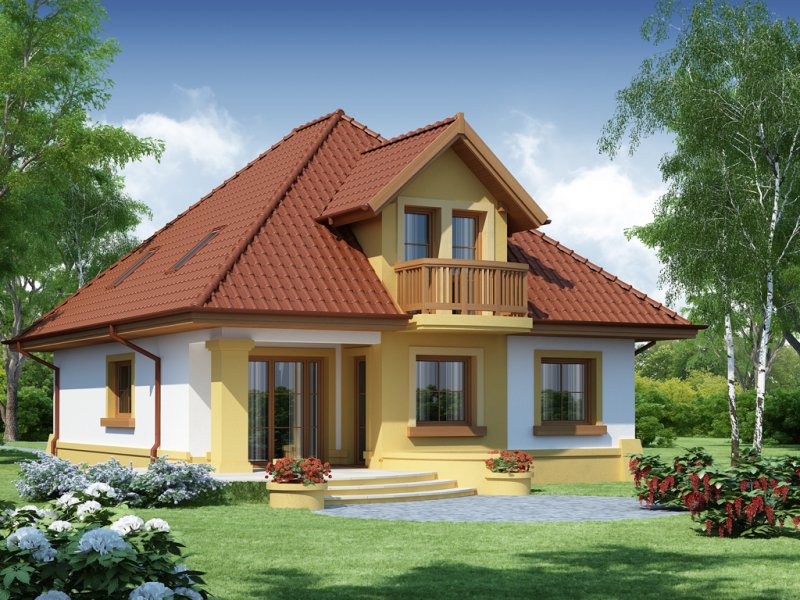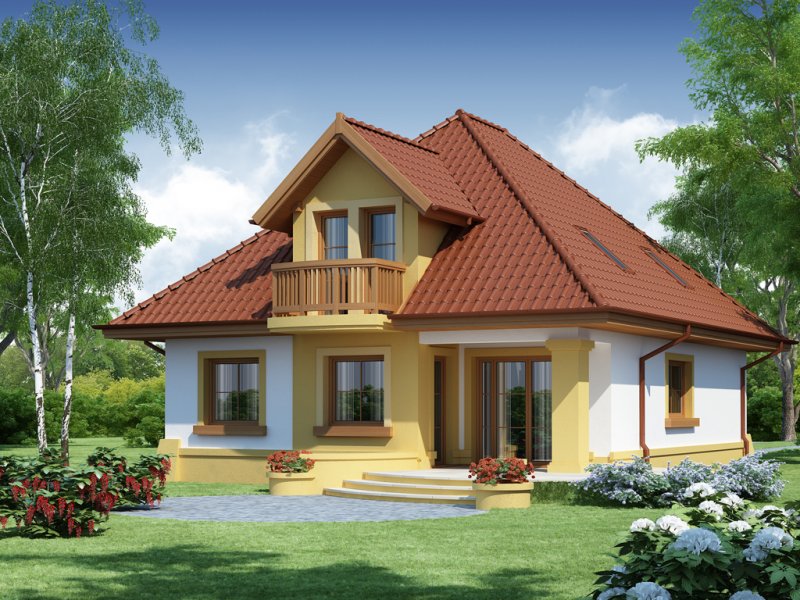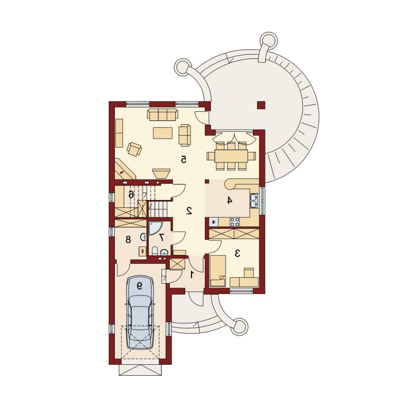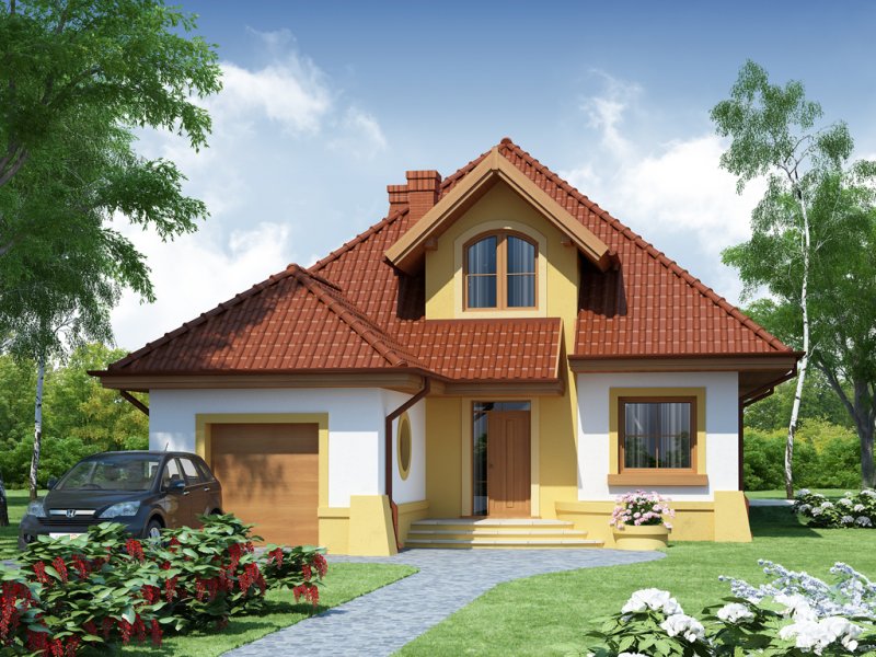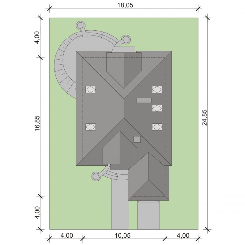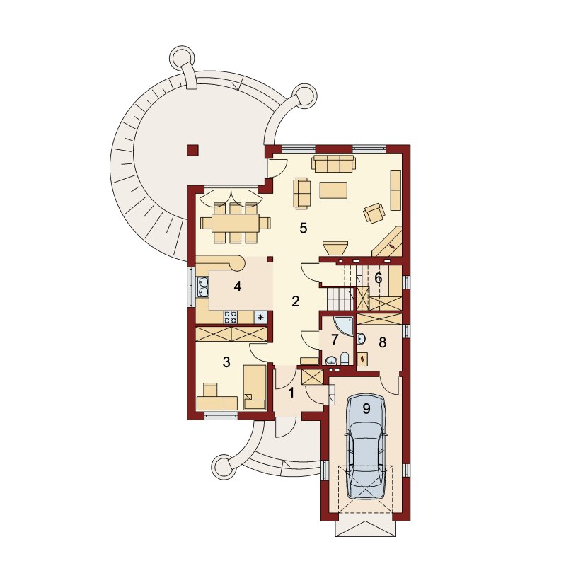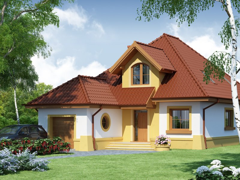 Dom z poddaszem użytkowym, przeznaczony dla 4-5-osobowej rodziny. Na parterze znajduje się przestronny pokój dzienny połączony z jadalnią i otwartą kuchnią. Rozwiązanie funkcjonalne pozwala na wydzielenie ww. pomieszczeń. Wyjście na taras z podcieniem jest możliwe zarówno z części wypoczynkowej pokoju dziennego jak i z części przeznaczonej na jadalnie. Na parterze znajdują się dwa pomieszczenia gospodarcze, z których jedno jest dostępne poprzez garaż, a drugie bezpośrednio z holu i ponieważ znajduje się w bliskim sąsiedztwie kuchni może pełnić rolę spiżarni. Usytuowanie pomieszczeń gospodarczych daje możliwość ich połączenia. Na parterze znajduje się także dodatkowy pokój i łazienka. Na poddaszu znajdują się trzy sypialnie, łazienka z wydzielonym aneksem na pralnie oraz garderoba. Hol na poddaszu posiada wnękę przeznaczoną na szafę.