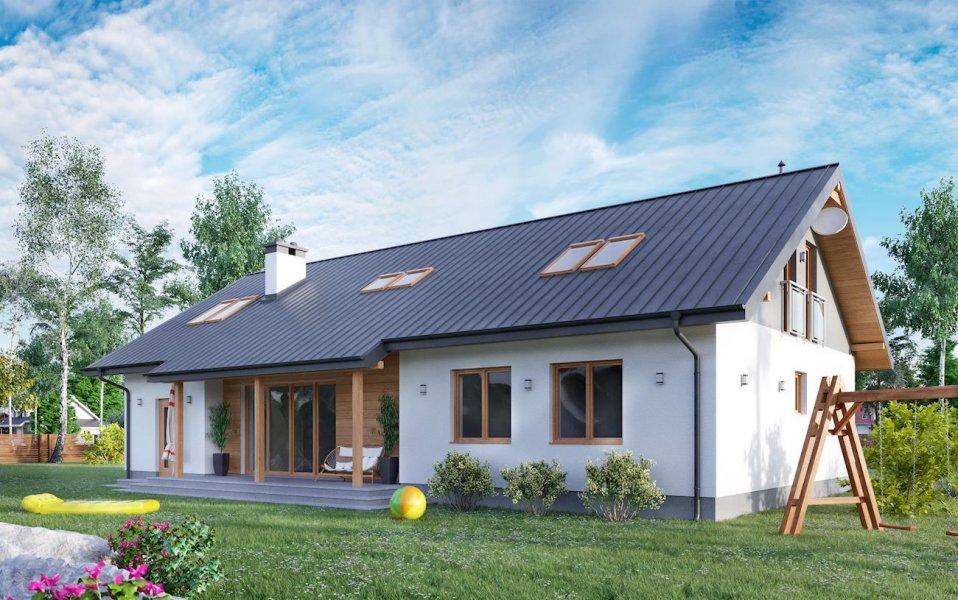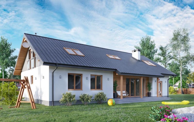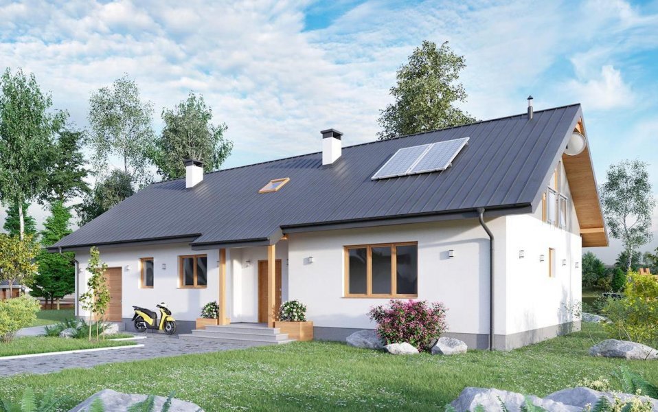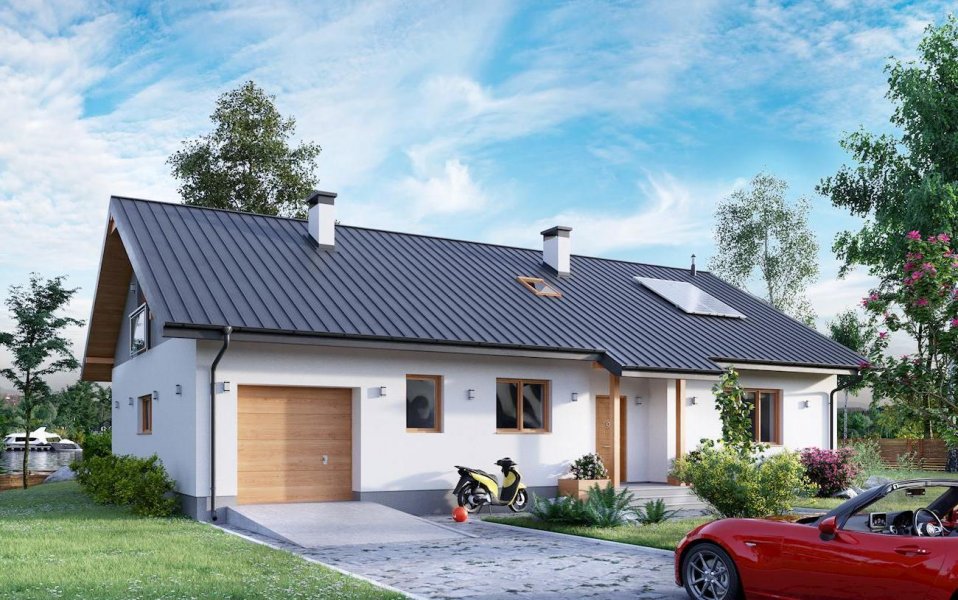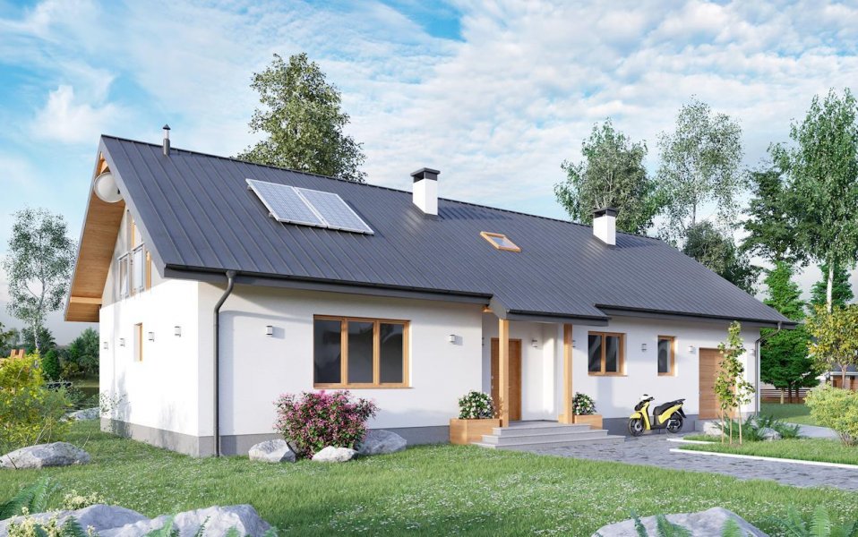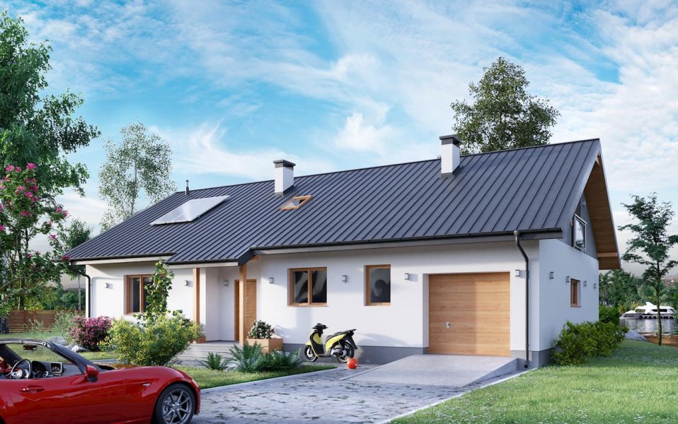 Koncepcja dużego, parterowego domu z użytkowym poddaszem i z garażem w niezwykle ekonomicznym wydaniu określa charakter projektu domu Aramis. Powstał on z myślą o szerokiej i płytkiej działce w terenie o warunkach zabudowy wymagających architektury tradycyjnej, neutralnej w formie i niewysokiej. Bardzo wydłużony, prostokątny plan przekrywa prosty dwuspadowy dach. Rzut składa się z trzech części konstrukcyjno-funkcjonalnych. W środkowej znajduje się wejście i strefa wspólna otwartego pokoju dziennego. Dwie pozostałe to część prywatna z trzema sypialniami i dwiema łazienkami oraz garaż z dużą kotłownią. Wyjątkowo przestronna kuchnia pozwala wydzielić spiżarnię z przejściem do części gospodarczej. Wykorzystanie poddasza w kolejnym etapie budowy według projektu domu Aramis umożliwiają rozmiary salonu i kąt nachylenia dachu. Jest on na tyle duży, że gwarantuje dodatkową powierzchnię użytkową na sypialnie dla co najmniej czterech osób, a jednocześnie nie aż tak stromy, by nie postrzegać budynku jako parterowego. Oszczędną architekturę urozmaicają dwie wnęki w środkowej części: z wejściem frontowym i z tarasem od ogrodu.