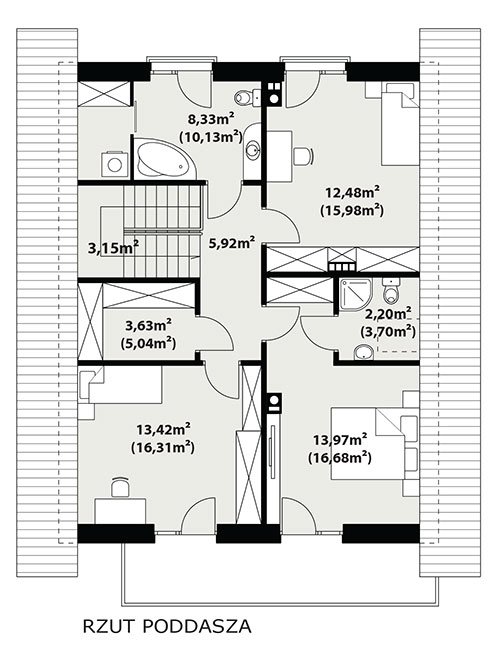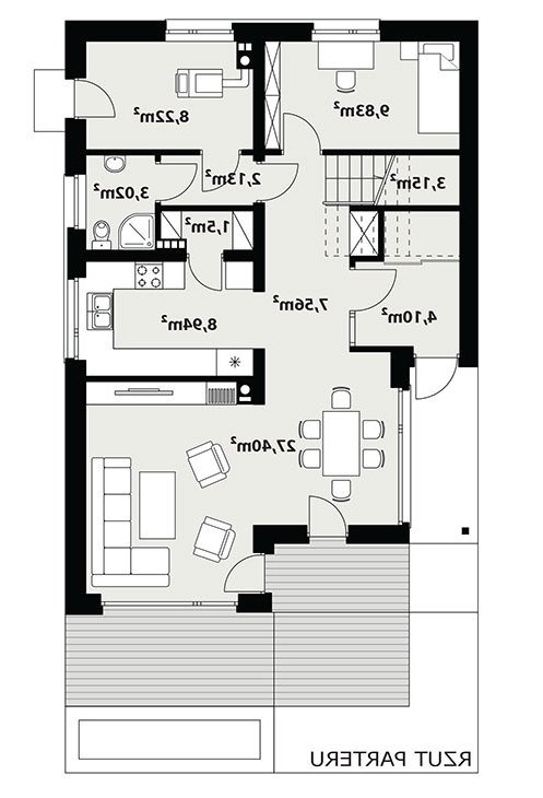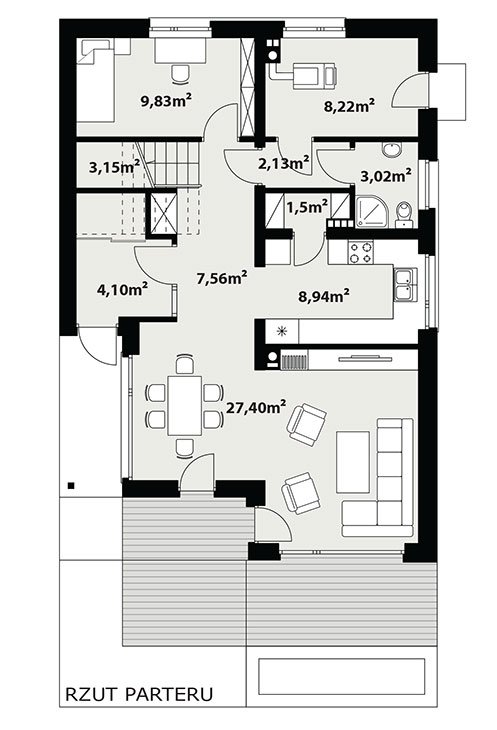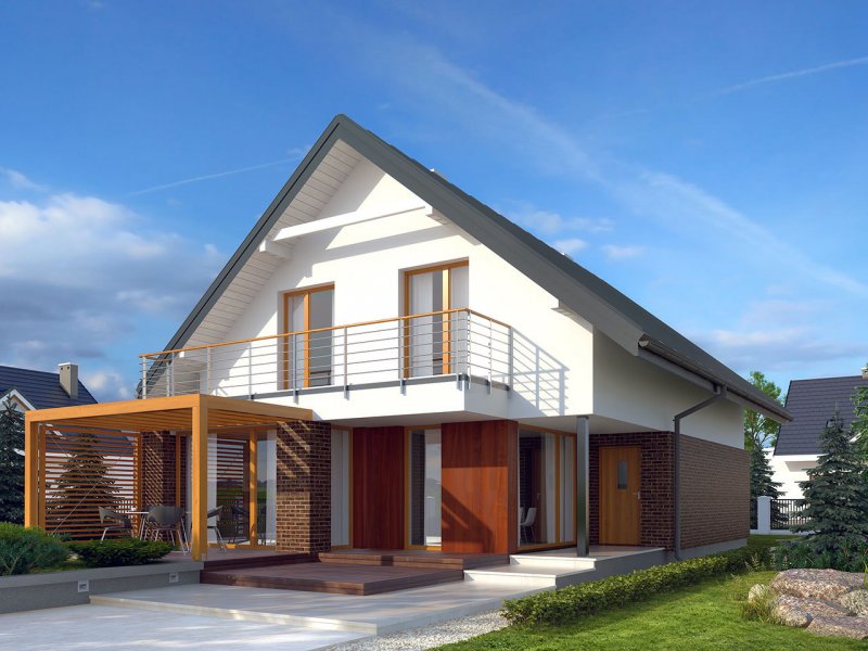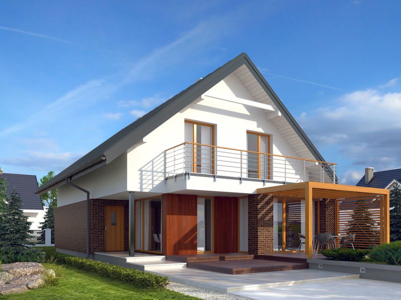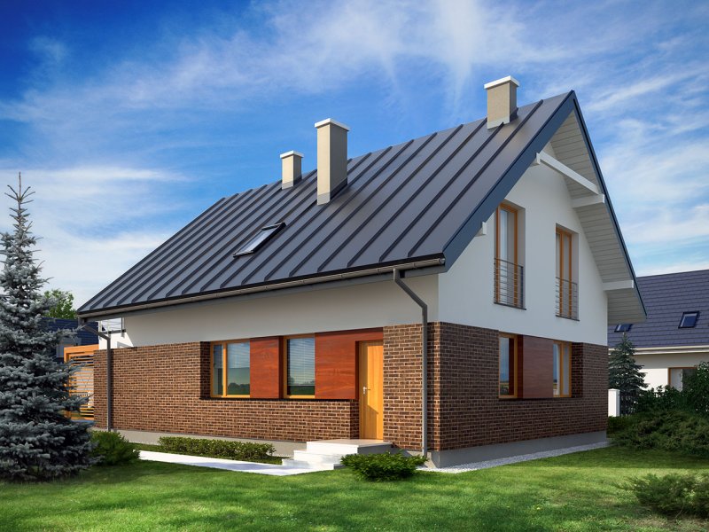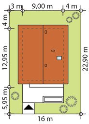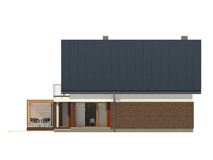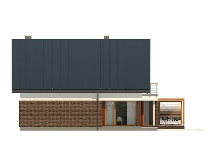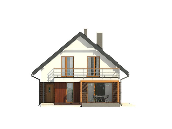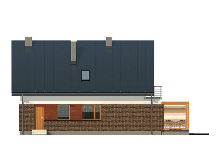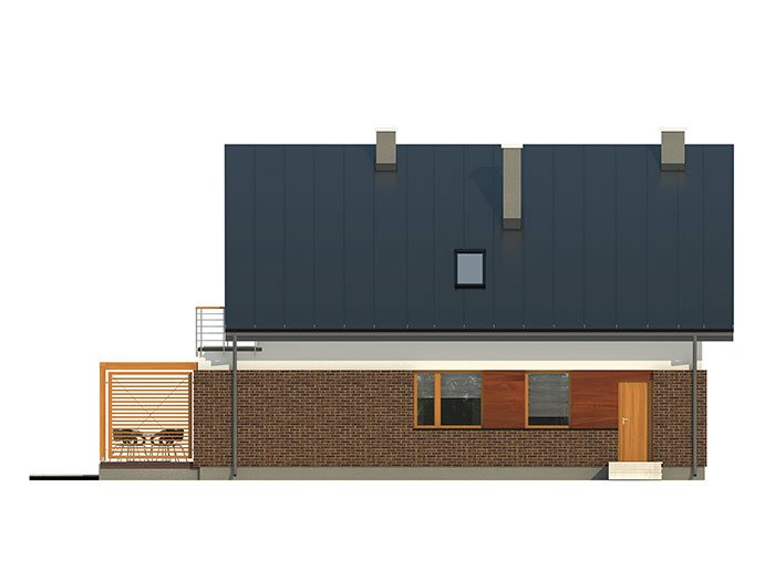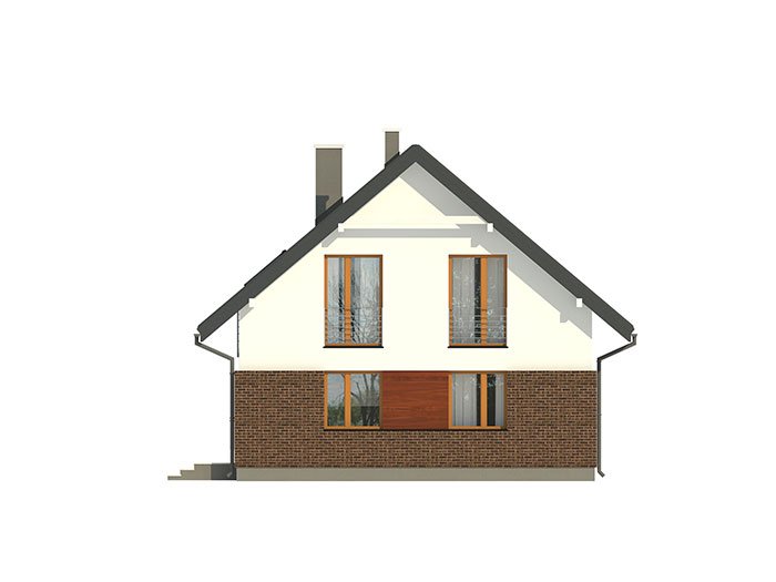 Jednorodzinny budynek mieszkalny, parterowy z użytkowym poddaszem, niepodpiwniczony. Szerokość budynku umożliwia jego budowę na tzw. "wąskiej działce", zaś układ pomieszczeń, jego lokalizację z wejściem od strony południowej. Atutem projektu jest ergonomiczny i optymalny układ pomieszczeń, który zapewni komfort 4,5-osobowej rodzinie. Część dzienna, od strony ulicy, to przestronny salon połączony z przeszkloną jadalnią oraz kuchnia wzbogacona o jadalnię. Oprócz części reprezentacyjnej, na parterze przewidziano także gabinet z możliwośćią przerobienia go na dodatkową sypialnię, wc oraz dużą kotłownię. Wymiary kotłowni umożliwiają montaż kotła na każdy rodzaj paliwa. Na poddaszu zaprojektowano trzy sypialnie, z czego jedna z nich posiada garderobę, łazienkę oraz pomieszczenie gospodarcze. Sama bryła budynku nawiązuje do archetypu domu jednorodzinnego. Rzut budynku powstał w oparciu o rzut prostokąta, zaś sam dom został przykryty dachem dwuspadowym. O wyglądzie i estetyce budynku decydują tutaj ciekawe materiały oraz prosty elegancki detal.