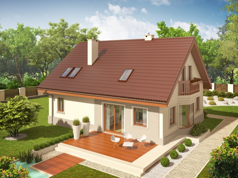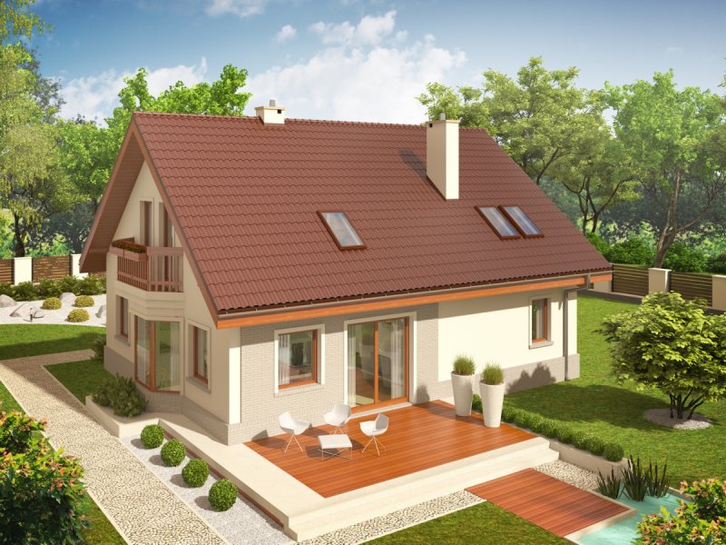 Dom zaprojektowany w technologii murowej ze stropem gęstożebrowym. Schody wewnętrzne drewniane. Dach o konstrukcji drewnianej pokryty dachówką ceramiczną Röben. Elewacje wykończono tynkiem mineralnym i okładziną kamienną. Cokoły kamienne lub wykończone tynkiem. Stolarka okienna drewniana lub PCV.