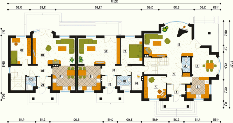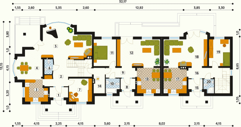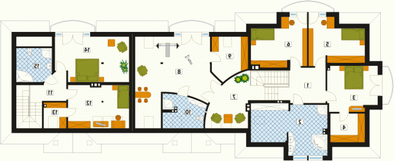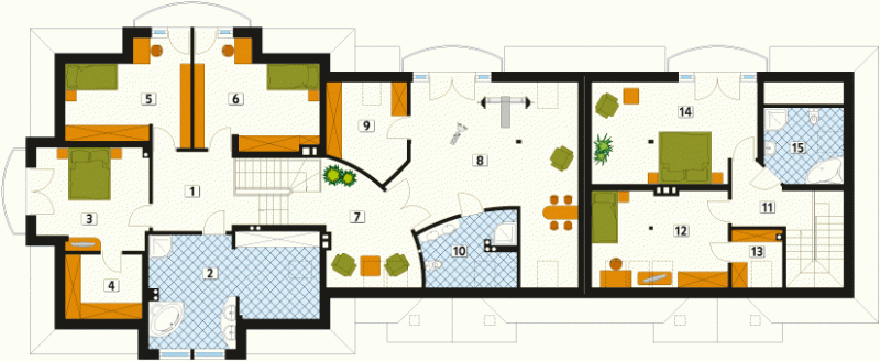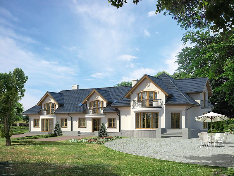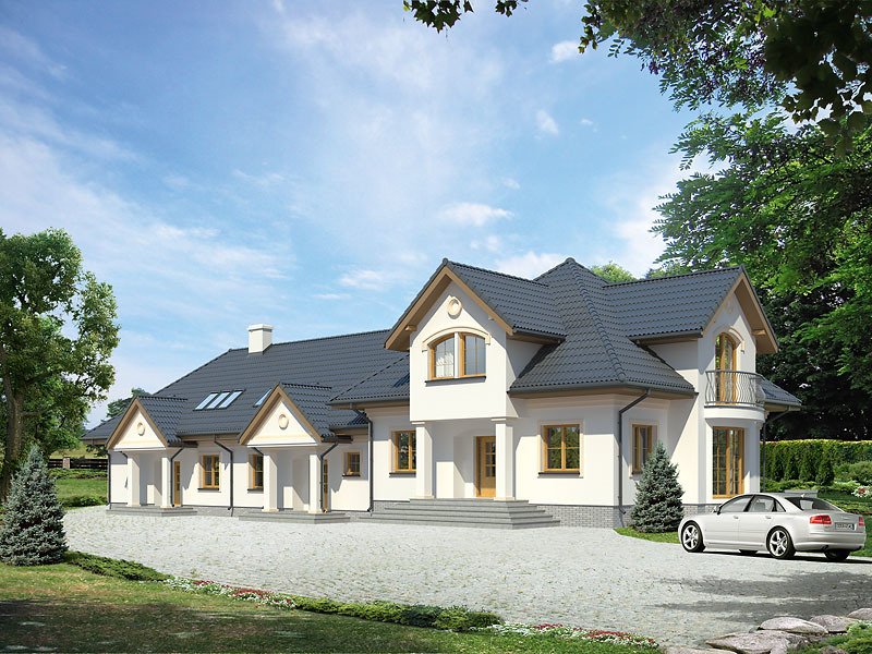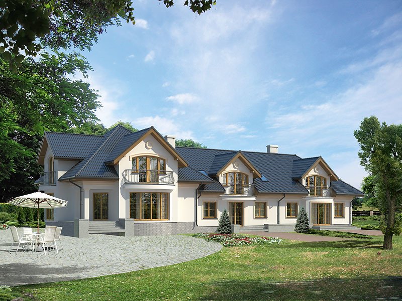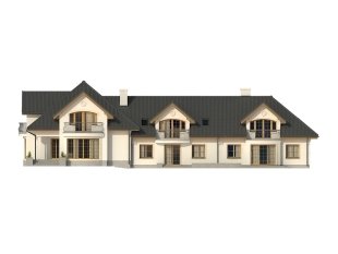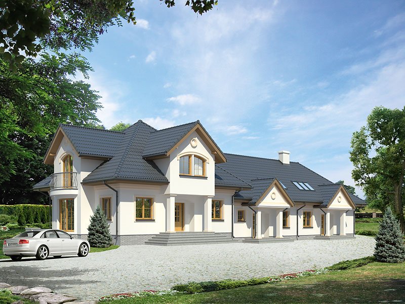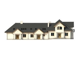 Budynek z oddzielnymi wejściami do trzech lokali - może być użytkowany przez trzy rodziny. W największym z lokali znajduje się dodatkowy pokój na parterze oraz rozbudowana część rekreacyjna na poddaszu. W poszczególnych częściach domu znajdują się odpowiednio: trzy, jedna i kolejne trzy sypialnie. Dom ma charakter rezydencjalny