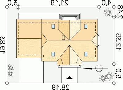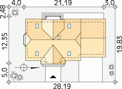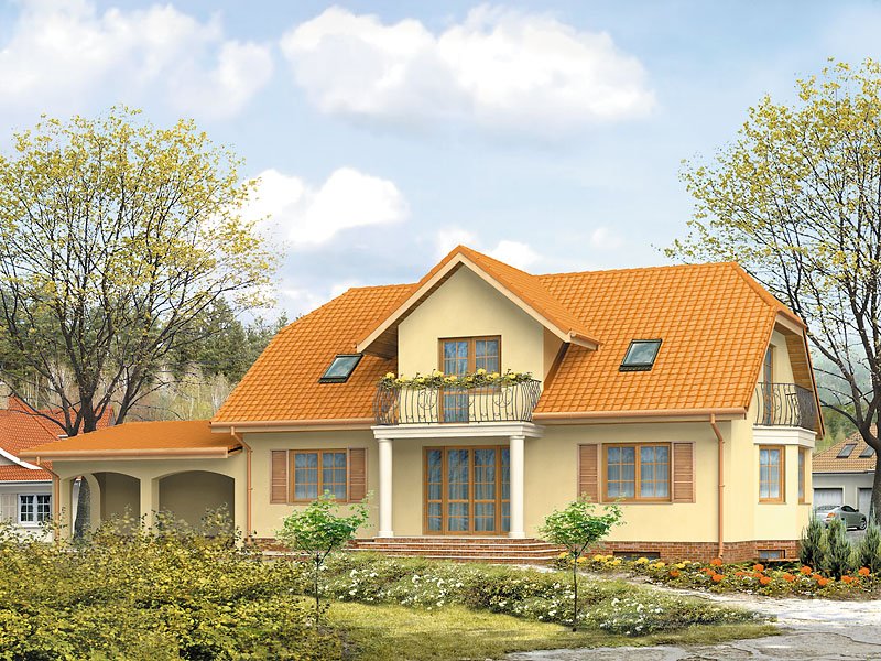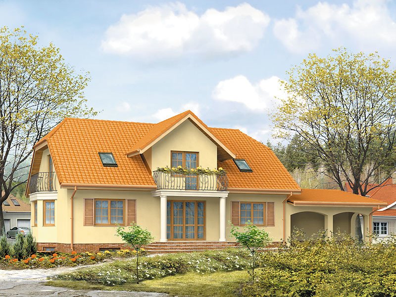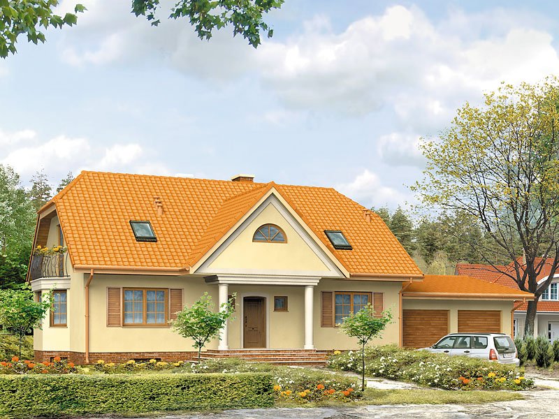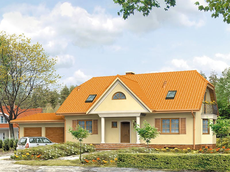 Ściany: 2-warstwowe - pustak ceramiczny + styropian, Stropy: żelbetowe, wylewane, Dach: dachówka, kąt nachylenia 38°