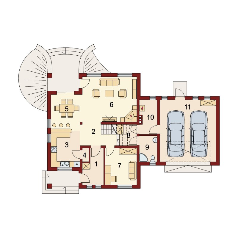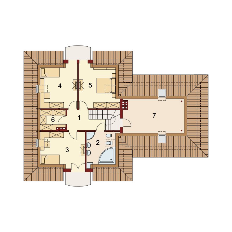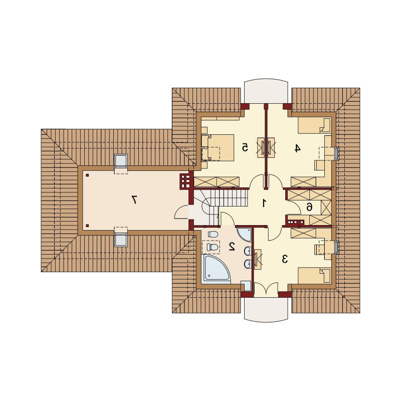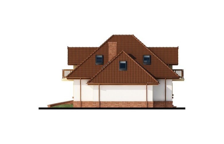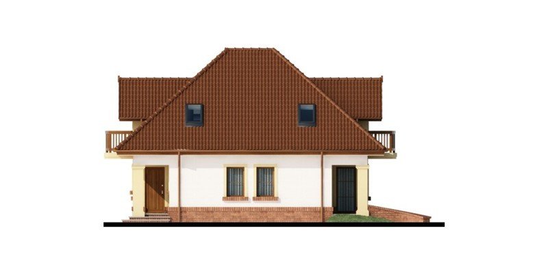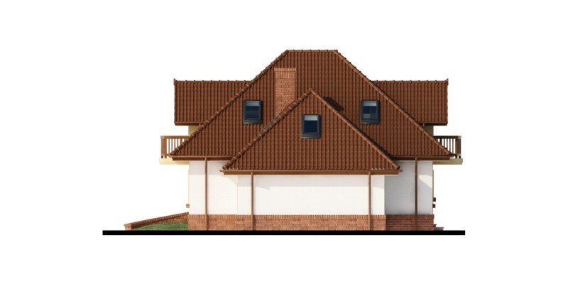 Wymarzony dom dla 4-5 osobowej rodziny. Pomieszczenia usytuowane na parterze idealnie ze sobą współgrają. Umieszczenie spiżarni w sąsiedztwie z kuchenką oraz zlewozmywakiem tworzy praktyczną strefę roboczą w kuchni. Garderoba łączy część mieszkalną parteru z gospodarcza, co świadczy o doskonałym wykorzystaniu przestrzeni. Dodatkowym wyjściem na taras w salonie, możemy przejść w stronę ogrodu nie zakłócając nastroju biesiadników w jadalni. Zaletą jest również bezpośrednie wejście w elewacji ogrodowej do strefy gospodarczej . Dzięki niemu możemy dostać się do garażu, a także łazienki bez zbędnej ingerencji w część mieszkalną domu. Również poddasze, z trzema ustawnymi pokojami oraz obszerną łazienką, urzeknie swoją funkcjonalnością. Ogólnodostępną garderobę doceni każdy domownik. Strych dostępny bezpośrednio z klatki schodowej to doskonały pomysł na dodatkowy pokój hobby lub prywatną siłownię.