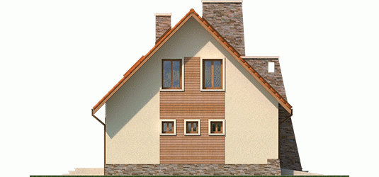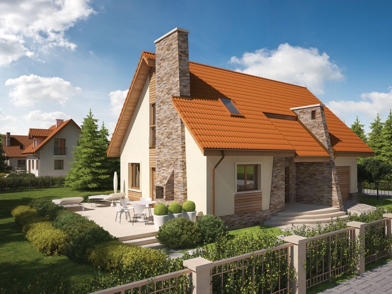 Elewacja: tynk cienkowarstwowy mineralny, okładzina drewniana i kamienna