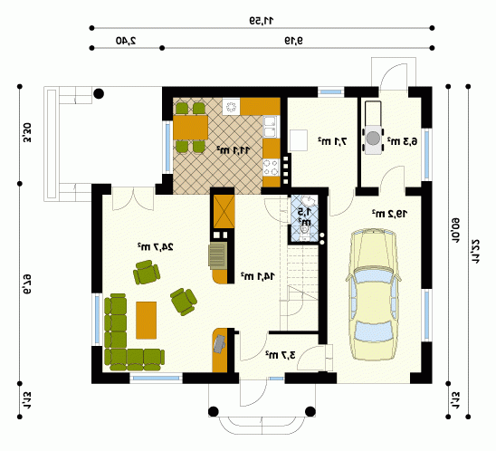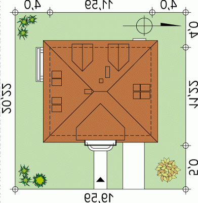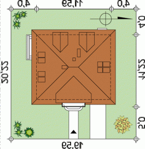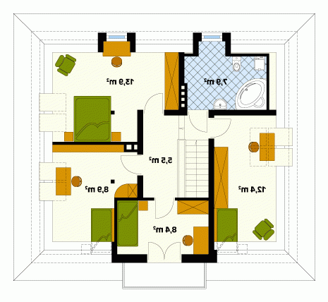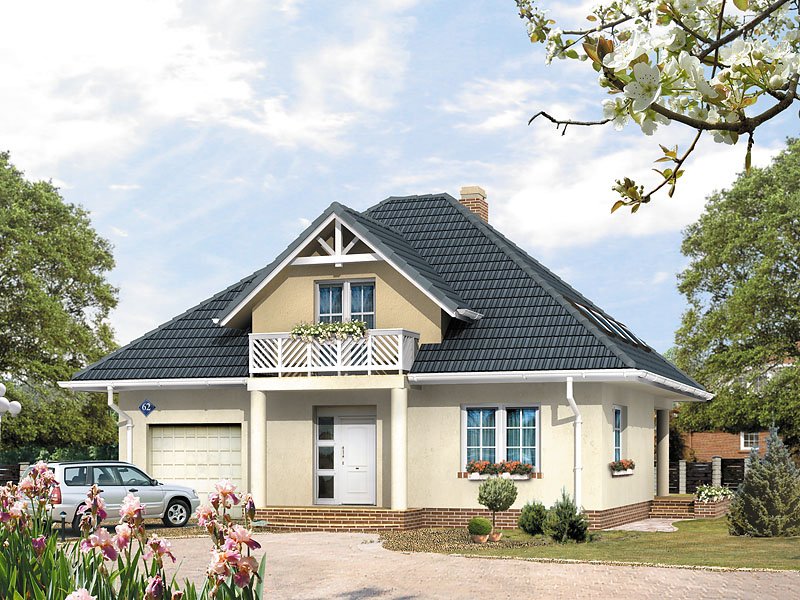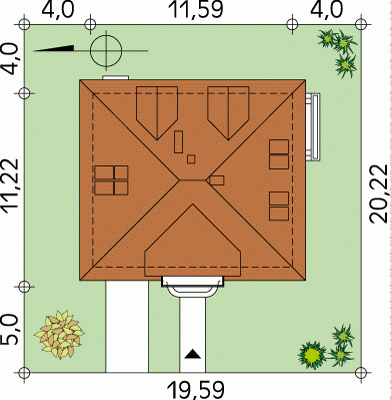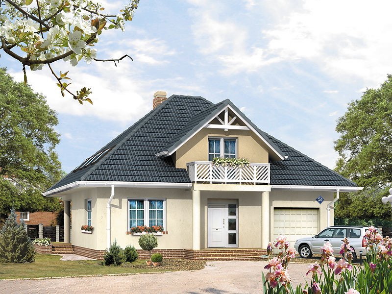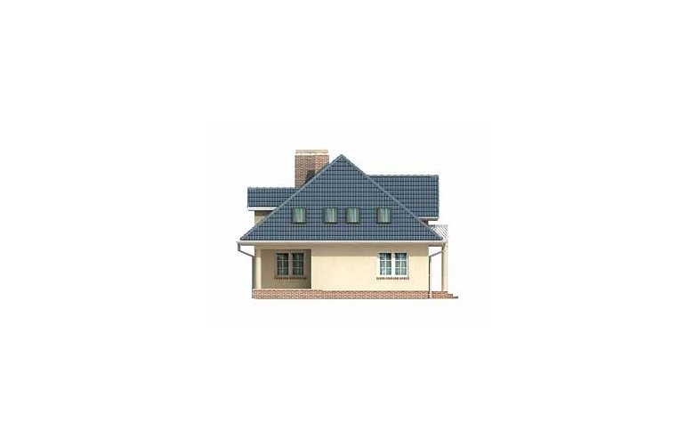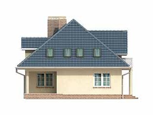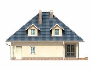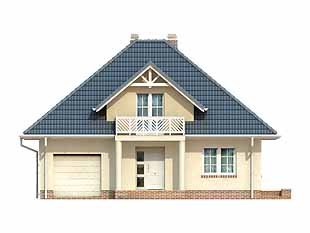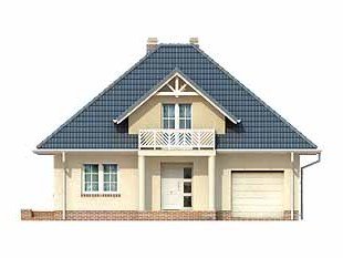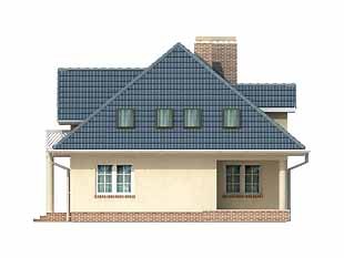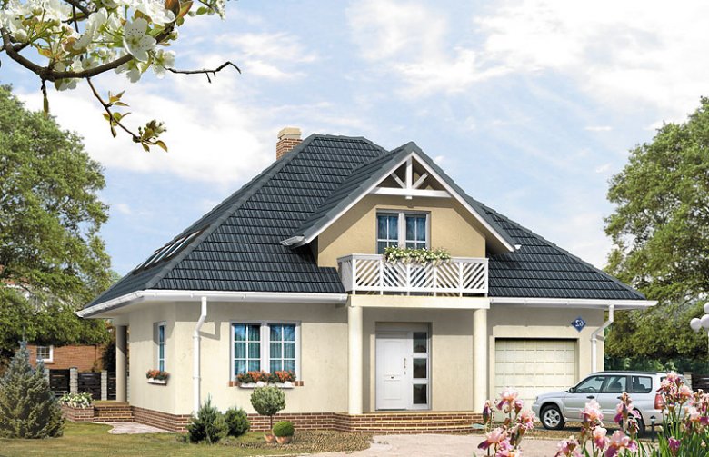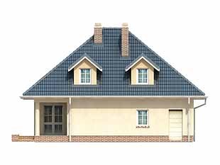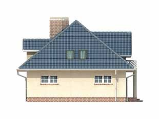 Nieduży dom dla 4 – 5-osobowej rodziny, parterowy z użytkowym poddaszem, niepodpiwniczony. Na niedużej powierzchni zaprojektowano bardzo funkcjonalny układ pomieszczeń z wyraźnym podziałem na strefę nocną i dzienną Na parterze znajduje się pokój dzienny, kuchnia z jadalnią, zadaszony taras, garaż i pomieszczenia gospodarcze. Na poddaszu cztery sypialnie i łazienka.