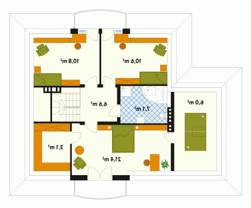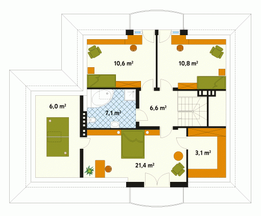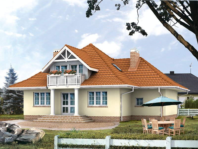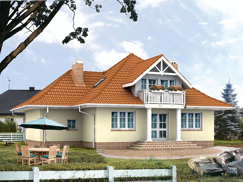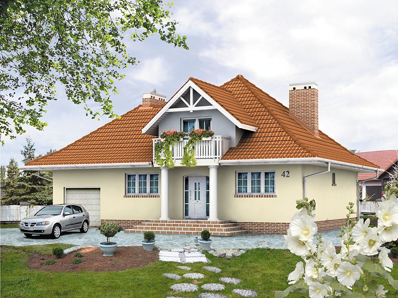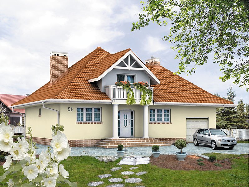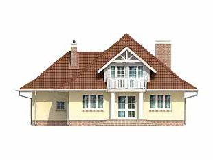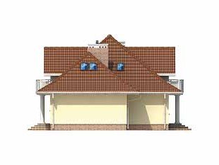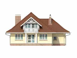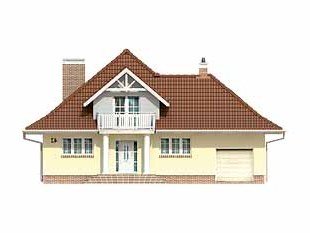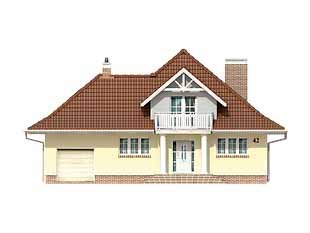 Dom jednorodzinny, niepodpiwniczony z użytkowym poddaszem i przybudowanym garażem. Budynek o spokojnej bryle i funkcjonalnym wnętrzu. Przeznaczony dla 4 – 5 osób. Dom, oprócz pięciu pokoi i wygodnej kuchni z jadalnią, zawiera szereg praktycznych pomieszczeń gospodarczych. Garaż można powiększyć do dwóch stanowisk.