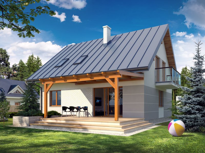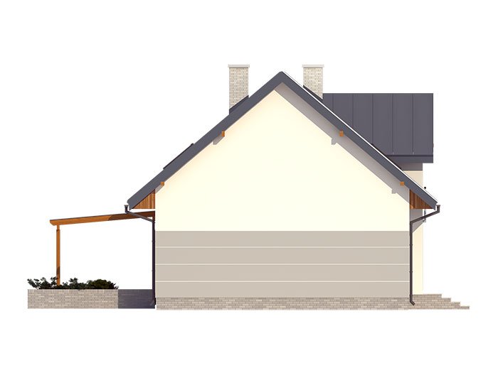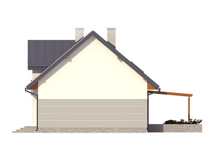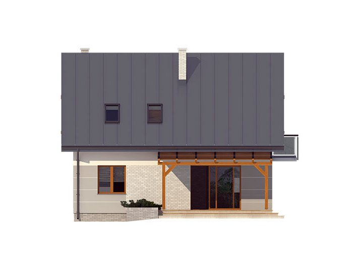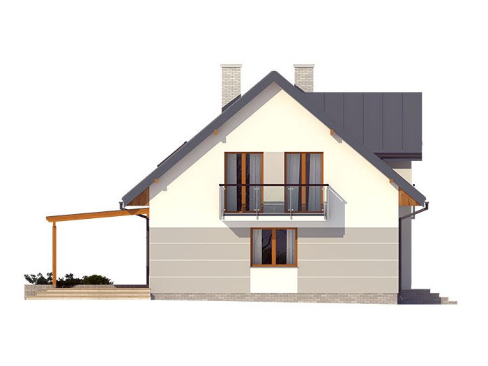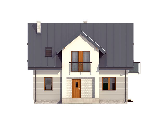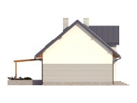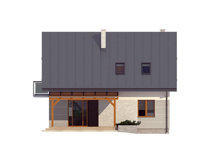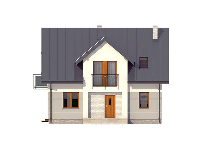 Dom jednorodzinny, parterowy z użytkowym poddaszem, niepodpiwniczony. Posiada prostą bryłę przykrytą dwuspadowym dachem z lukarną od frontu. Wnętrze domu jest przestronne i pozwala na wiele aranżacji. Kuchnia może być otwarta na salon lub zamknięta - z wejściem z holu. Salon posiada duże przeszklenie z wyjściem na zadaszony taras. Kotłownia dostępna z wiatrołapu ma wielkość pozwalającą na zastosowanie również kotła na paliwo stałe. Poddasze zostało podzielone na 3 pokoje, dużą łazienkę i garderobę. Zastosowanie na całości poddasza ścian działowych pozwala na łatwe zmiany podziału pomieszczeń.