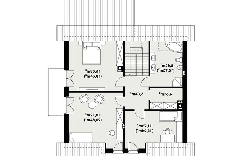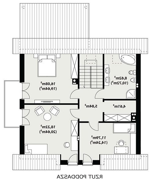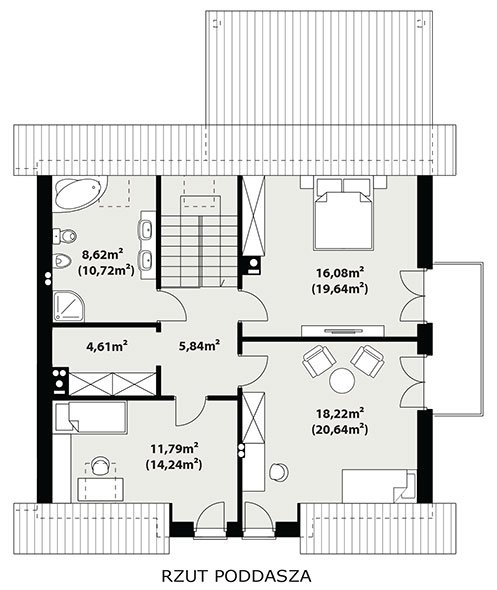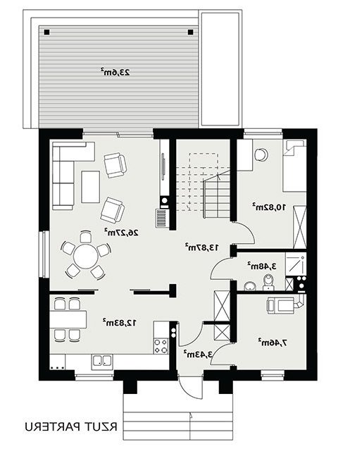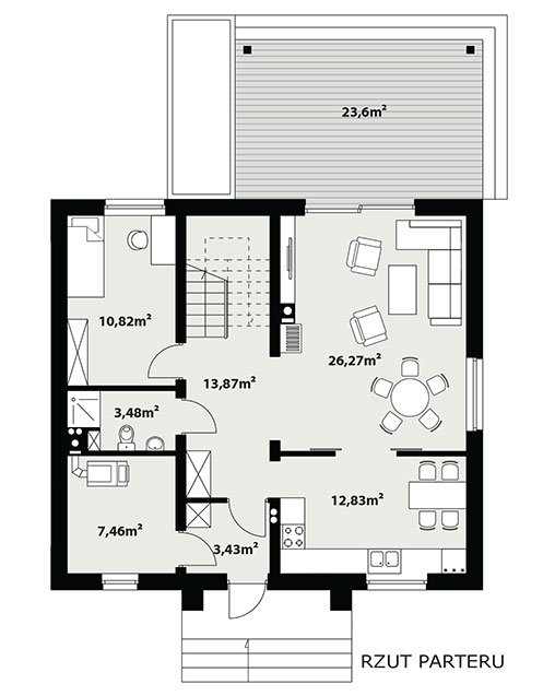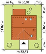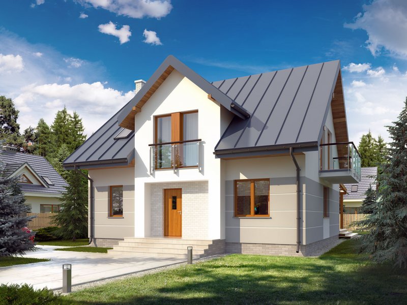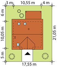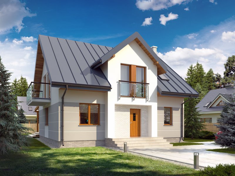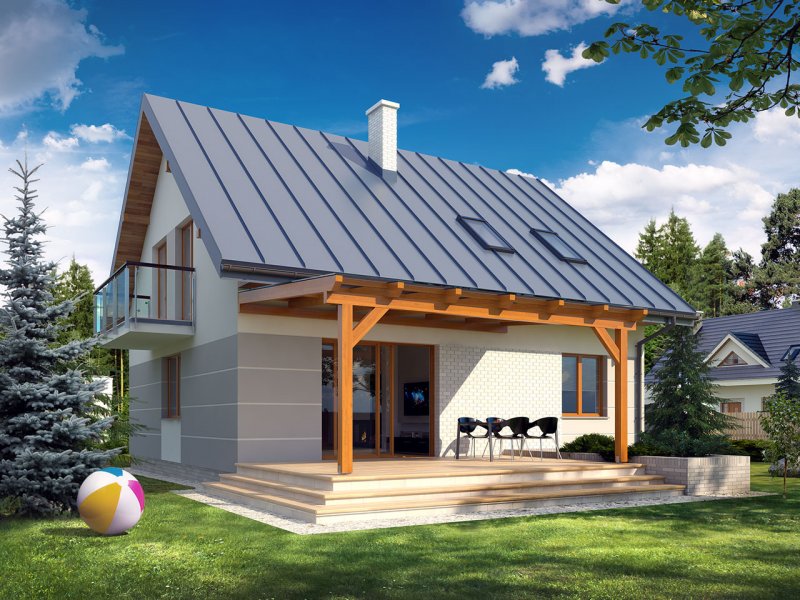Dom jednorodzinny, parterowy z użytkowym poddaszem, niepodpiwniczony. Posiada prostą bryłę przykrytą dwuspadowym dachem z lukarną od frontu. Wnętrze domu jest przestronne i pozwala na wiele aranżacji. Kuchnia może być otwarta na salon lub zamknięta - z wejściem z holu. Salon posiada duże przeszklenie z wyjściem na zadaszony taras. Kotłownia dostępna z wiatrołapu ma wielkość pozwalającą na zastosowanie również kotła na paliwo stałe. Poddasze zostało podzielone na 3 pokoje, dużą łazienkę i garderobę. Zastosowanie na całości poddasza ścian działowych pozwala na łatwe zmiany podziału pomieszczeń.