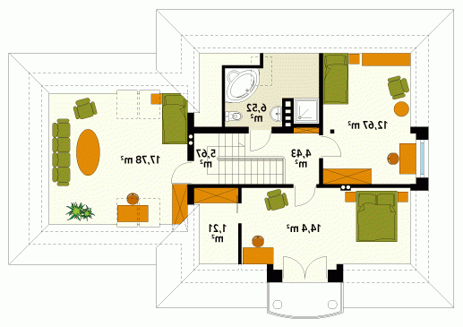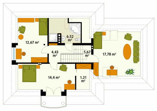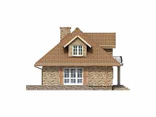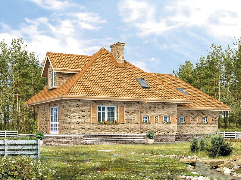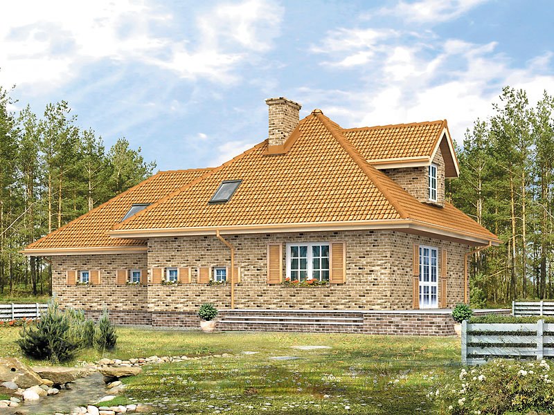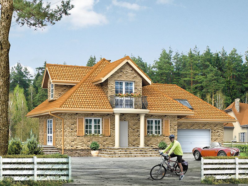 Dom jednorodzinny przeznaczony dla 4 – 5-osobowej rodziny. Parterowy z użytkowym poddaszem i dwustanowiskowym garażem. Dzięki zwartej bryle jest prosty w budowie. Na parterze zaprojektowano dodatkowy pokój – gabinet. Poddasze to strefa nocna domu. Znajdują się tam trzy sypialnie i łazienka.