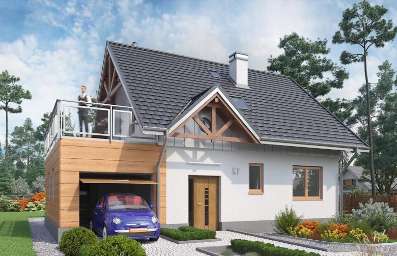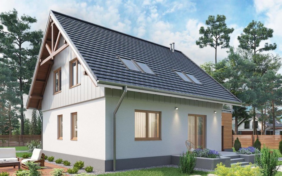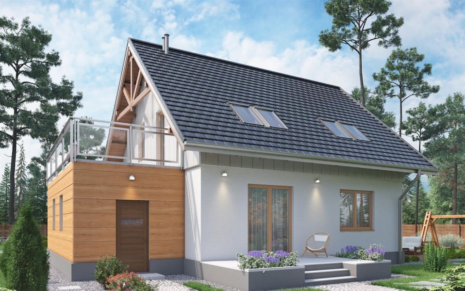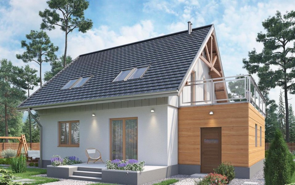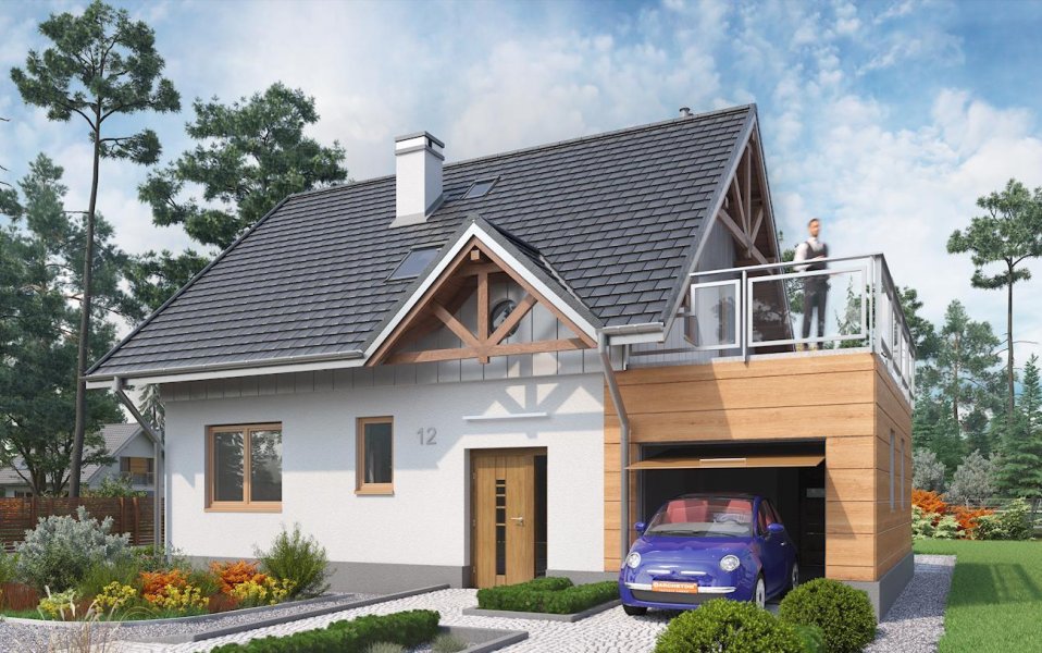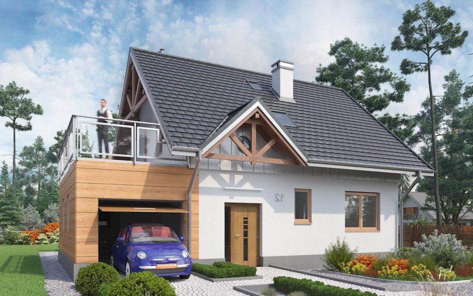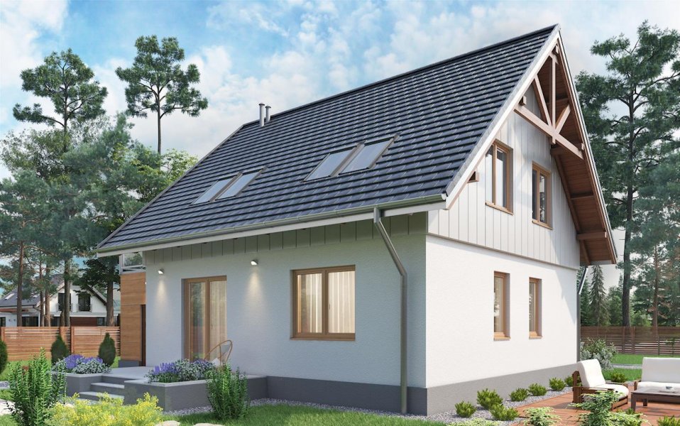 Jeśli w planach mamy budowę małego domu parterowego z użytkowym poddaszem i dobudowanym garażem, a przy tym marzy nam się wyjście w letni poranek z sypialni na taras, to projekt domu Brzask, Amelia100 i Figa Neo spełnią te oczekiwania. Wśród nich Brzask wyróżnia największy salon ale przy tym brak dodatkowego pokoju na parterze. Wszystkie propozycje mają zwarty, zbliżony do kwadratu rzut części mieszkalnej i niedrogi dwuspadowy dach z kalenicą równoległą do drogi dojazdowej. Zarys ścian zewnętrznych w projekcie domu Brzask jest najbardziej zdyscyplinowany i energooszczędny, bez balkonów. Kotłownię ulokowano za garażem, a przy bardzo dużej kuchni przewidziano zgrabny układ spiżarni i niewielkiej łazienki. Program strefy nocnej to trzy wygodne sypialnie dla czterech osób i przestronna łazienka – wszystkie pomieszczenia doświetlono ekonomicznie bez użycia lukarn. Frontowe wejście akcentuje trójkątny daszek w okapie odsłaniający dostęp światła dla okienka nad spocznikiem schodów. Wyjątkowym rozwiązaniem jest zlicowanie ściany frontowej części głównej i garażowej, co wydłuża elewację horyzontalnie i nadaje jej mniej tradycyjny charakter.