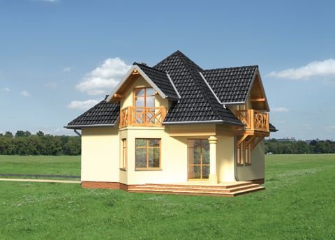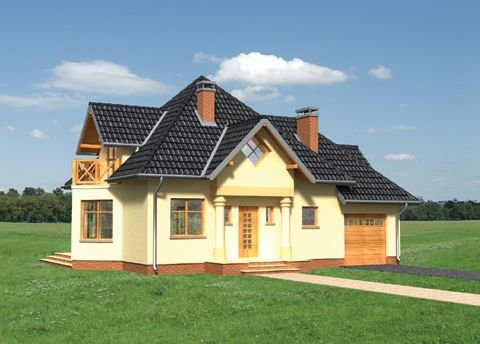 Wejście przez sień do holu. Z holu na wprost wejście do pokoju dziennego, na lewo wejście do kuchni i jadalni, na prawo w.c. Na poddaszu zlokalizowano 4 pokoje sypialne, łazienkę i garderobę. Garaż dostępny z poziomu terenu. Dom na rzucie zbliżonym do kwadratu, nakryty dachem kopertowym z dostawioną bryłą garażu. Kąt nachylenia połaci dachu 45°. Charakterystyczne wysunięcie ścian jadalni połączone z podcieniem nad tarasem. Malownicze lukarny i portyk wejściowy.