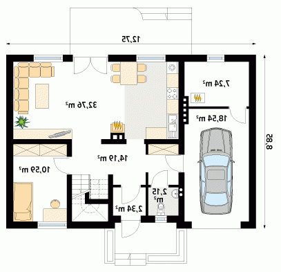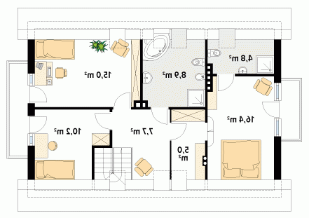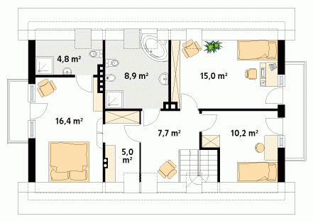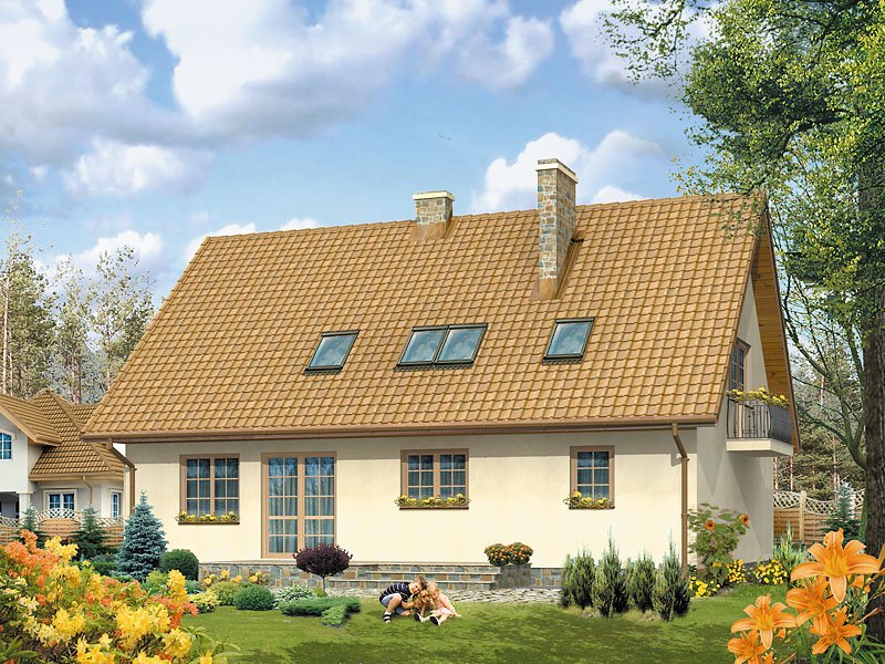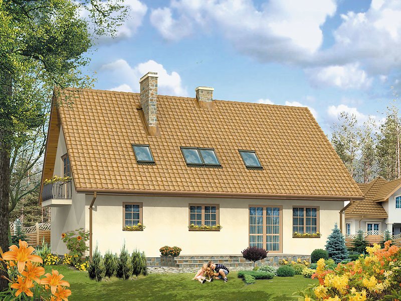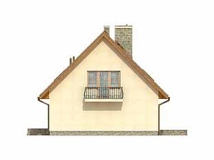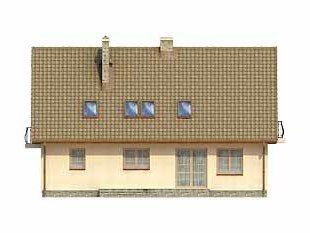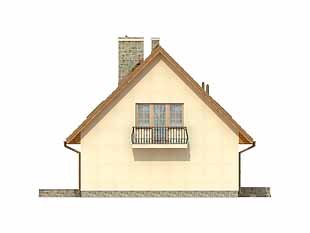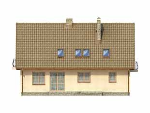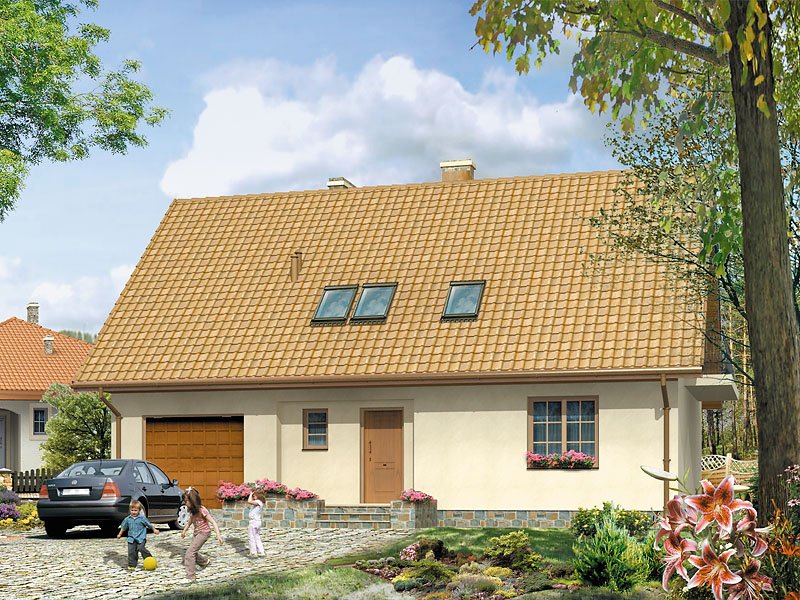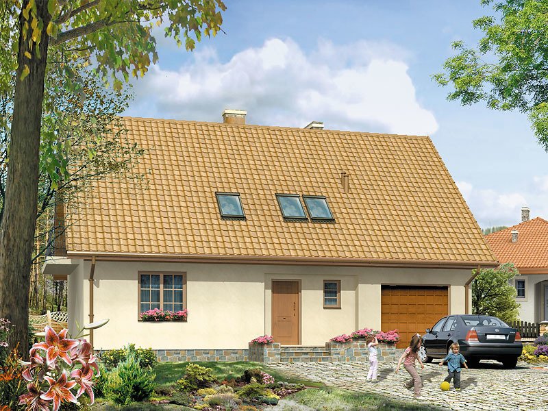 Dom parterowy z poddaszem użytkowym. Prosta, tradycyjna bryła. Kuchnia umieszczona od strony ogrodu, połączona z pokojem dziennym. Na poddaszu w sypialni rodziców, oprócz dużej garderoby, znajduje się osobna łazienka.