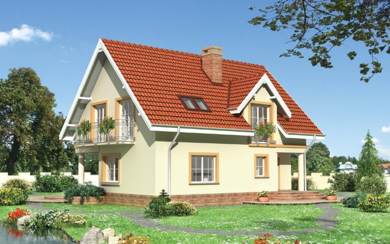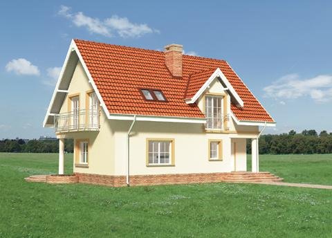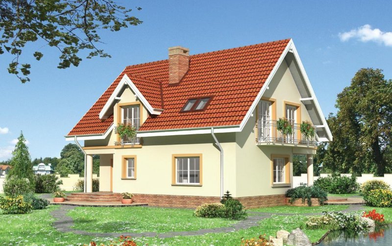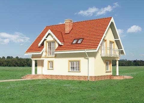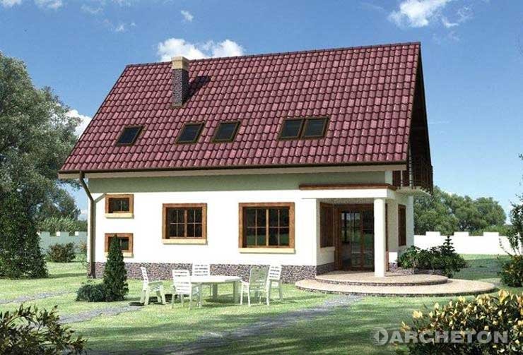 Przez podcień wejściowy wchodzimy do sieni skąd dostępna jest kotłownia. Z sieni - do holu gdzie na wprost usytuowano klatkę schodową prowadzącą na poddasze, oraz pomieszczenie gospodarcze - pod schodami. Idąc holem w stronę pokoju dziennego mijamy kuchnię i w.c. Do pokoju dziennego przylega jadalnia połączona z kuchnią. Jadalnia i pokój dzienny są posadowione niżej o dwa stopnie w stosunku do innych pomieszczeń parteru. W obrębie poddasza zlokalizowano 3 pokoje sypialne i 2 łazienki. Jedna z łazienek dostępna jest tylko z sypialni rodziców. Bryłę tworzy prostopadłościan nakryty dachem dwuspadowym o kącie nachylenia połaci 45° z lukarną od frontu. Charakterystycznego wyglądu nadaje podcień wejściowy i tarasowy wsparty na okrągłych słupach oraz balkon dostępny z 2 pokoi sypialnych. Miękka linia schodów zewnętrznych nadaje dodatkowego uroku.