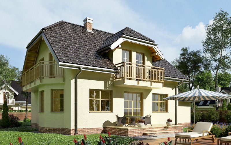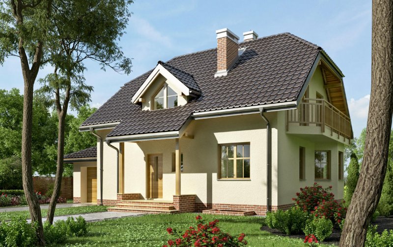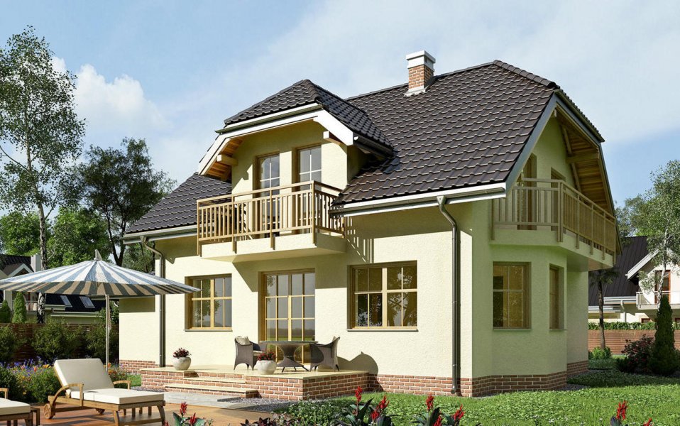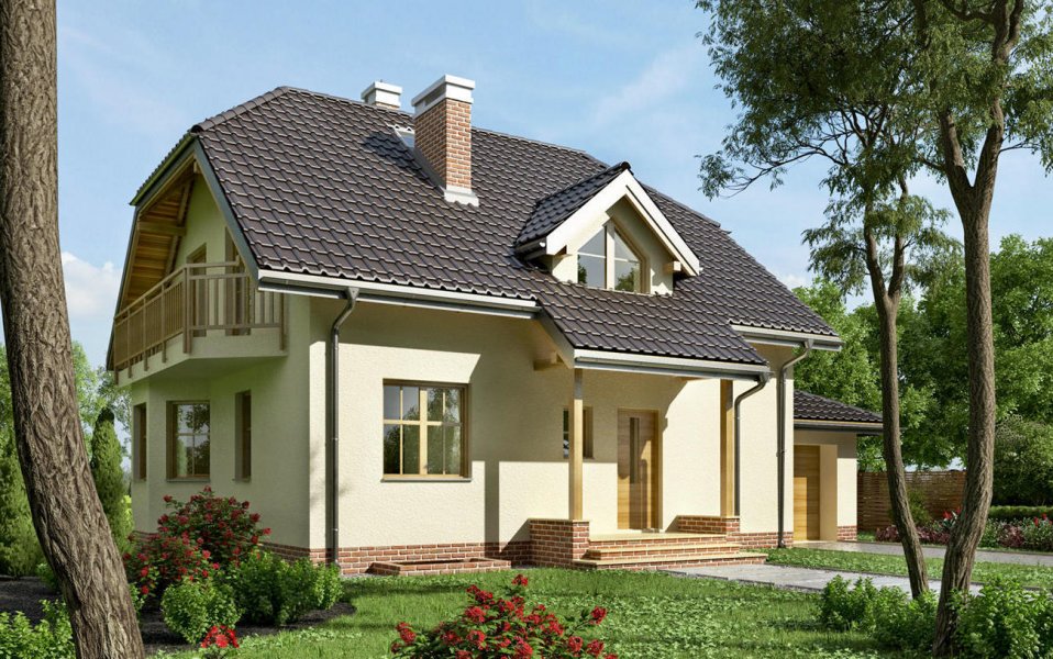 Wejście do budynku przez sień do holu, skąd na wprost można wejść do pokoju dziennego otwartego przestrzennie na kuchnię. Z holu dostępne są również łazienka i dodatkowy pokój, a także schody prowadzące do piwnicy i na poddasze. W piwnicy znalazła miejsce kotłownia i pomieszczenie gospodarcze. Na poddaszu zlokalizowano: 3 sypialnie i łazienkę. Garaż dostępny jest jedynie z zewnątrz. Budynek uzyskał ciekawą formę dzięki zastosowaniu dachu dwuspadowego (40°) oraz dostawieniu bryły garażu z dachem trzyspadowym (25°). Budynek rozbudowano wykuszem pokoju dziennego, balkonem i lukarnami dachu głównego.
