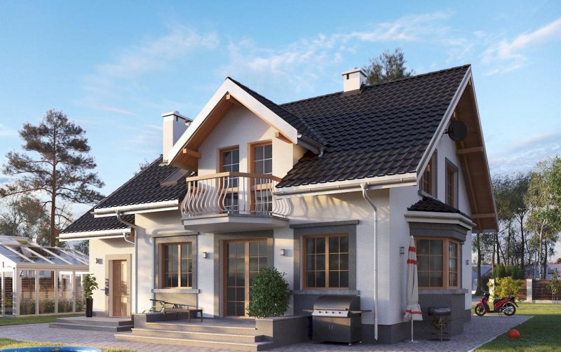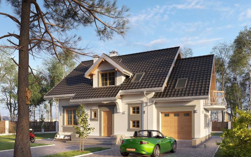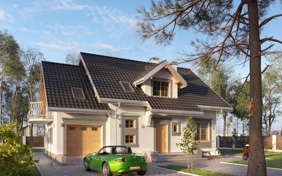 Rodzina Celesty to grupa projektów małych i średnich domów parterowych z użytkowym poddaszem i z dostawionym garażem, przypominających nieco rozwiązania z rodzin: Zoi czy Chabra. Charakterystyczny ryzalit w ścianie bocznej przesunięto tu jednak w głąb posesji, a ulokowana w nim jadalnia stała się wyraźnie częścią salonu. Projekt domu Celesta Prima Lux jest jednym z większych w rodzinie, zachowując ten sam program funkcjonalny i kształt planu. Środkiem rzutu części mieszkalnej biegnie ściana nośna, tradycyjnie oddzielając front z kuchnią, sienią, łazienką i schodami ze schowkiem od salonu z dodatkowym pokojem. Poddasze ma cztery wygodne pokoje i zgrabny przedpokój z łazienką. Sypialnia główna znajduje się nieco niżej, nad częścią gospodarczą z kotłownią i oferuje miejsce na garderobę. Projekt domu Celesta Prima Lux jest jednym z trzech wariantów bez balkonu w drugiej ścianie bocznej. Tak jak w wersji Bona i Lux ryzalit jadalni wieńczy fantazyjny daszek. Całą bryłę przekryto osobnymi dwuspadowymi dachami z kalenicami równoległymi do drogi dojazdowej. Lukarny głównego dachu w obu połaciach i przedłużony częściowo okap od frontu przypominają sylwetkę Zoi.