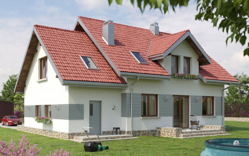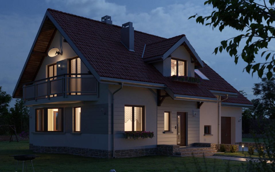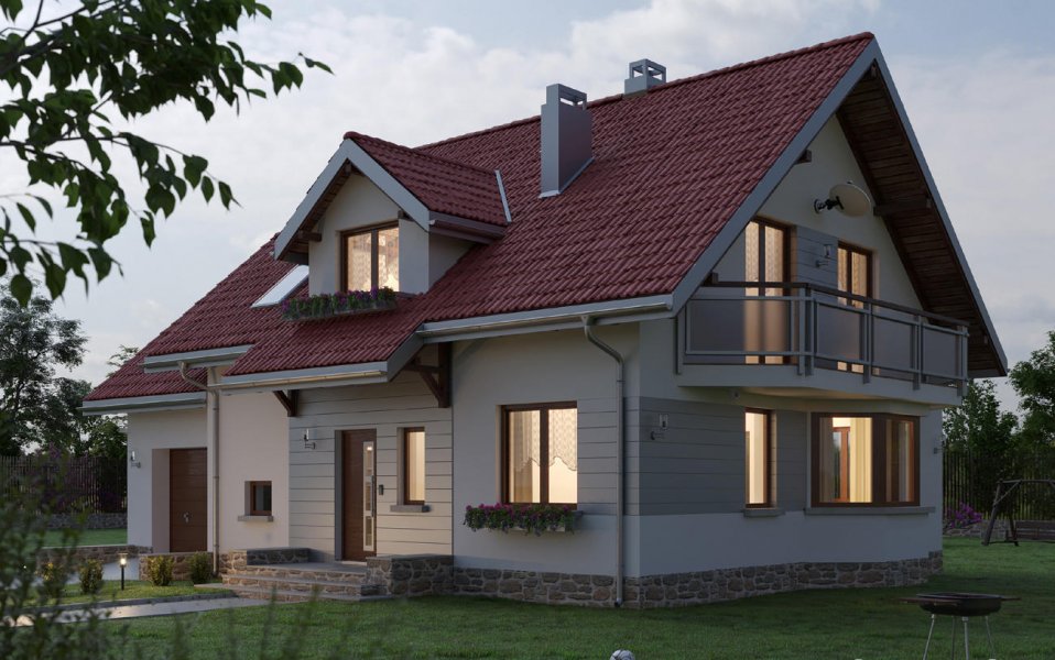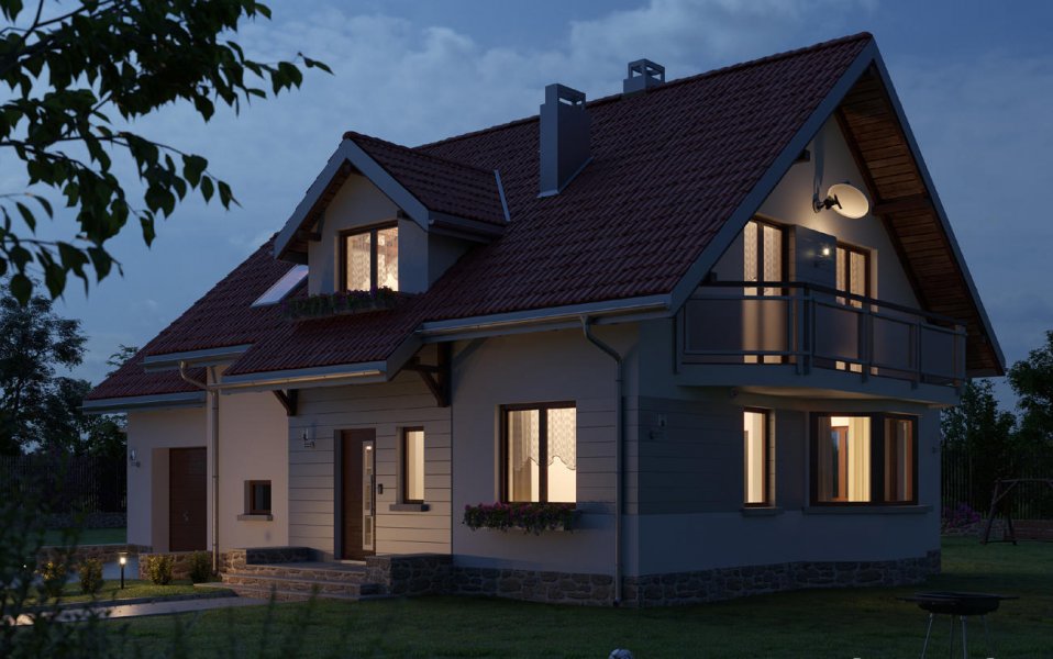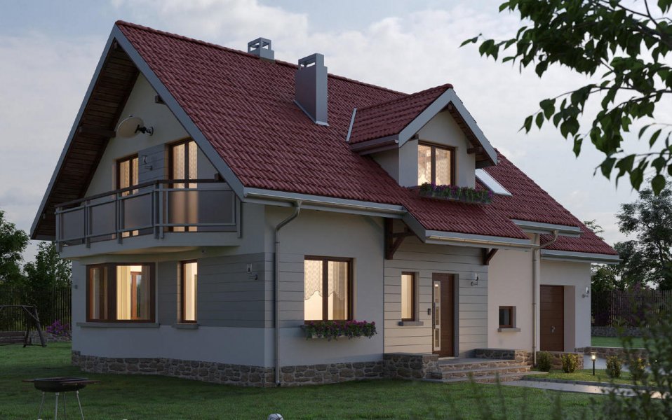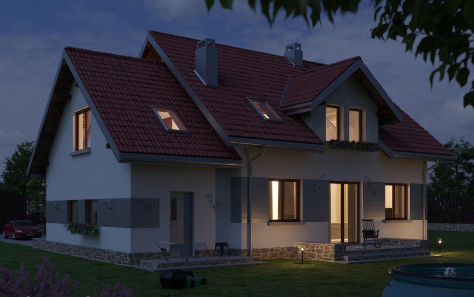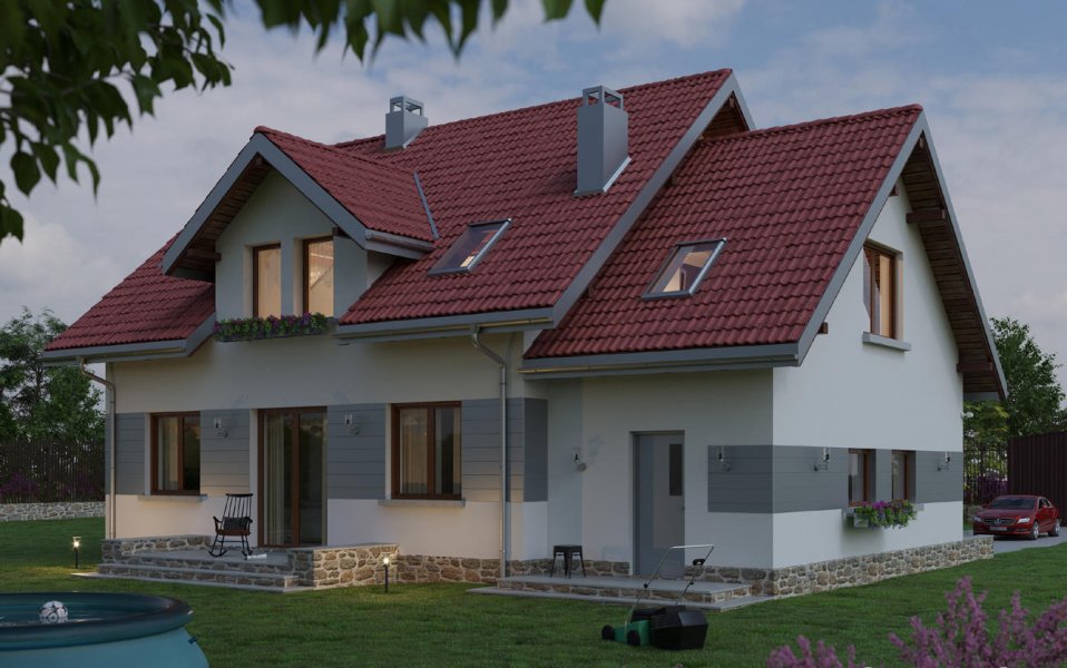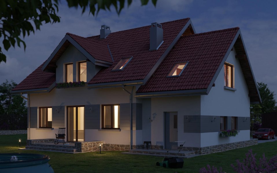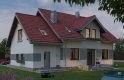 Rodzina Celesty grupuje projekty domów parterowych z użytkowym poddaszem i z dostawionym garażem. Przypominają one nieco rozwiązania z rodzin: Zoi, Zofii i Heleny czy Chabra ale charakterystyczny ryzalit z balkonem w ścianie bocznej został zsunięty z jej osi symetrii ku ogrodowi, a ulokowana w nim jadalnia stała się wyraźniej częścią salonu. Projekt domu Celesta Rex jest jednym z większych w rodzinie, przy tym samym programie funkcjonalnym, zbliżonym obrysie planu oraz z tradycyjnie zamkniętymi pomieszczeniami parteru. Środkiem rzutu części mieszkalnej biegnie ściana nośna zamykając od frontu kuchnię, sień, łazienkę i schody ze schowkiem pod podestem oraz salon z dodatkowym pokojem od ogrodu. Poddasze oferuje cztery wygodne pokoje i zgrabny przedpokój z łazienką. W projekcie domu Celesta Rex, jak w we wszystkich rodzinnych wariantach, bryłę podzielono na wyższą część mieszkalną i nieco niższą – garażową. Przekryto je osobnymi dwuspadowymi dachami z kalenicą równoległą do drogi dojazdowej. Lukarny w dachu po obu stronach kalenicy i przedłużony częściowo okap nad wejściem frontowym nawiązują do sylwetki Zoi.