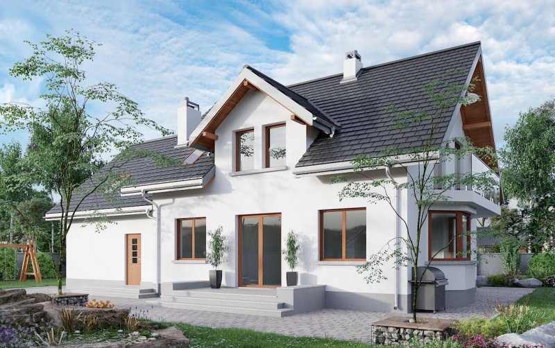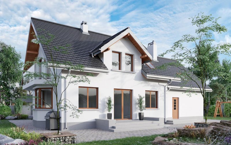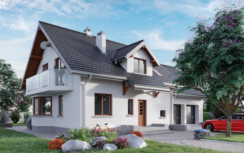 Rodzina Celesty to grupa projektów małych i średnich domów parterowych z użytkowym poddaszem i z garażem, przypominających nieco rozwiązania z rodzin: Zoi czy Chabra. Charakterystyczny ryzalit z balkonem w ścianie bocznej przesunięto tu jednak w głąb posesji, a ulokowana w nim jadalnia stała się wyraźnie częścią salonu. Projekt domu Celesta Rex G2 jest jednym z największych w rodzinie, przy tym samym programie funkcjonalnym i obrysie planu. Środkiem rzutu części mieszkalnej biegnie ściana nośna tradycyjnie oddzielając od frontu kuchnię, sień, łazienkę i schody ze schowkiem oraz salon z dodatkowym pokojem od ogrodu. Poddasze ma cztery wygodne pokoje i zgrabny przedpokój z łazienką. W stosunku do rozwiązania Celesty Rex dodano tu drugie stanowisko garażowe; poddasze w niższej części gospodarczej zyskało tym samym dodatkową powierzchnię. Całość przekryto osobnymi dwuspadowymi dachami z kalenicą równoległą do drogi dojazdowej. Lukarny w dachu w obu połaciach i przedłużony częściowo okap nad wejściem nawiązują do sylwetki Zoi. Powiększając bryłę garażową w projekcie domu Celesta Rex G2, zaproponowano też alternatywną konstrukcję ścian zewnętrznych.