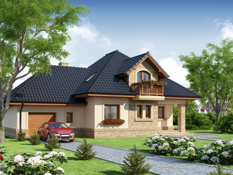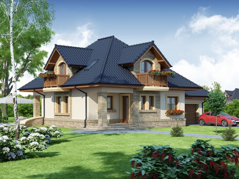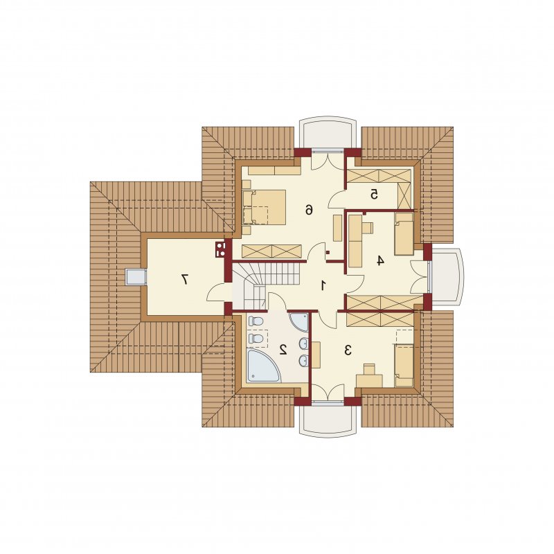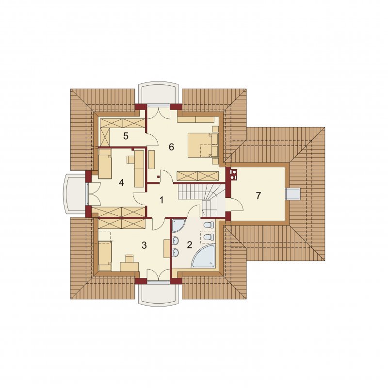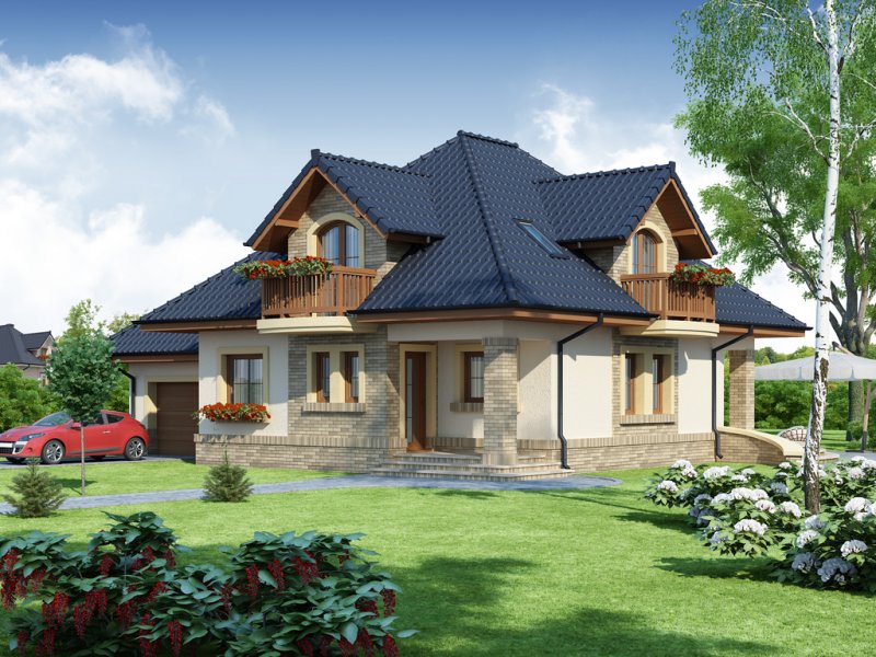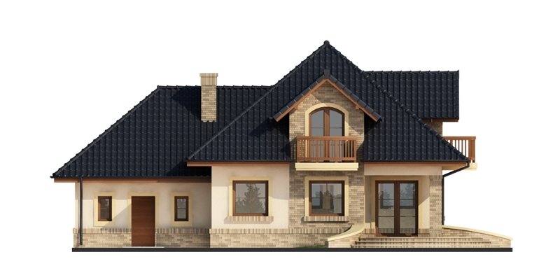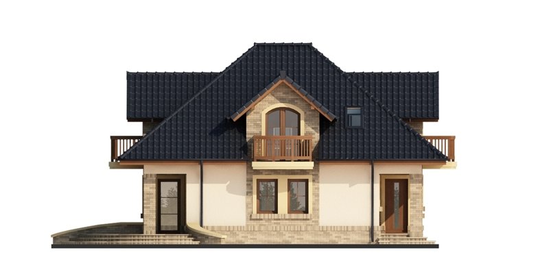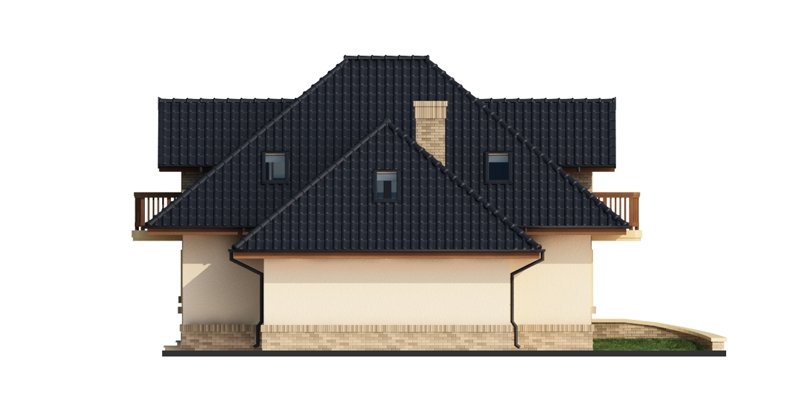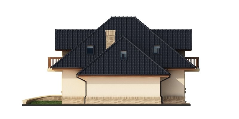 Damokles jest domem zaprojektowanym dla 4/5-osobowej rodziny. Dzięki swojej klasycznej formie łatwo wpisuje się w otaczającą zabudowę. Minąwszy zadaszoną strefę wejściową oraz wiatrołap z pojemną szafą wnękową, wkraczamy do części dziennej budynku. Otwarta jasna przestrzeń z widokiem na ogród i częściowo przekryty taras składa się na przestronny salon z kominkiem, oraz jadalnię i kuchnię, przedzielone barkiem. Kuchnię zaprojektowaną jako otwartą można z łatwością przekształcić w zamkniętą, dzięki zastosowaniu ścianki działowej. Usytuowanie dodatkowego pokoju w pobliżu strefy wejściowej jest praktycznym rozwiązaniem szczególnie w przypadku użytkowania go jako gabinetu, czy pokoju gościnnego. Jest możliwość powiększenia go kosztem wiatrołapu, bądź uzyskania dodatkowego miejsca na szafę w wiatrołapie, redukując z kolei powierzchnię pokoju. Część gospodarczą stanowi kotłownia, z wejściem od strony mieszkalnej i garażu oraz sam jednostanowiskowy garaż, do którego dostać się można zarówno z części mieszkalnej, od frontu domu jak i od strony ogrodowej. Całość poddasza to strefa nocna. Znajdują się tu trzy sypialnie, każda z wyjściem na indywidualny balkon. Największa z sypialni ma dodatkowo dostęp do osobnej garderoby. Jest możliwość zaadaptowania części nieużytkowej – strychu na powierzchnię użytkową i zastosowania jej jako dodatkową sypialnię czy pokój hobby.