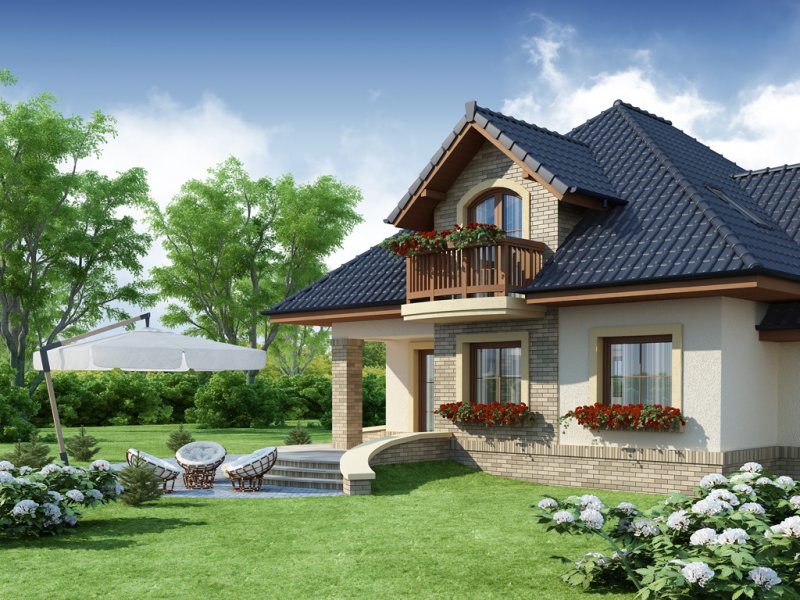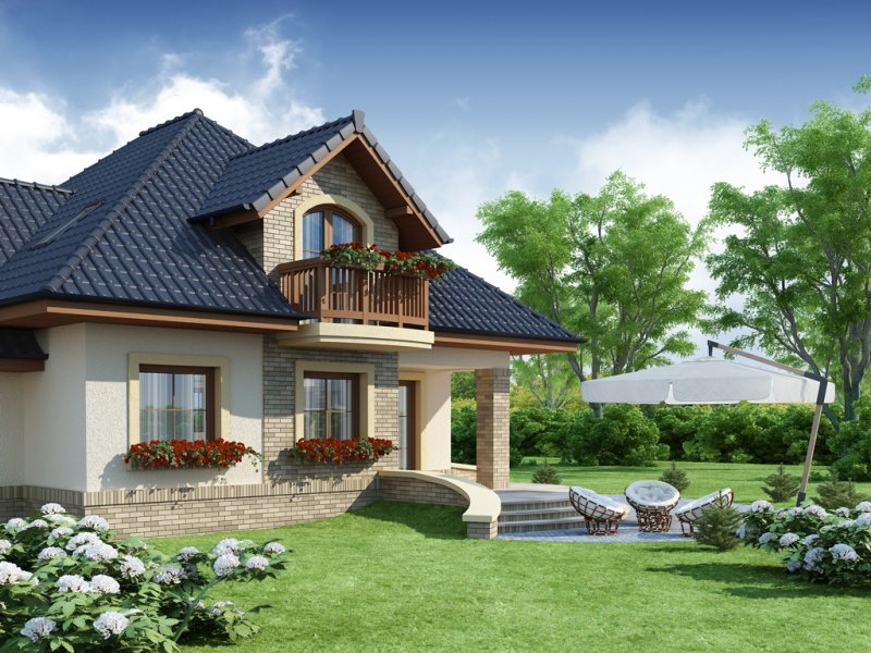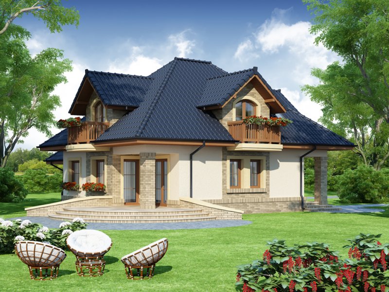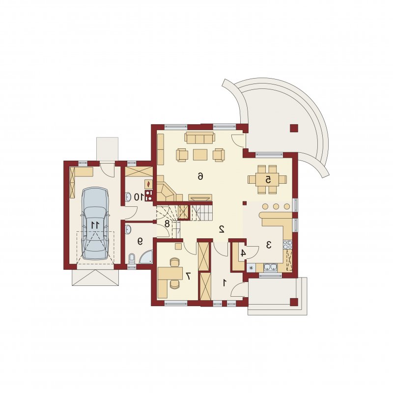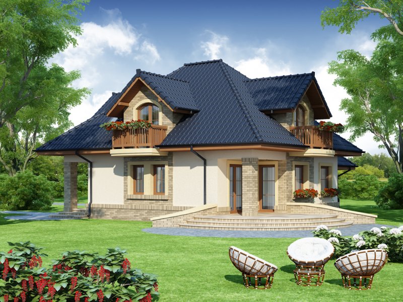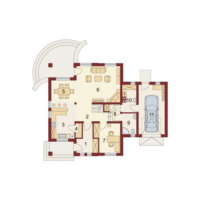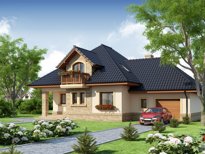Damokles jest domem zaprojektowanym dla 4/5-osobowej rodziny. Dzięki swojej klasycznej formie łatwo wpisuje się w otaczającą zabudowę. Minąwszy zadaszoną strefę wejściową oraz wiatrołap z pojemną szafą wnękową, wkraczamy do części dziennej budynku. Otwarta jasna przestrzeń z widokiem na ogród i częściowo przekryty taras składa się na przestronny salon z kominkiem, oraz jadalnię i kuchnię, przedzielone barkiem. Kuchnię zaprojektowaną jako otwartą można z łatwością przekształcić w zamkniętą, dzięki zastosowaniu ścianki działowej. Usytuowanie dodatkowego pokoju w pobliżu strefy wejściowej jest praktycznym rozwiązaniem szczególnie w przypadku użytkowania go jako gabinetu, czy pokoju gościnnego. Jest możliwość powiększenia go kosztem wiatrołapu, bądź uzyskania dodatkowego miejsca na szafę w wiatrołapie, redukując z kolei powierzchnię pokoju. Część gospodarczą stanowi kotłownia, z wejściem od strony mieszkalnej i garażu oraz sam jednostanowiskowy garaż, do którego dostać się można zarówno z części mieszkalnej, od frontu domu jak i od strony ogrodowej. Całość poddasza to strefa nocna. Znajdują się tu trzy sypialnie, każda z wyjściem na indywidualny balkon. Największa z sypialni ma dodatkowo dostęp do osobnej garderoby. Jest możliwość zaadaptowania części nieużytkowej – strychu na powierzchnię użytkową i zastosowania jej jako dodatkową sypialnię czy pokój hobby.