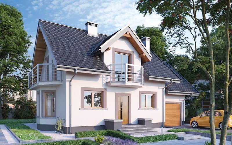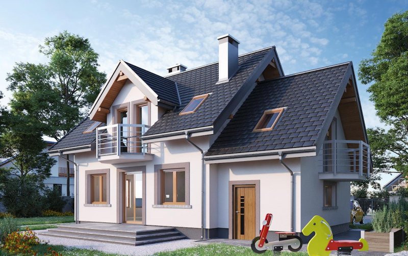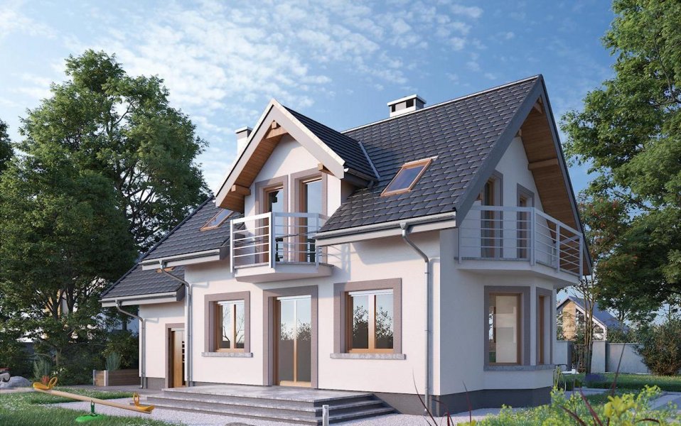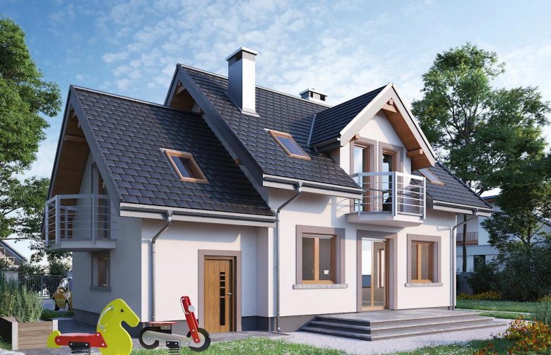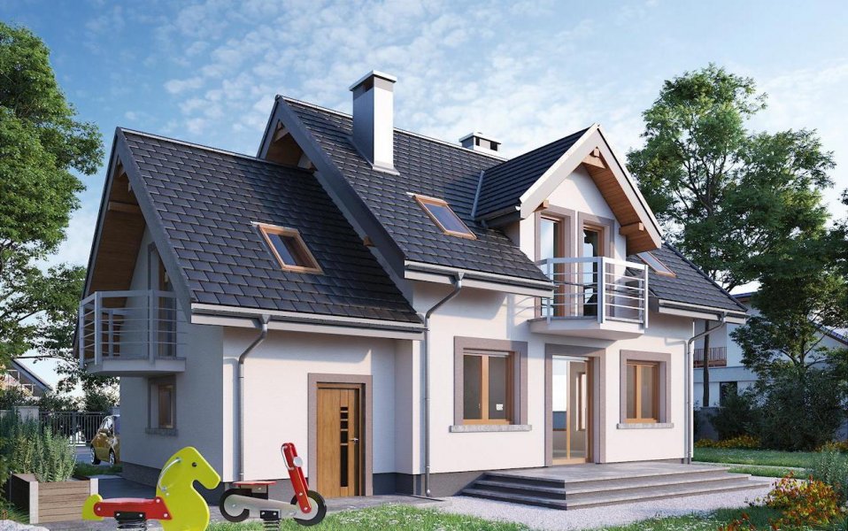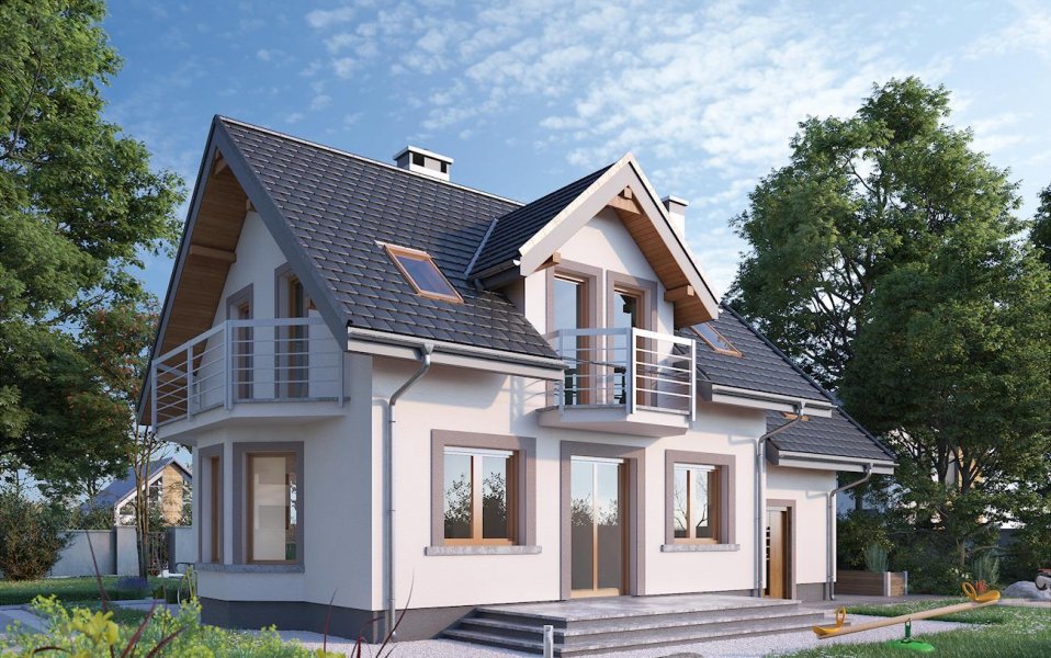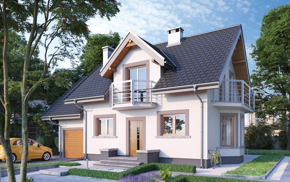 Dobudowany do części mieszkalnej garaż może być wykorzystywany jako podstawa dużego tarasu lub dodatkowej powierzchni poddasza użytkowego. Projekt domu Dario oferuje tę drugą możliwość, a wśród podobnych koncepcji o powierzchni użytkowej ok. 90m2 wyróżniają go tradycyjne detale. Są nimi: ryzalit jadalni w ścianie bocznej, symetrycznie rozmieszczone lukarny w dwuspadowym dachu nad wejściem i tarasem ogrodowym oraz wieloboczne, dekoracyjne balkony. Stosunkowo przestronna strefa dzienna zaproponowana w kompaktowej bryle nie pozostawia miejsca na dodatkowy pokój na parterze, jak w podobnym wielkością Samborze Neo. Jego miejsce zajmuje spora kotłownia dostępna z garażu. Otwarty pokój dzienny z kuchnią zajmuje większość parteru, rozplanowanego wokół centralnie położonego kominka i schodów. Program funkcjonalny dolnej kondygnacji uzupełnia wygodna, jasna łazienka w strefie wejścia. Mimo skromnych rozmiarów projekt domu Dario oferuje na poddaszu bardzo wygodne sypialnie. Dwie z nich mają garderobę, a ogólnie dostępna łazienka jest duża i ustawna.