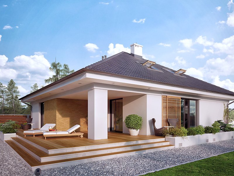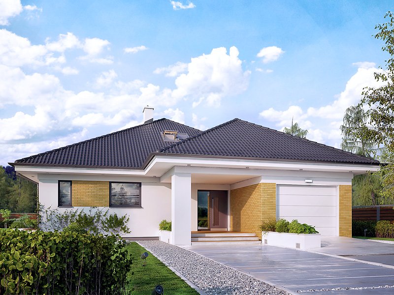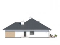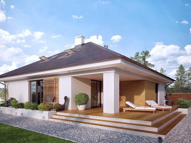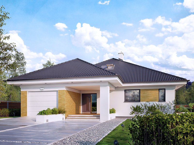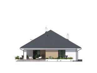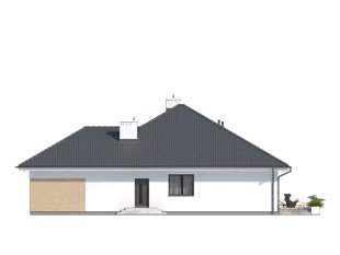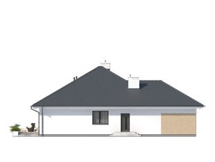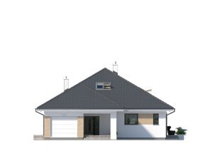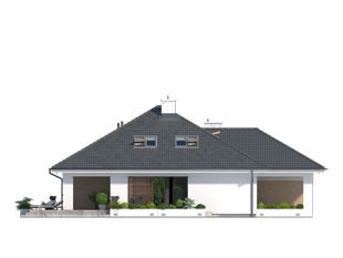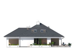 Jednorodzinny budynek mieszkalny, parterowy z użytkowym poddaszem, niepodpiwniczony, przeznaczony dla 4 - 5-osobowej rodziny. W części dziennej przewidziano salon z kominkiem oraz kuchnię z jadalnią. W części nocnej parteru - dwie sypialnie z łazienką, zaś w gospodarczej garaż i kotłownię. Na poddaszu zaprojektowano dwie duże sypialnie i łazienkę. Elewacje budynku są utrzymane w nowoczesnej stylistyce. Rozległe tarasy harmonijnie łączą wnętrza domu z ogrodem.